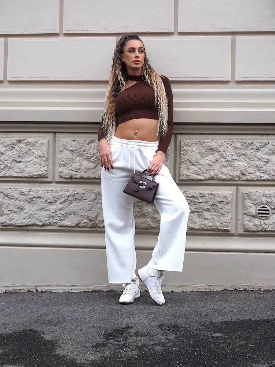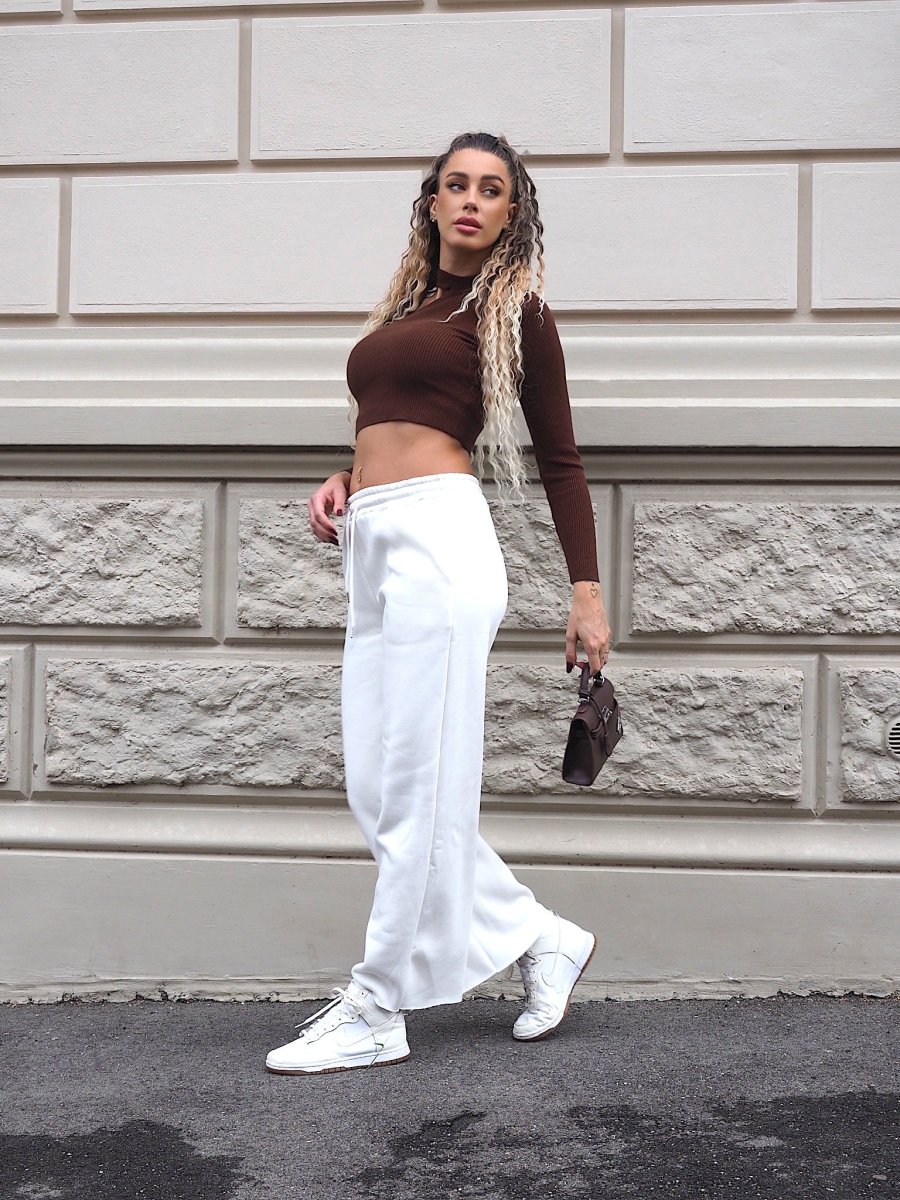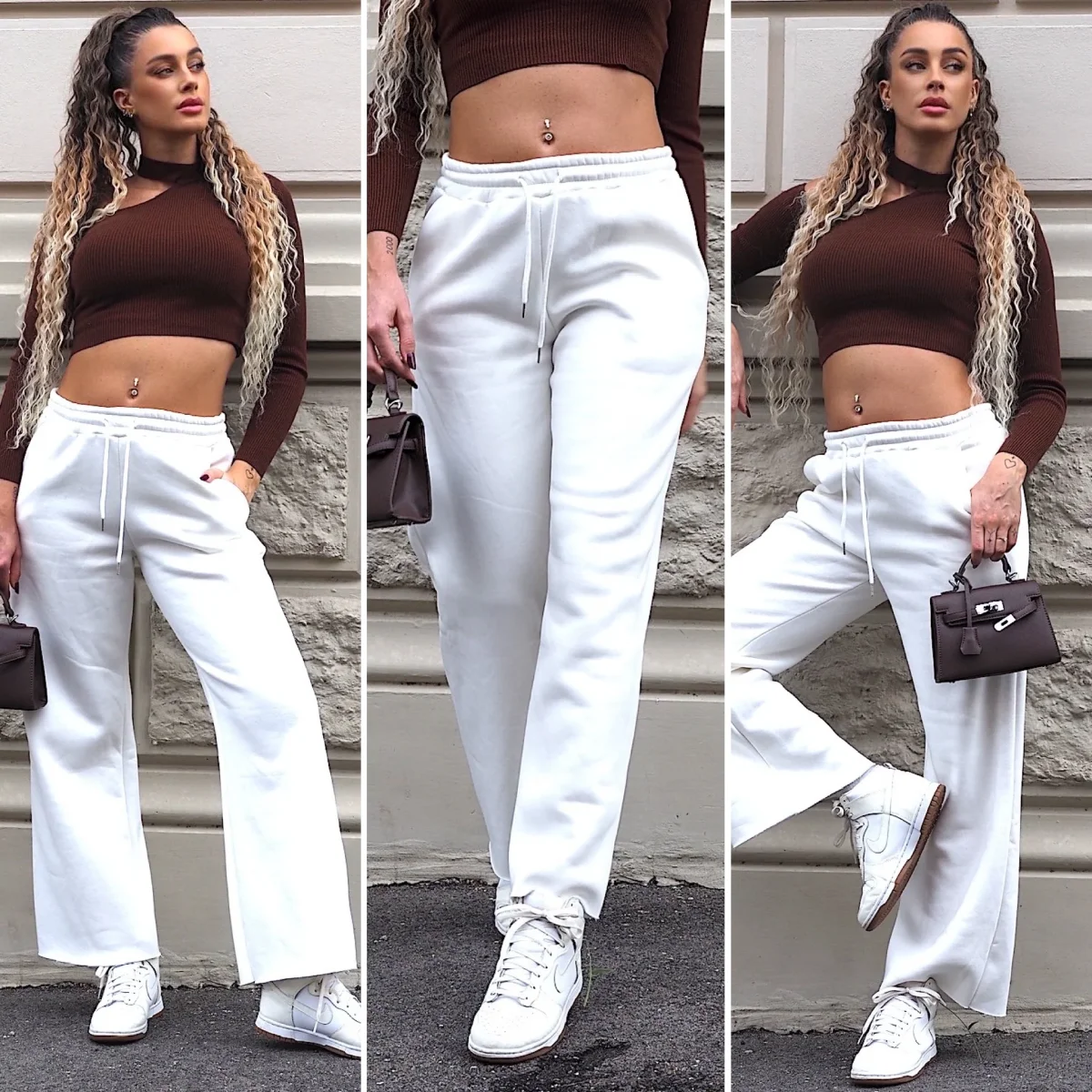 Pantatuta elasticizzato bianco con elastico in vita e laccetto, felpato all’interno. Modello a zampa