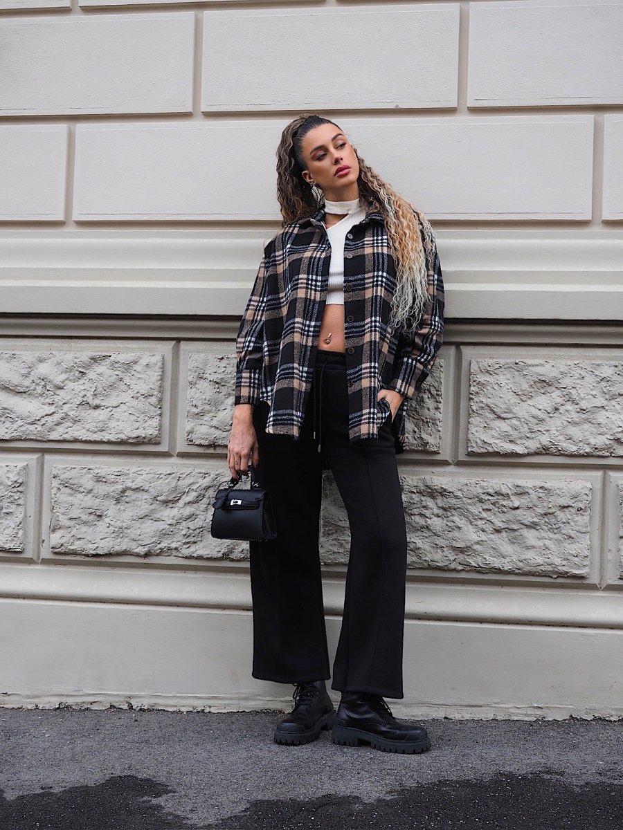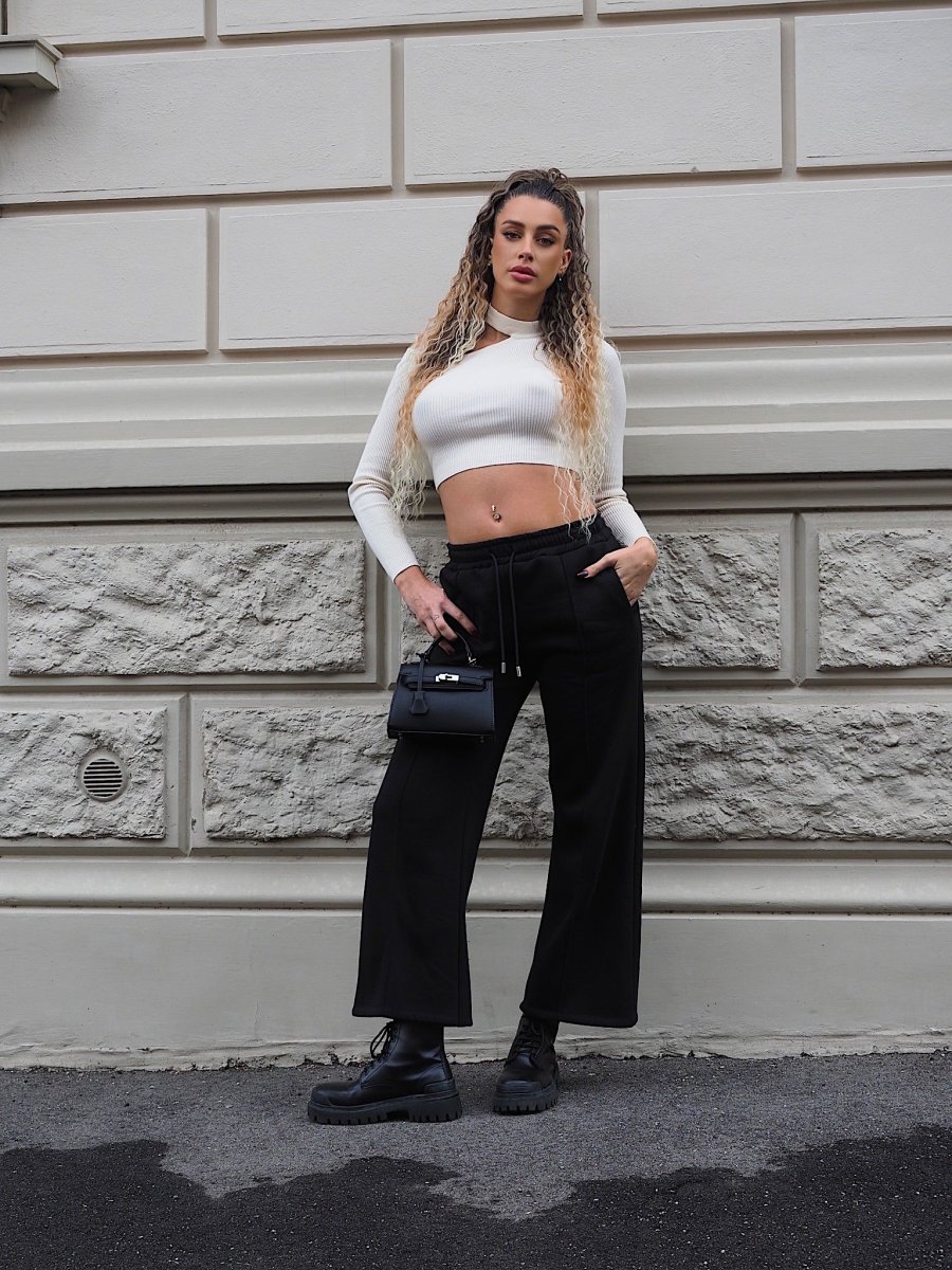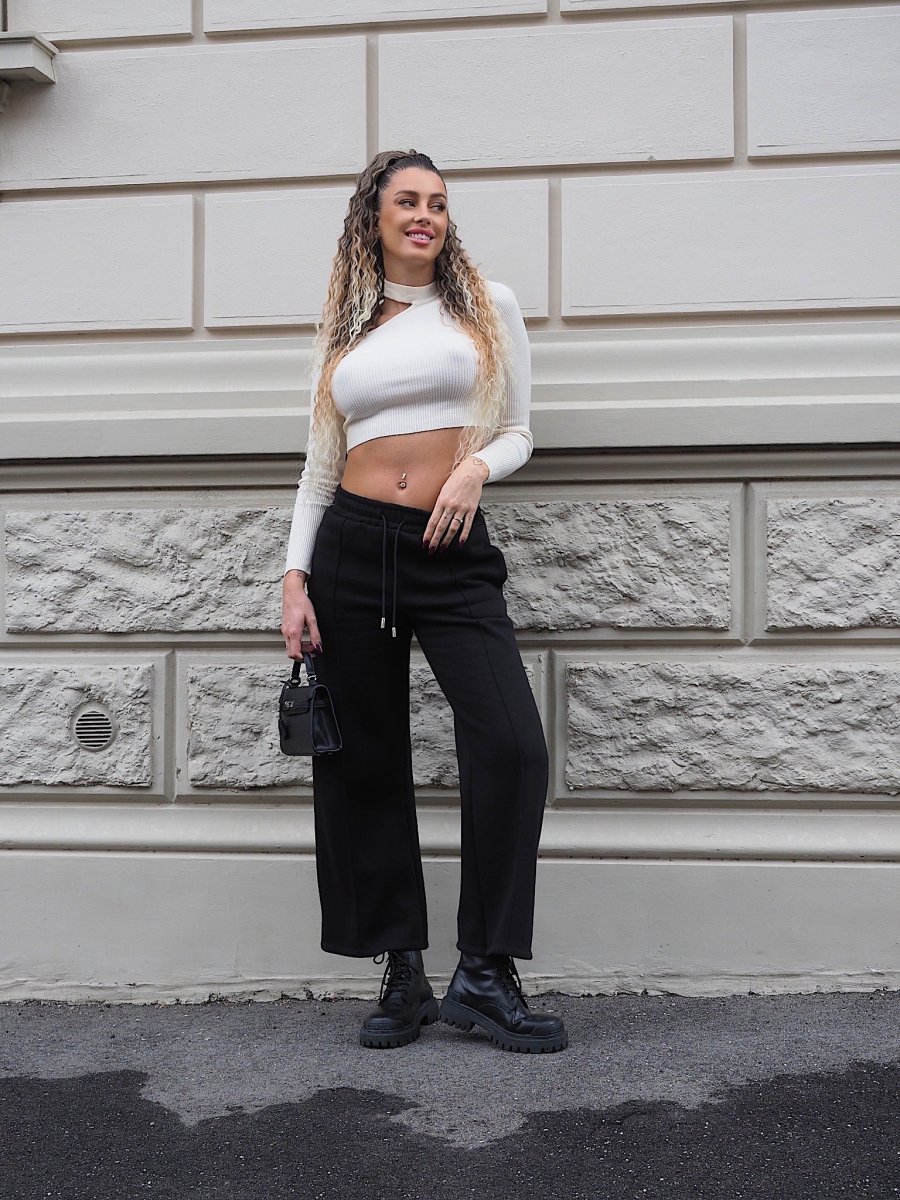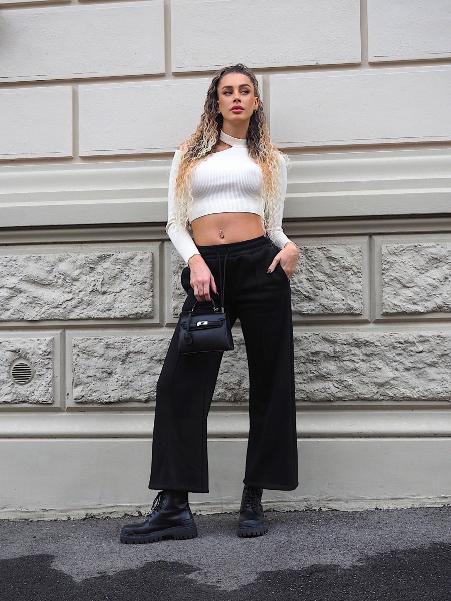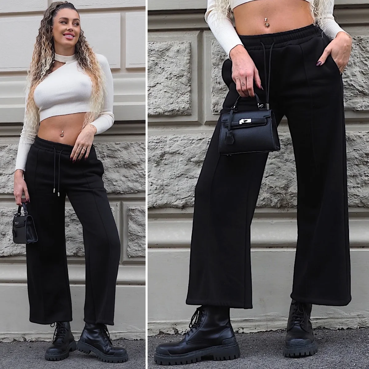 Pantatuta elasticizzato con elastico in vita e laccetto, felpato all’interno. Modello a zampa
