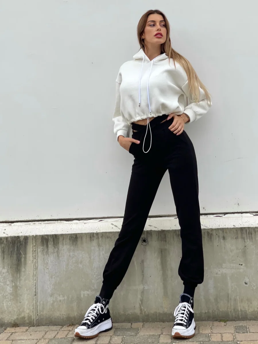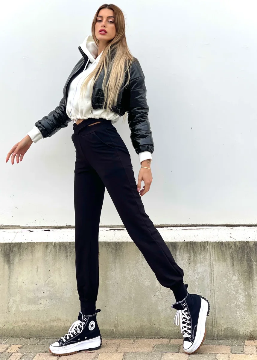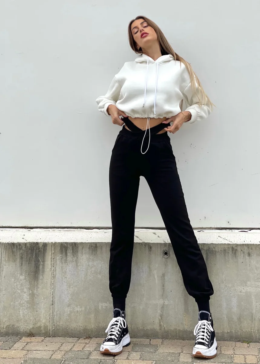 Tuta nera felpata con particolare elastico in vita a forma di X. Taglia unica elasticizzato