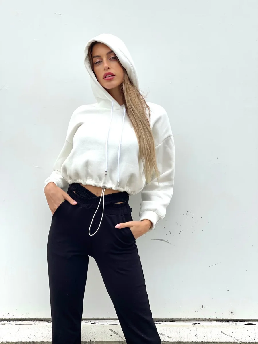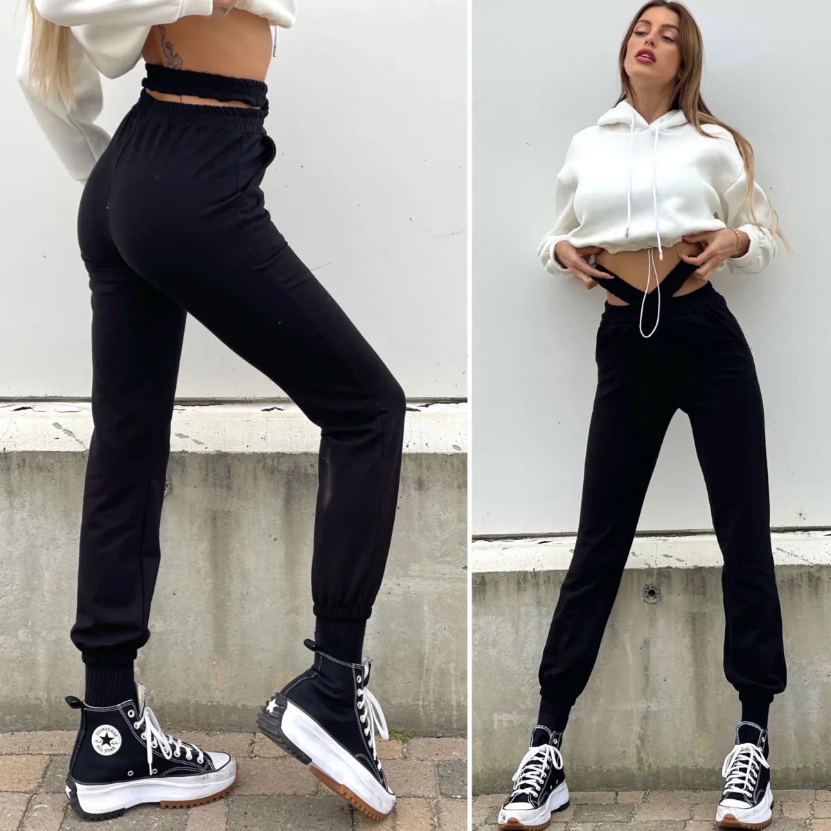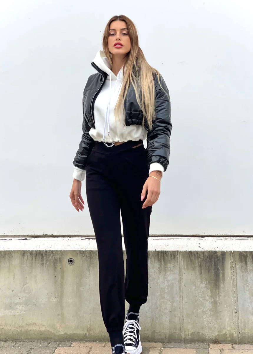 Tuta nera felpata con particolare elastico in vita a forma di X. Taglia unica elasticizzato
