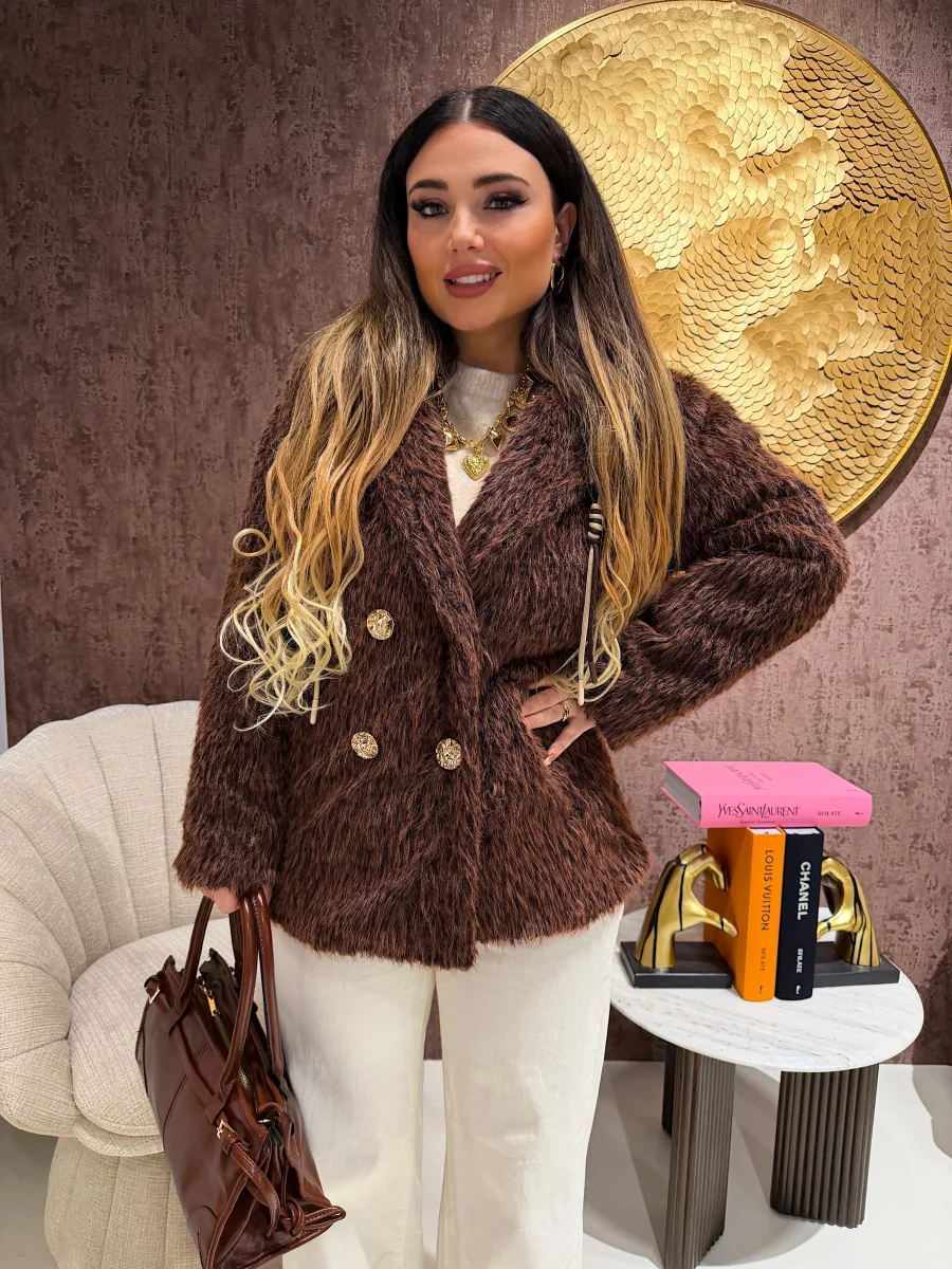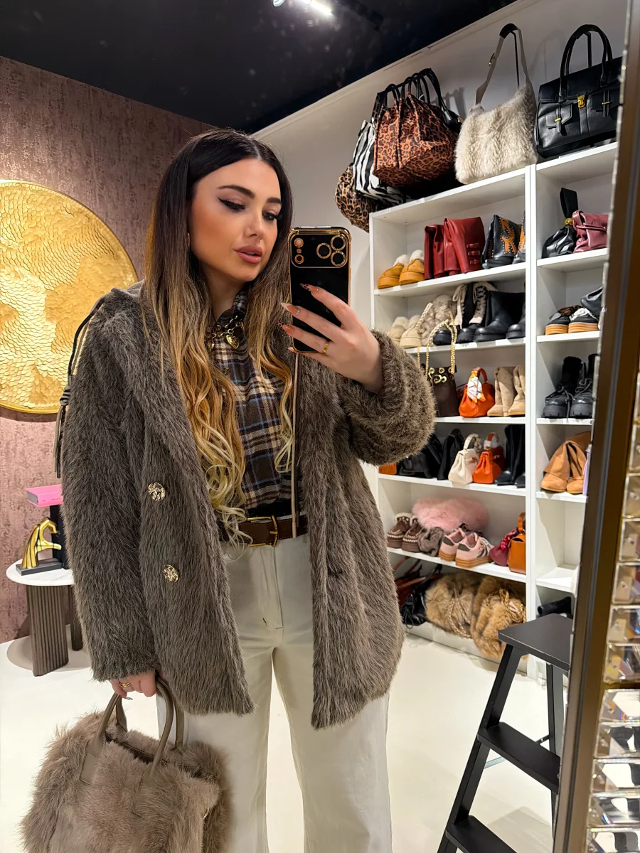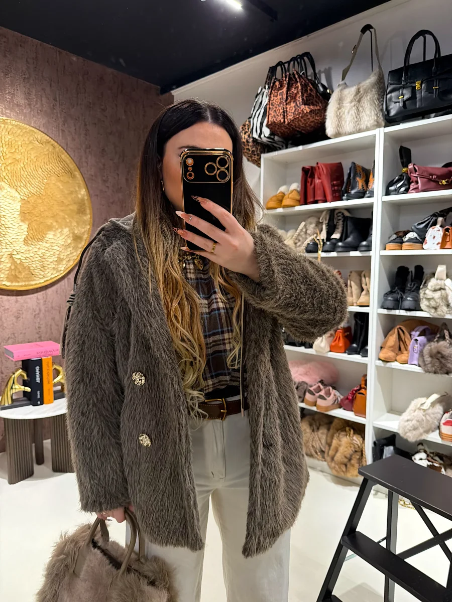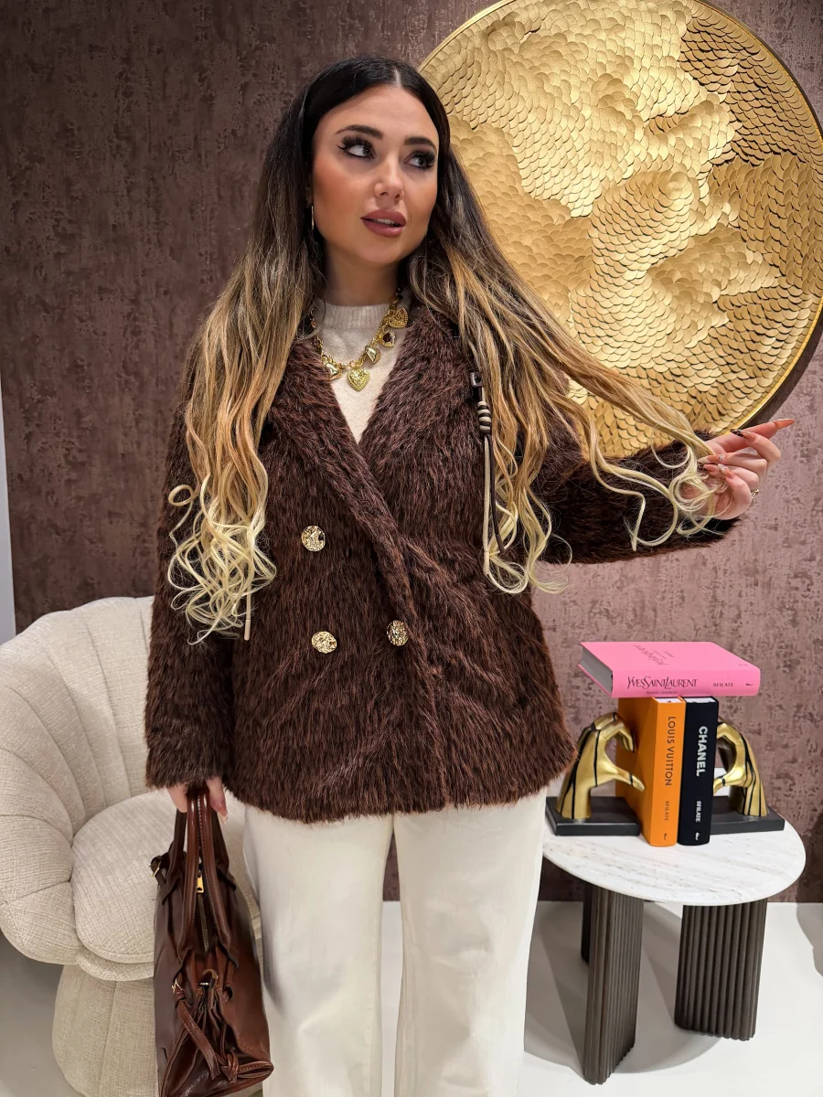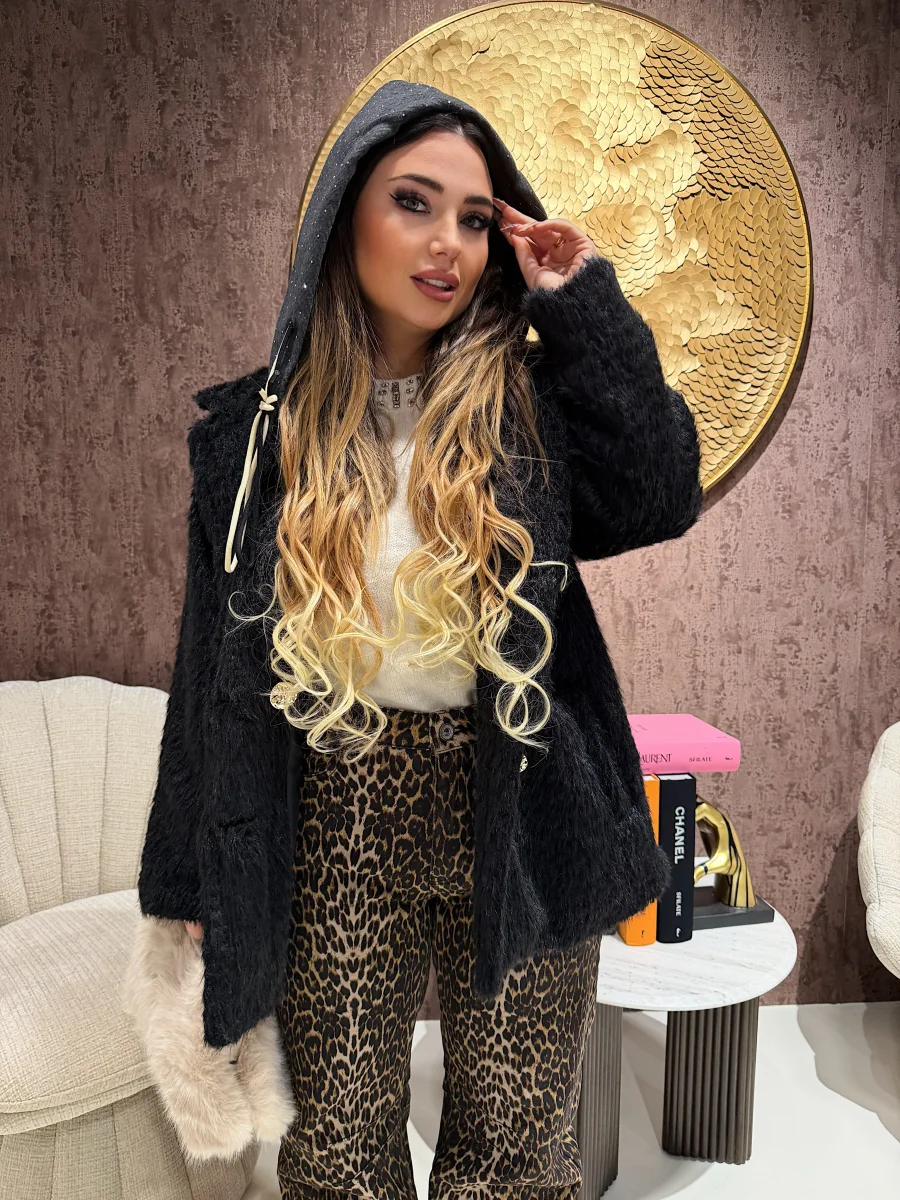 Pelliccia con bottoni gioiello foderata con cappuccio rimovibile
