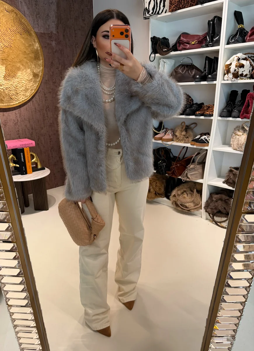 La pelliccia Ice è il capo must-have dell’inverno: morbida, avvolgente e super chic. Realizzata in eco-pelliccia dal tono blu-grigio ghiaccio, regala subito un effetto luminoso e sofisticato che cattura ogni sguardo.