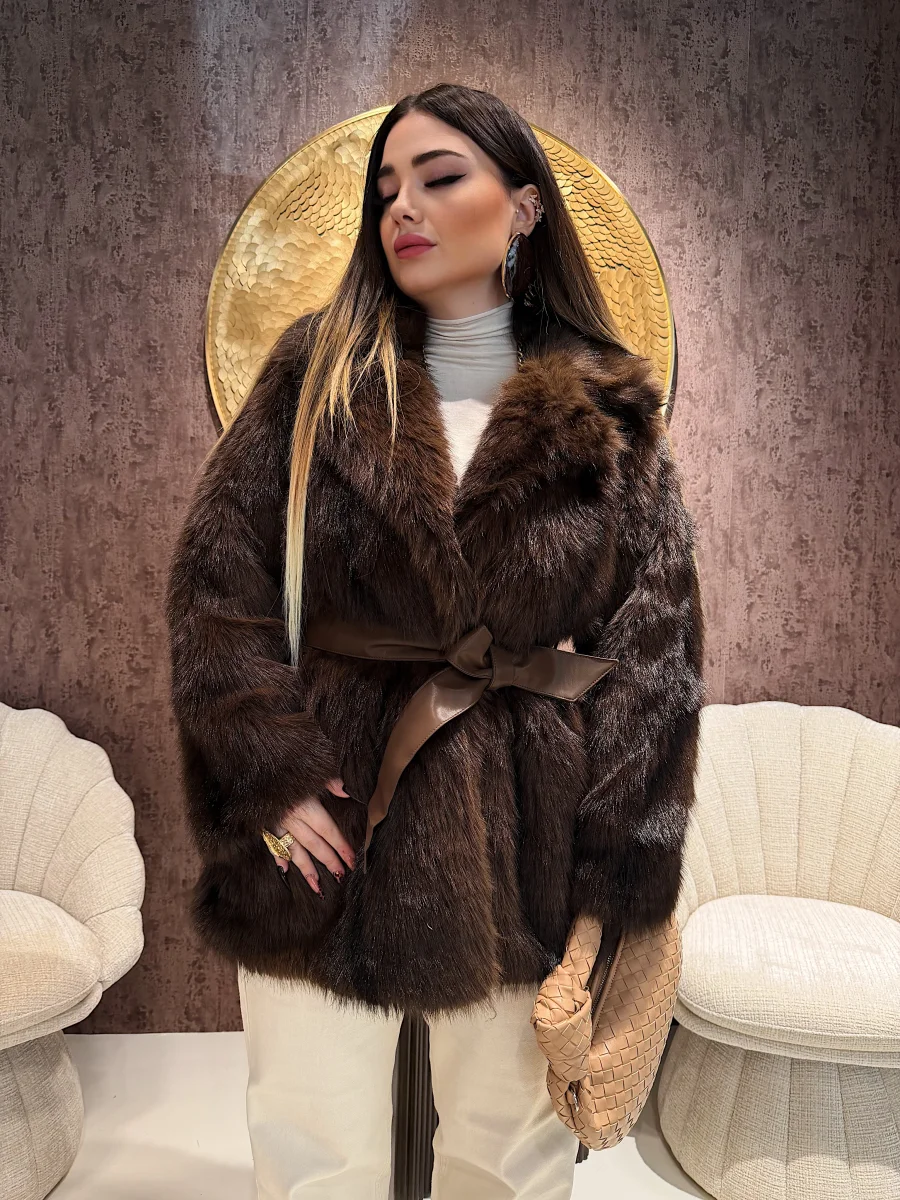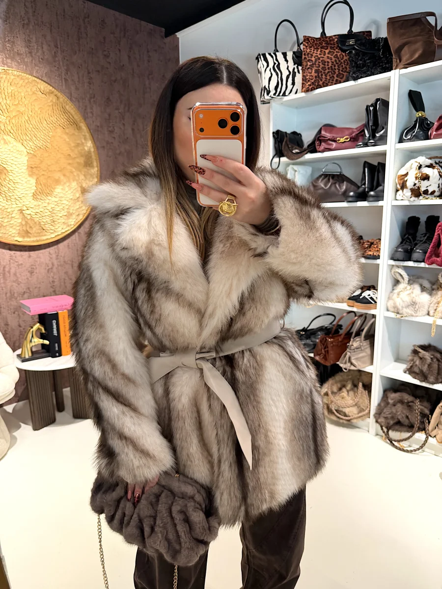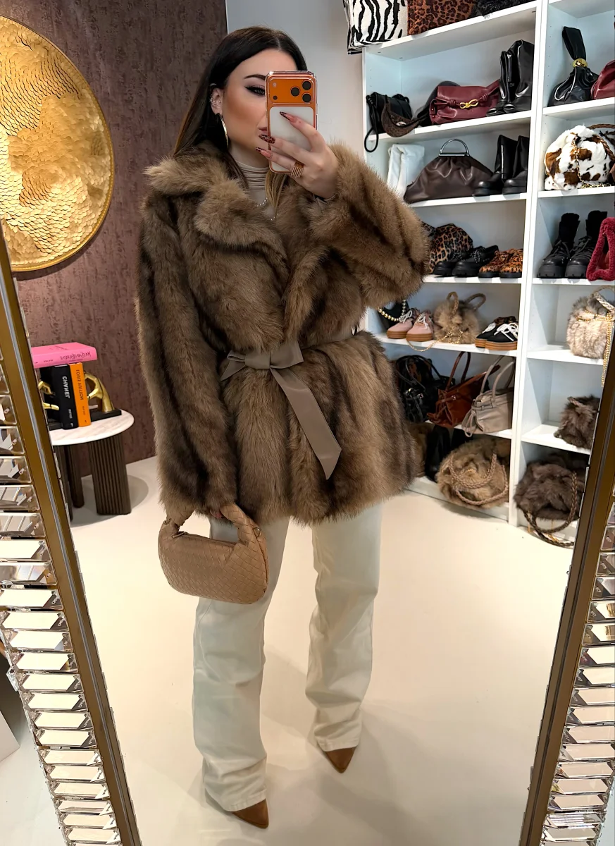 La pelliccia Wild è il mix perfetto tra eleganza e carattere. Realizzata in morbida eco-pelliccia con sfumature naturali nei toni del beige, del miele e del marrone, ricrea l’effetto autentico del pelo selvaggio con un tocco luxury.