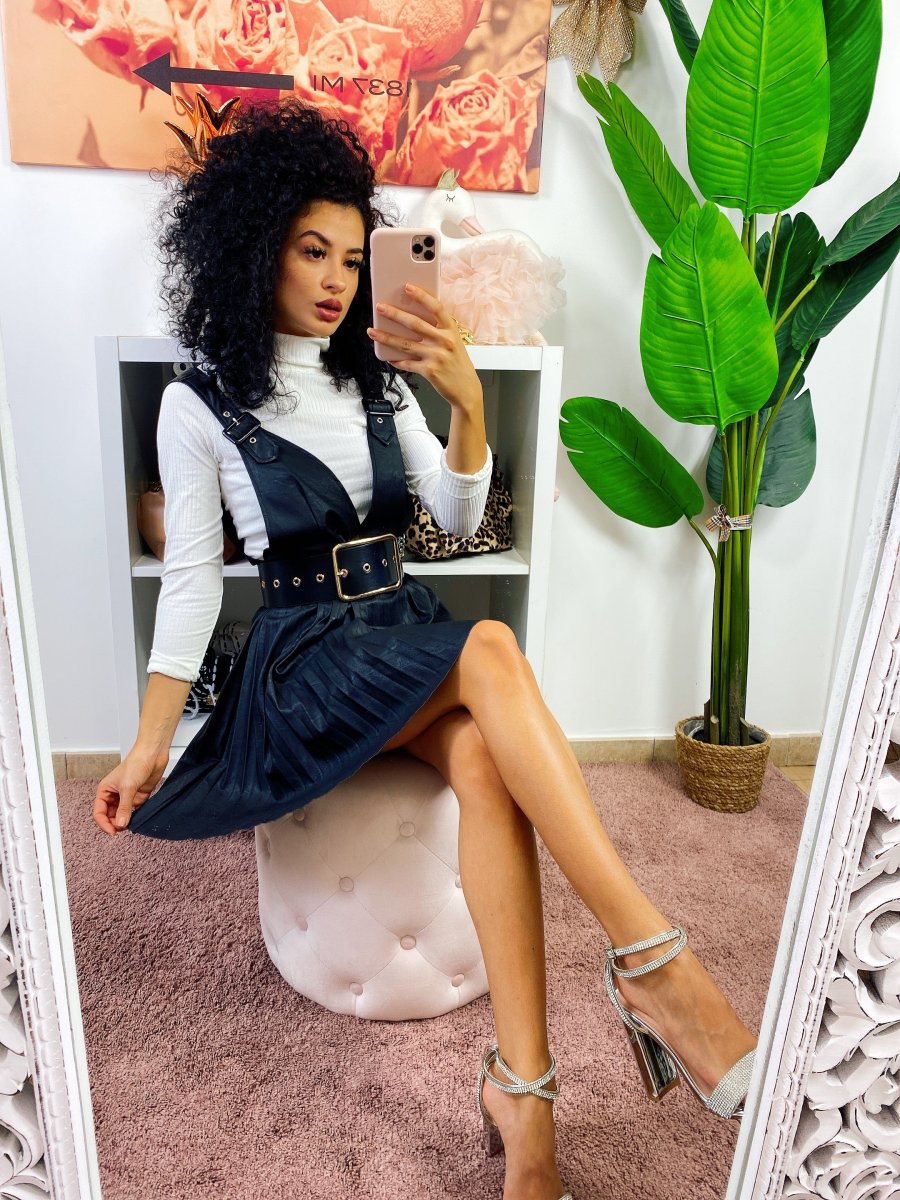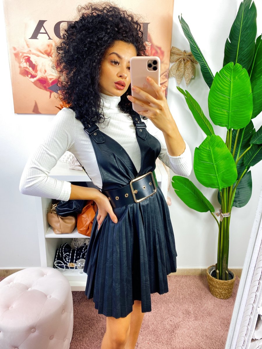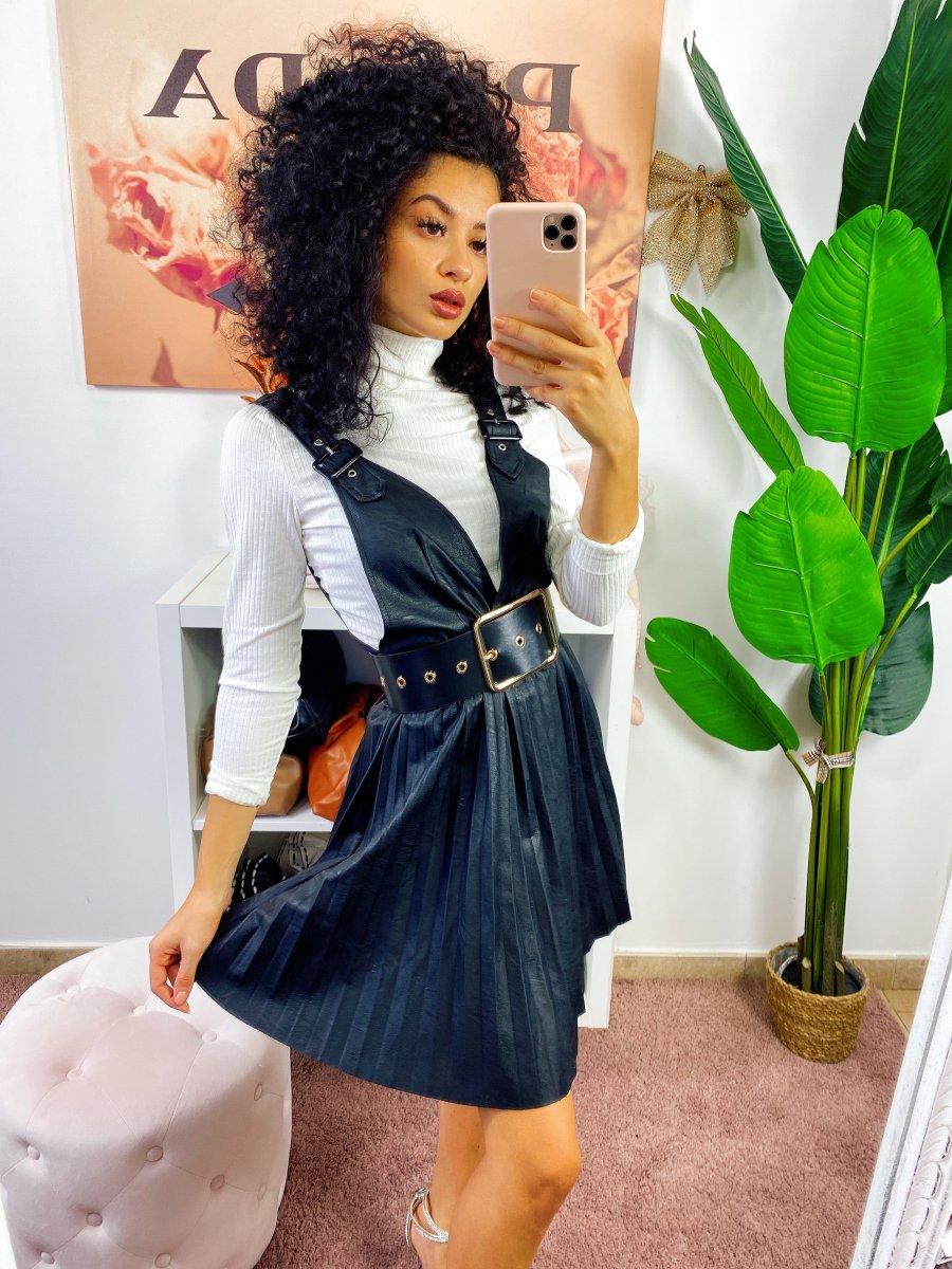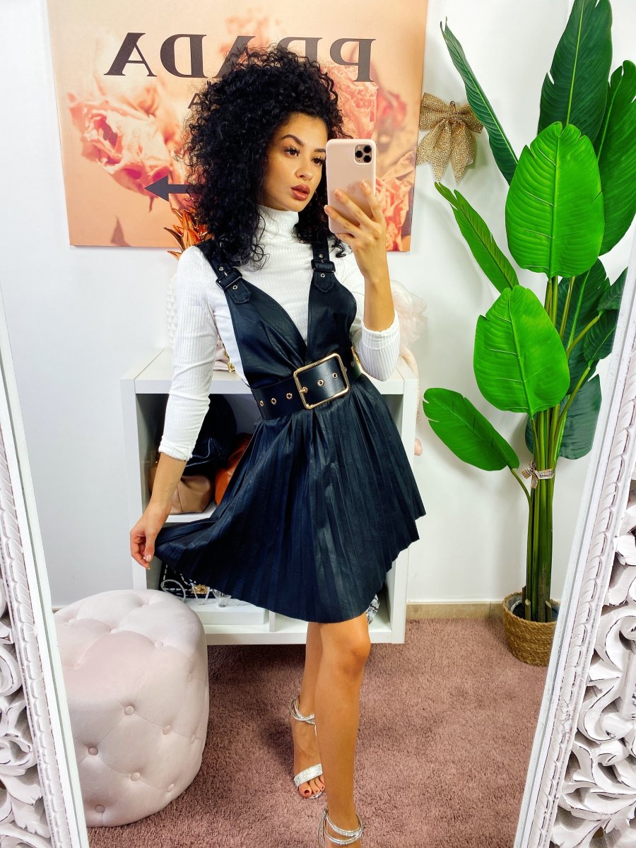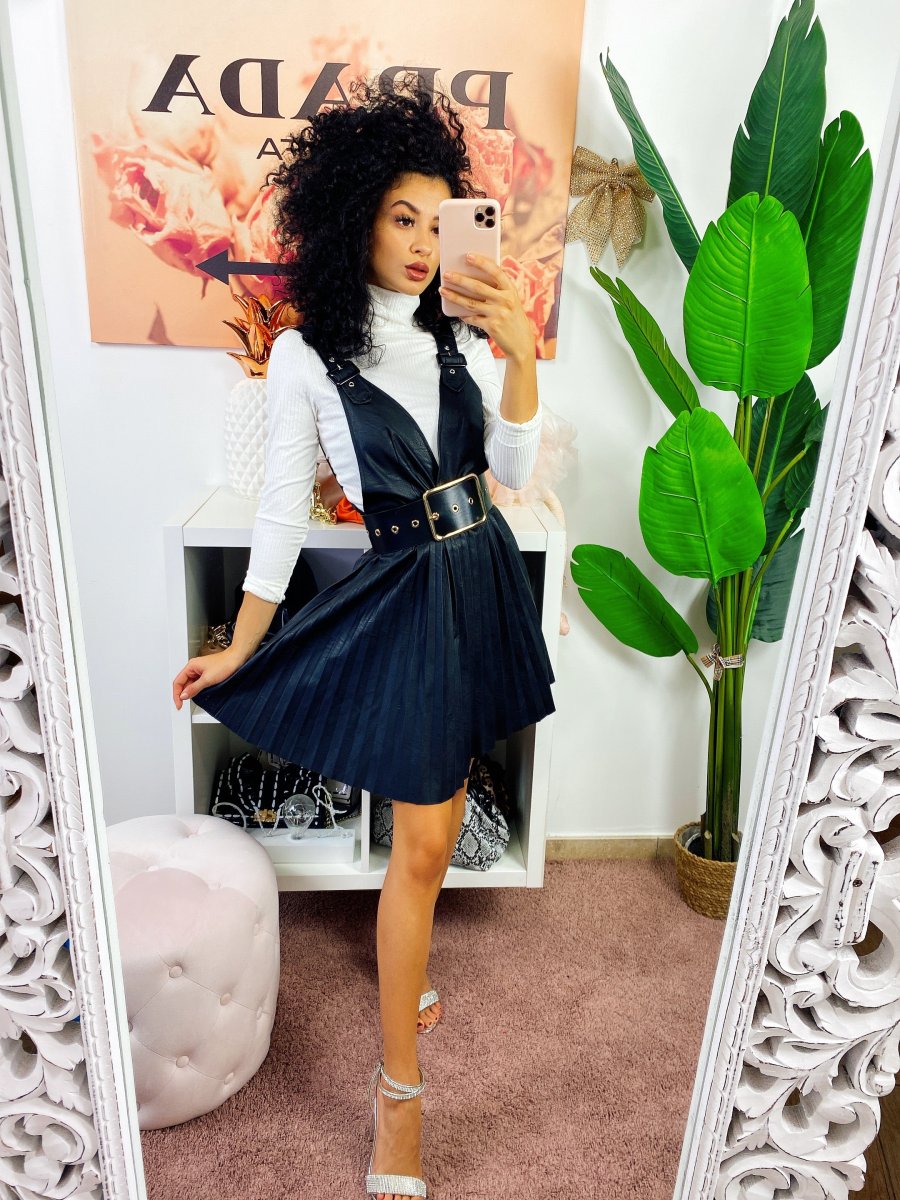 Salopette in eco-pelle con ampia gonna a ruota a pieghine. Chiusura con zip
