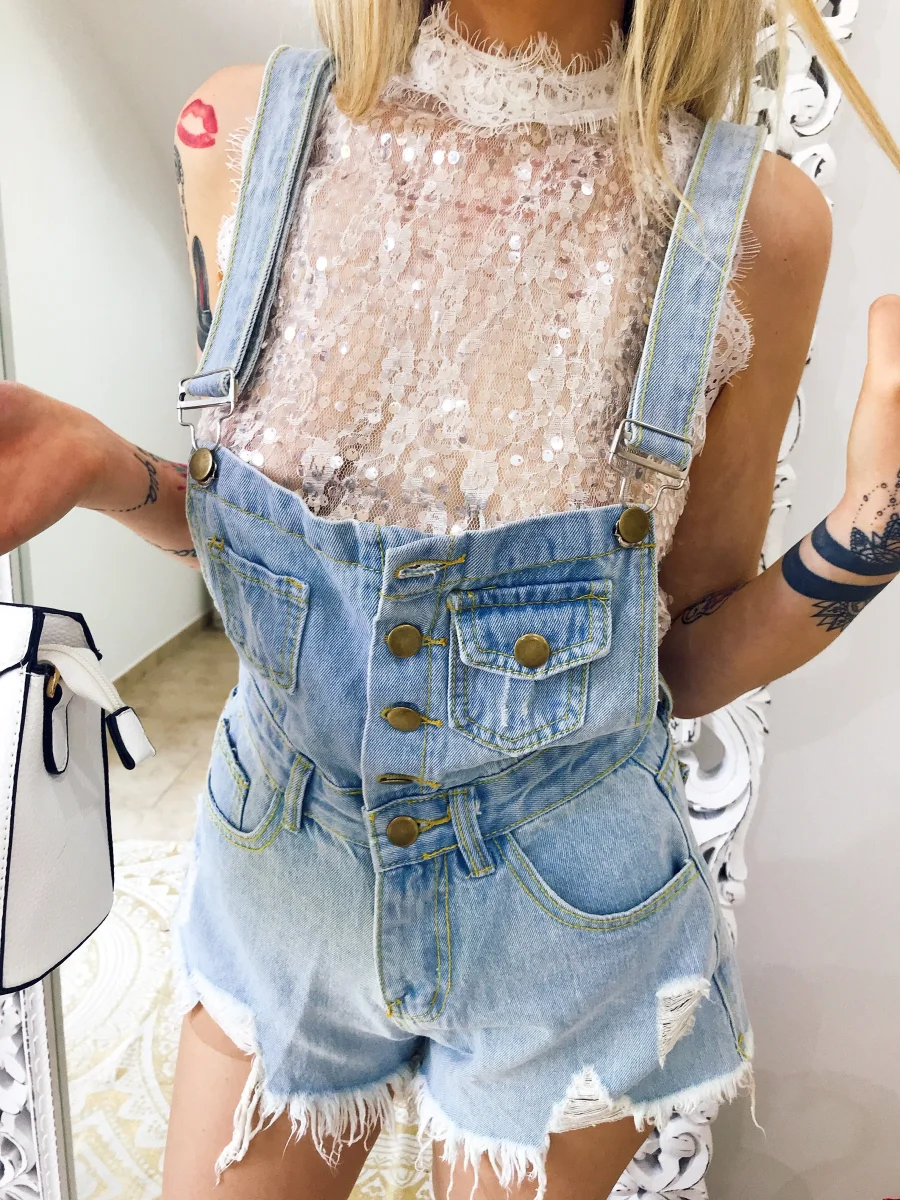 Salopette in jeans a tutina con bottoni, presenta una tasca in alto con stile sfrangiato. Renditi unica e particolare, tanti abbinamenti possibili