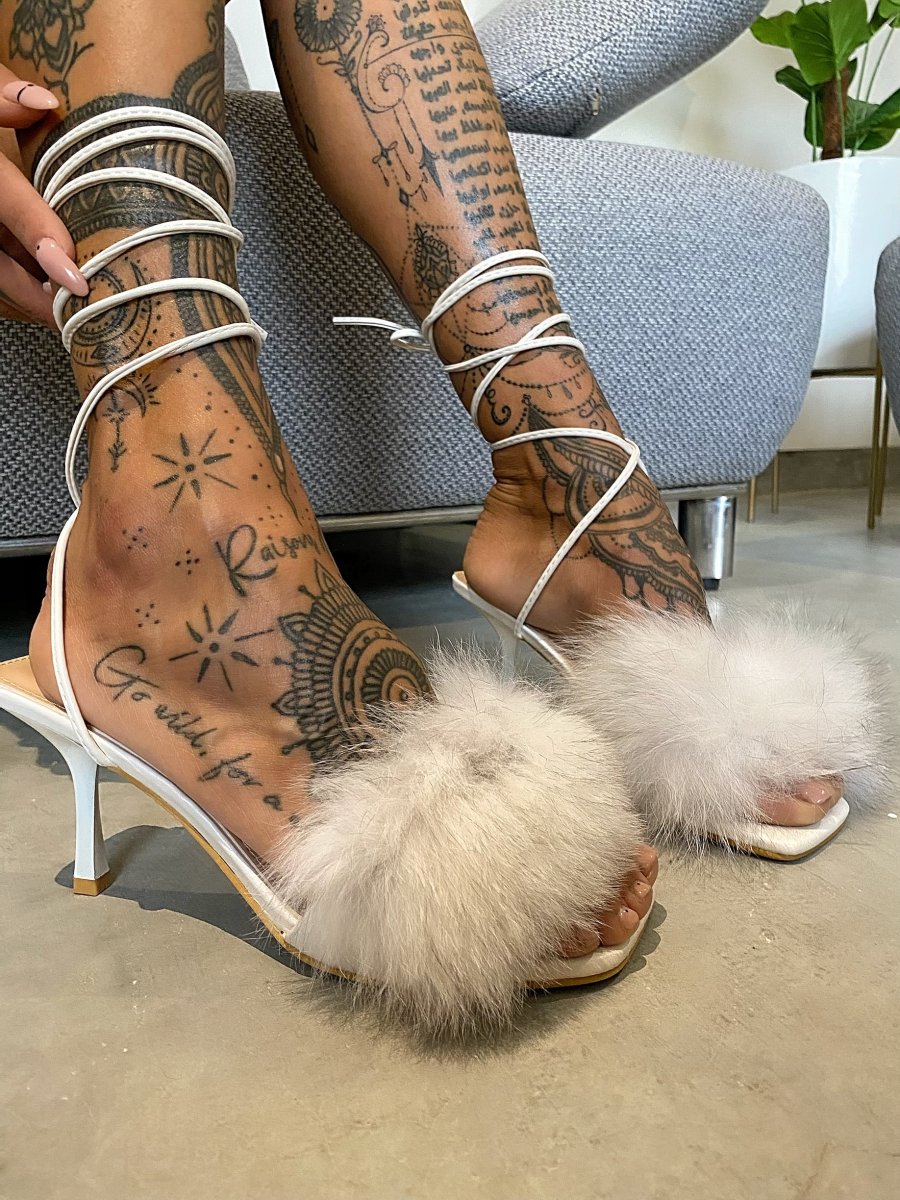 Sandali con lacci e eco-pelo, altezza tacco 9cm punta quadrata.