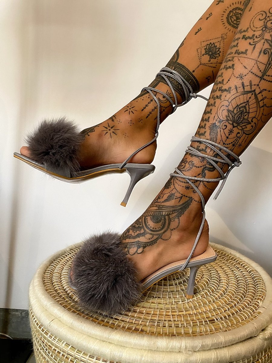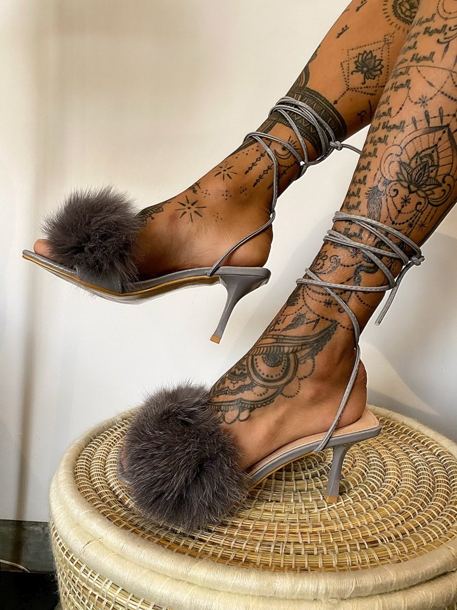 Sandali con lacci e eco-pelo, altezza tacco 9cm punta quadrata.