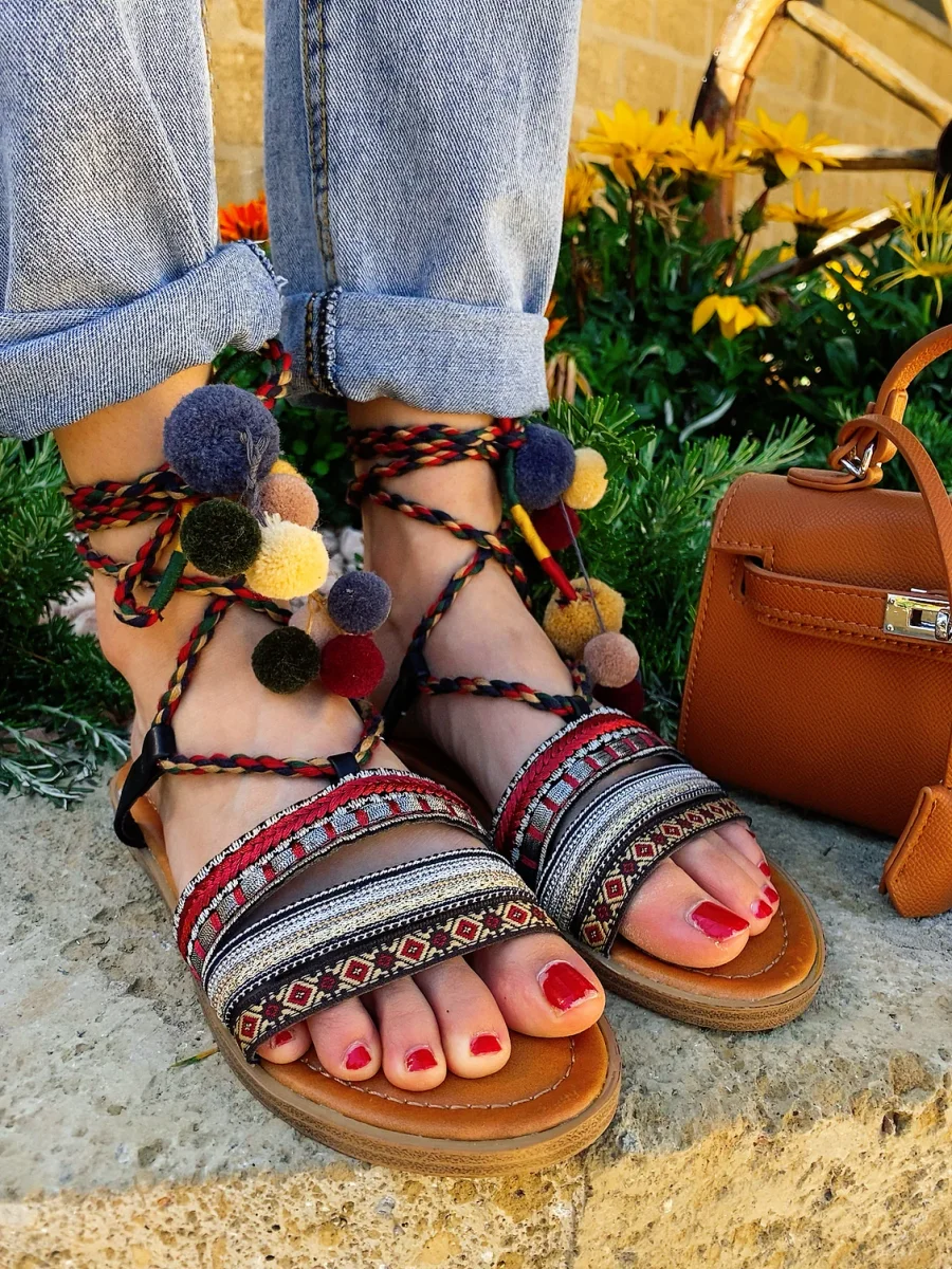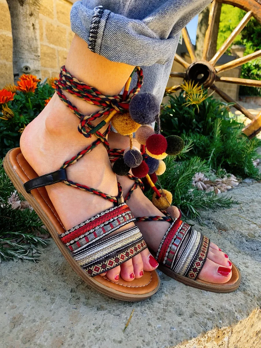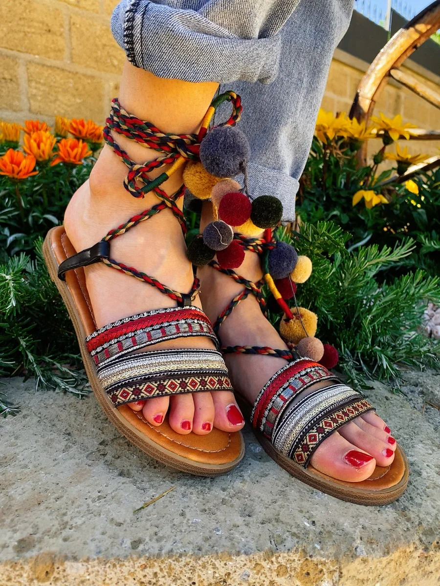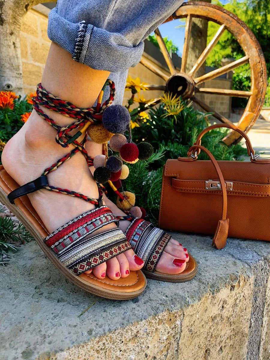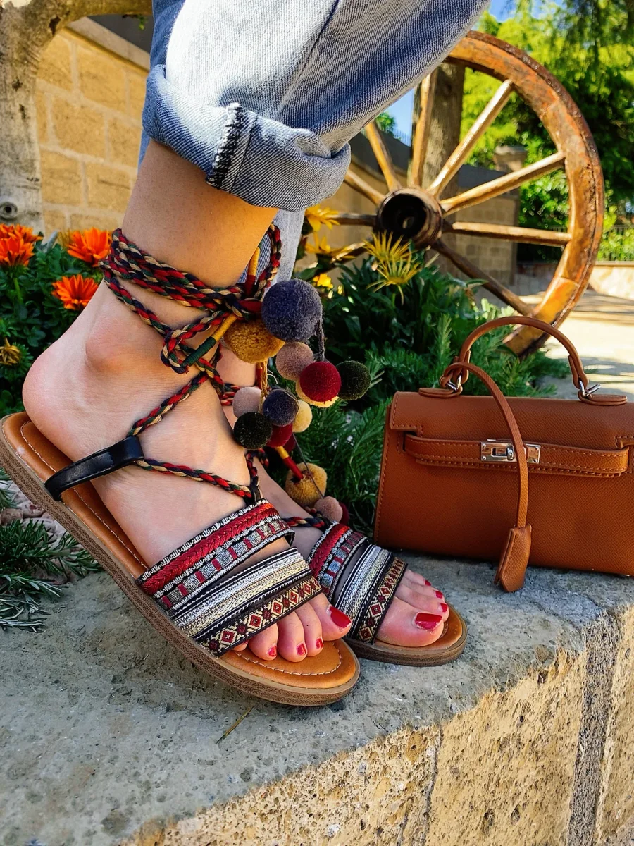 Sandalo basso con lacci con pompom. Stile etnico retró