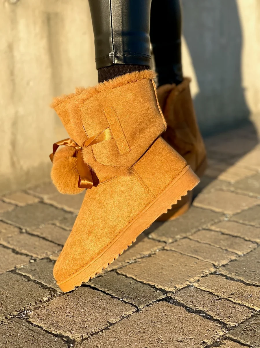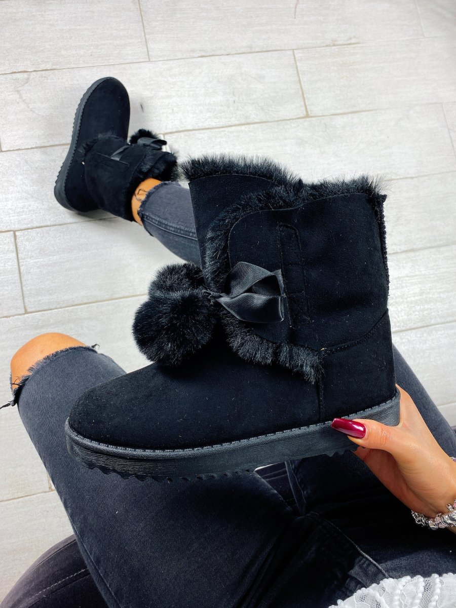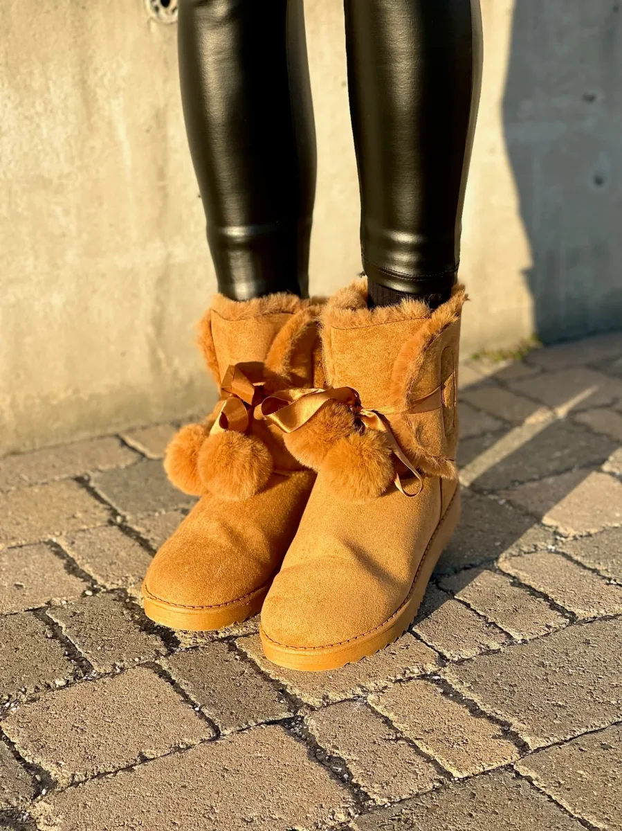 Scarponcini con pelliccia con pompom in pelliccia sintetica. Calzata regolare