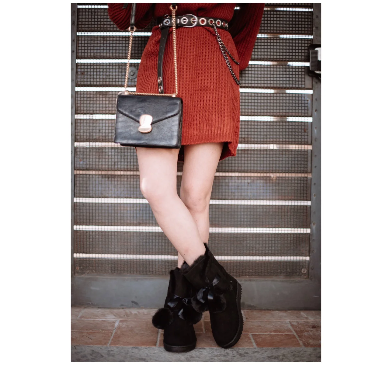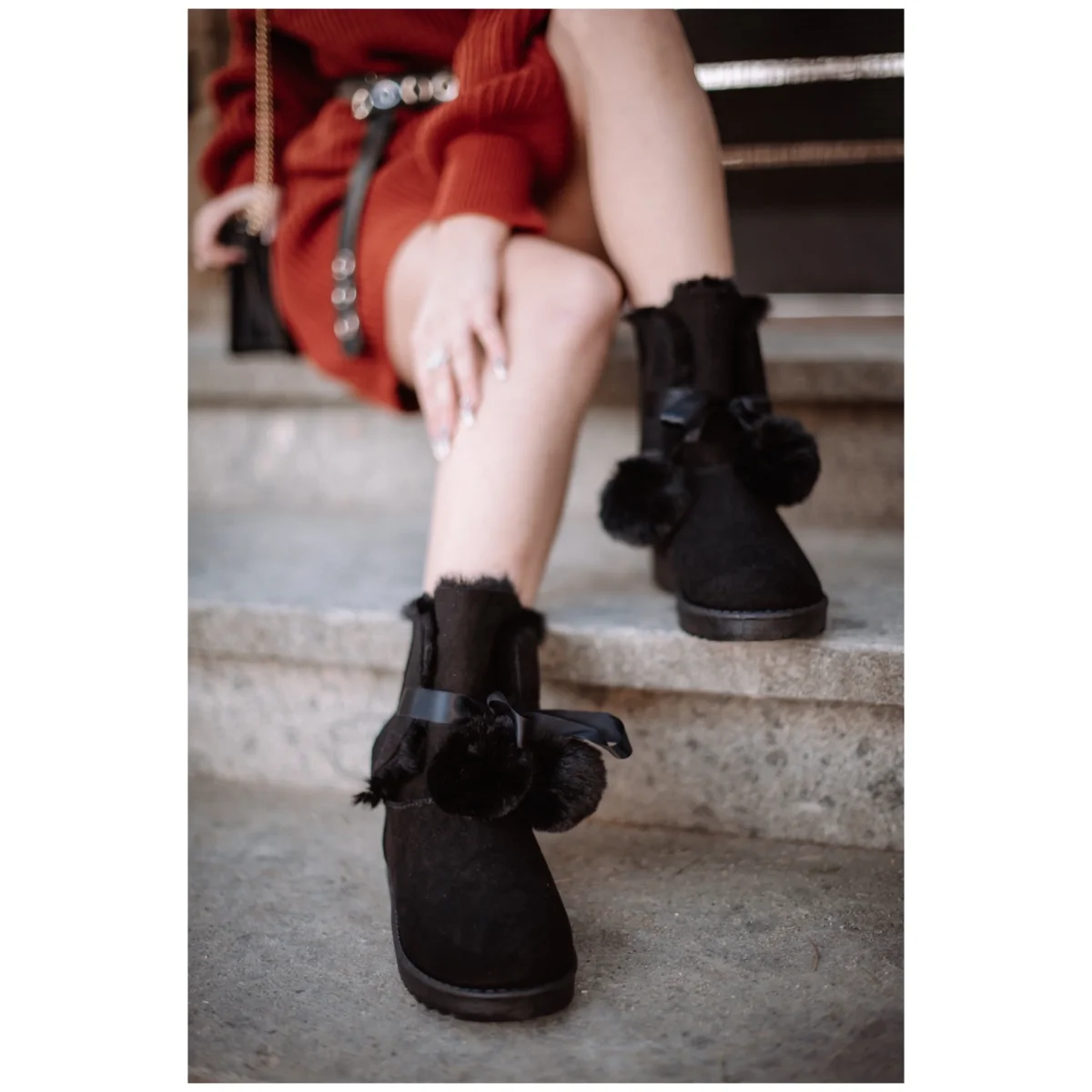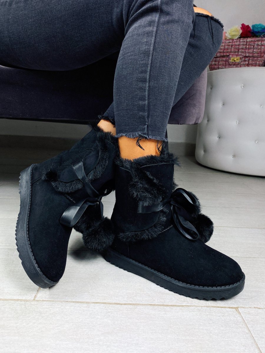 Scarponcini con pelliccia con pompom in pelliccia sintetica. Calzata regolare