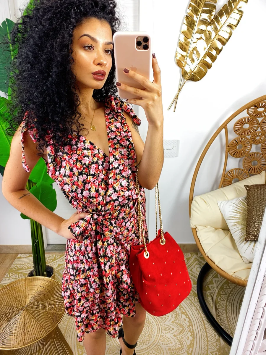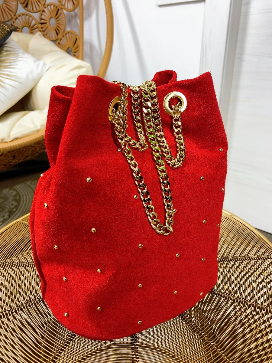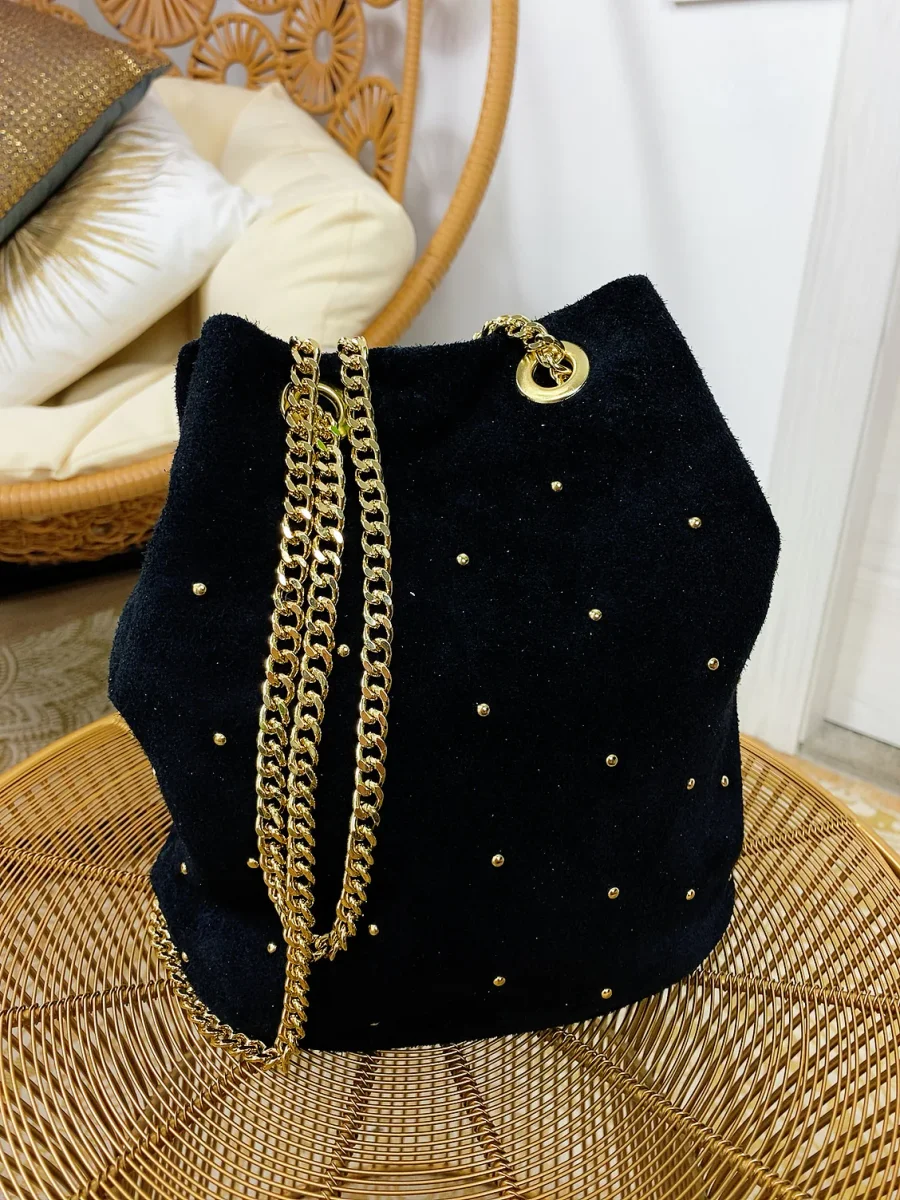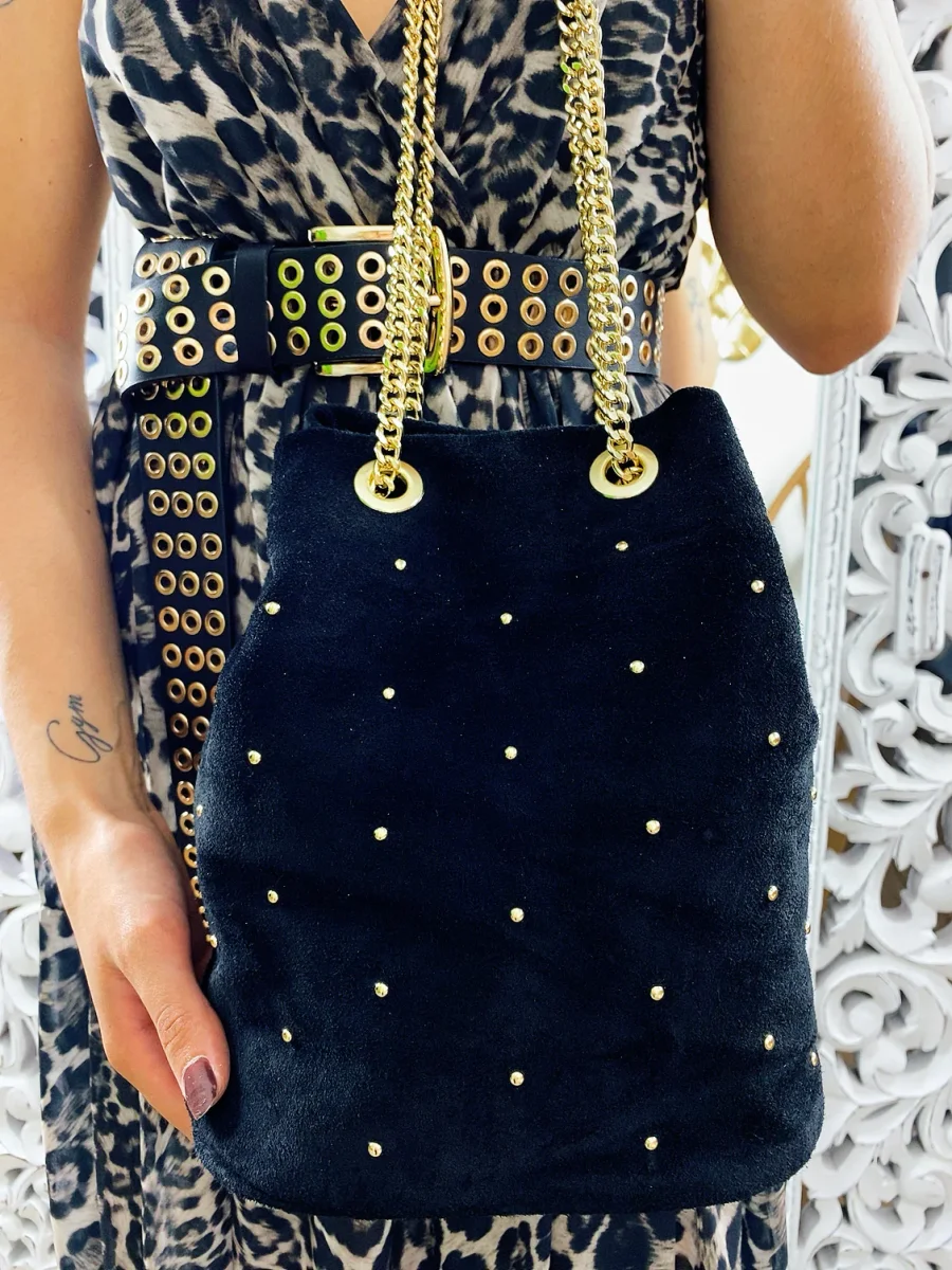 Secchiello in pelle comodo, chiusura con bottoncino. Catena oro regolabile a piacimento