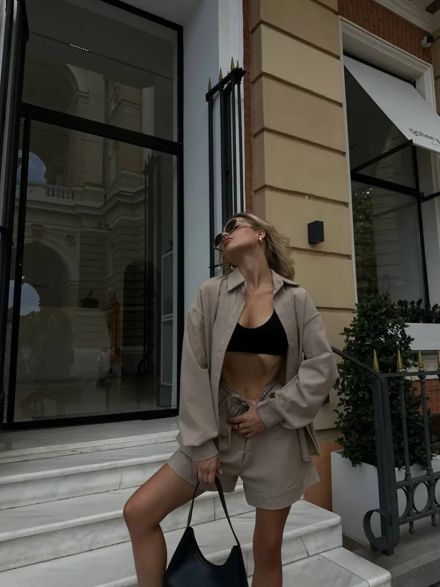 Set a taglie due pezzi venduti singolarmente in tessuto 100% lino, camicia over size con bottoni e short con elastico in vita.
