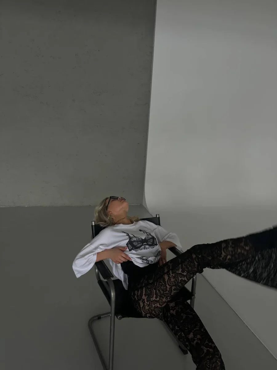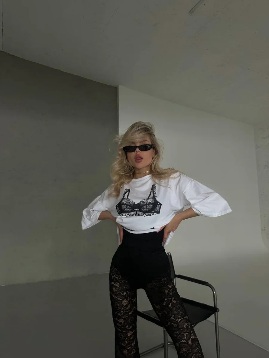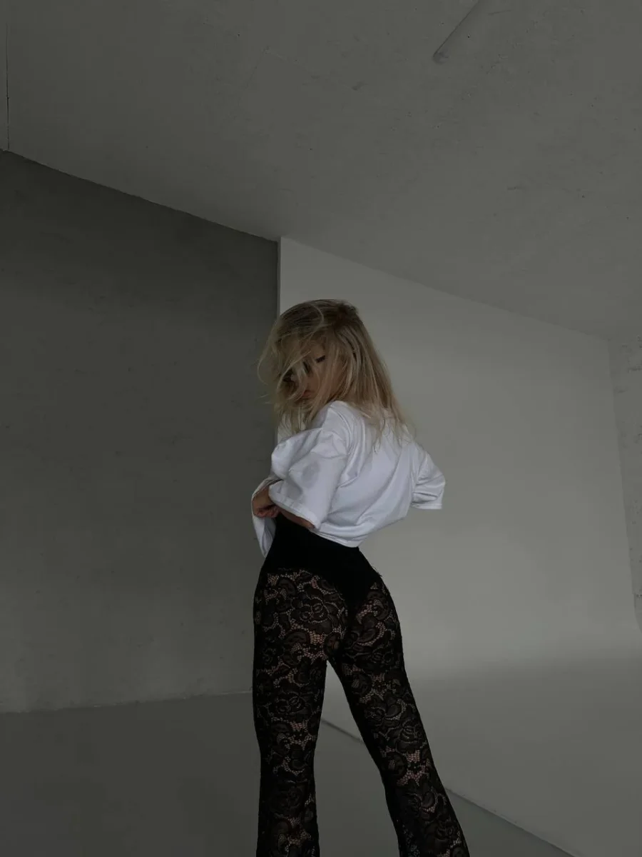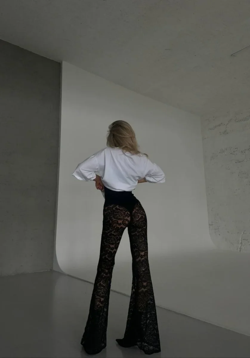 Pantalone svasato in pizzo a vita altissima con gamba morbida.