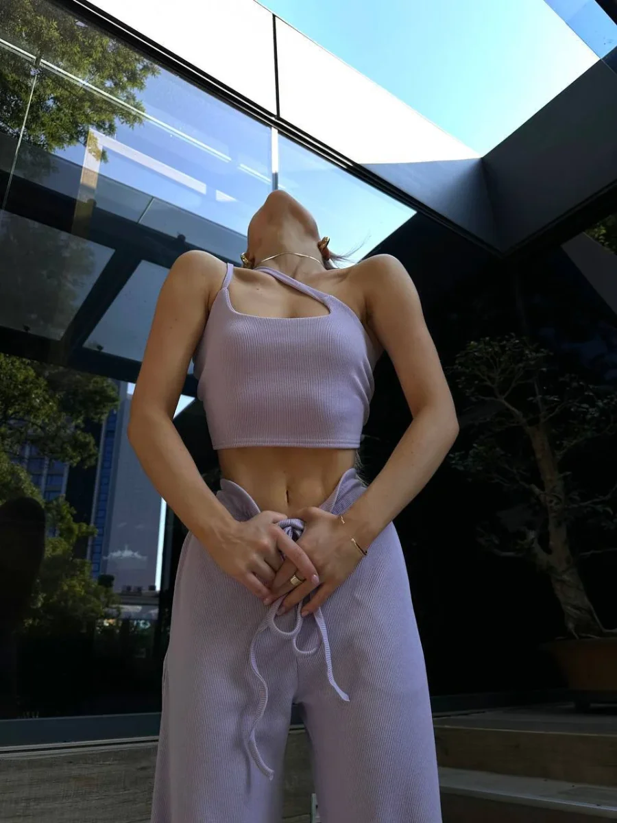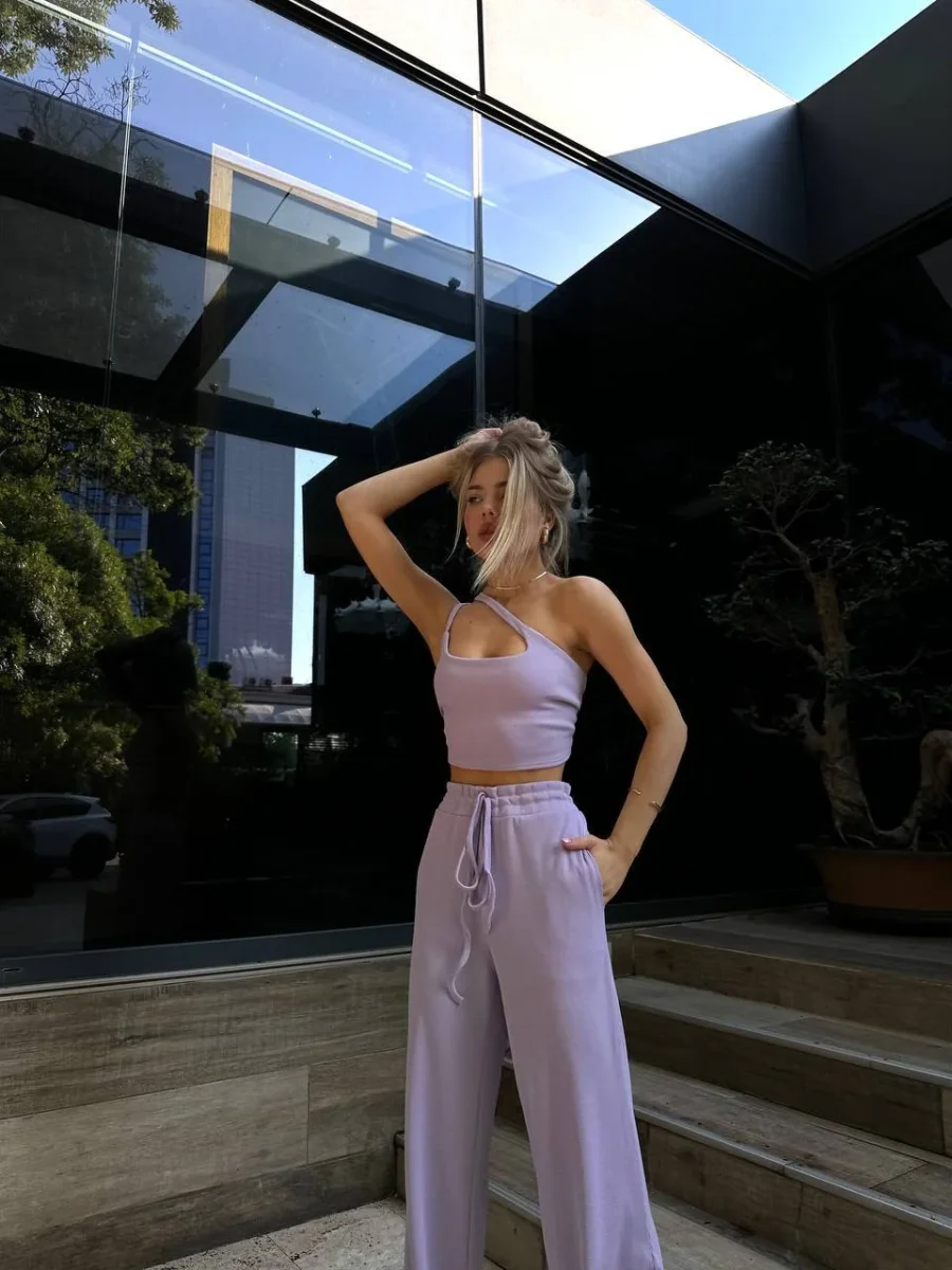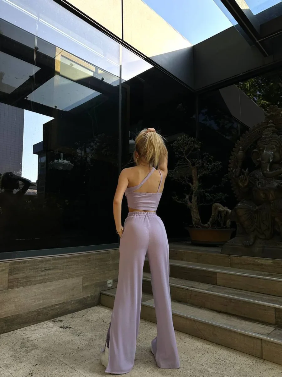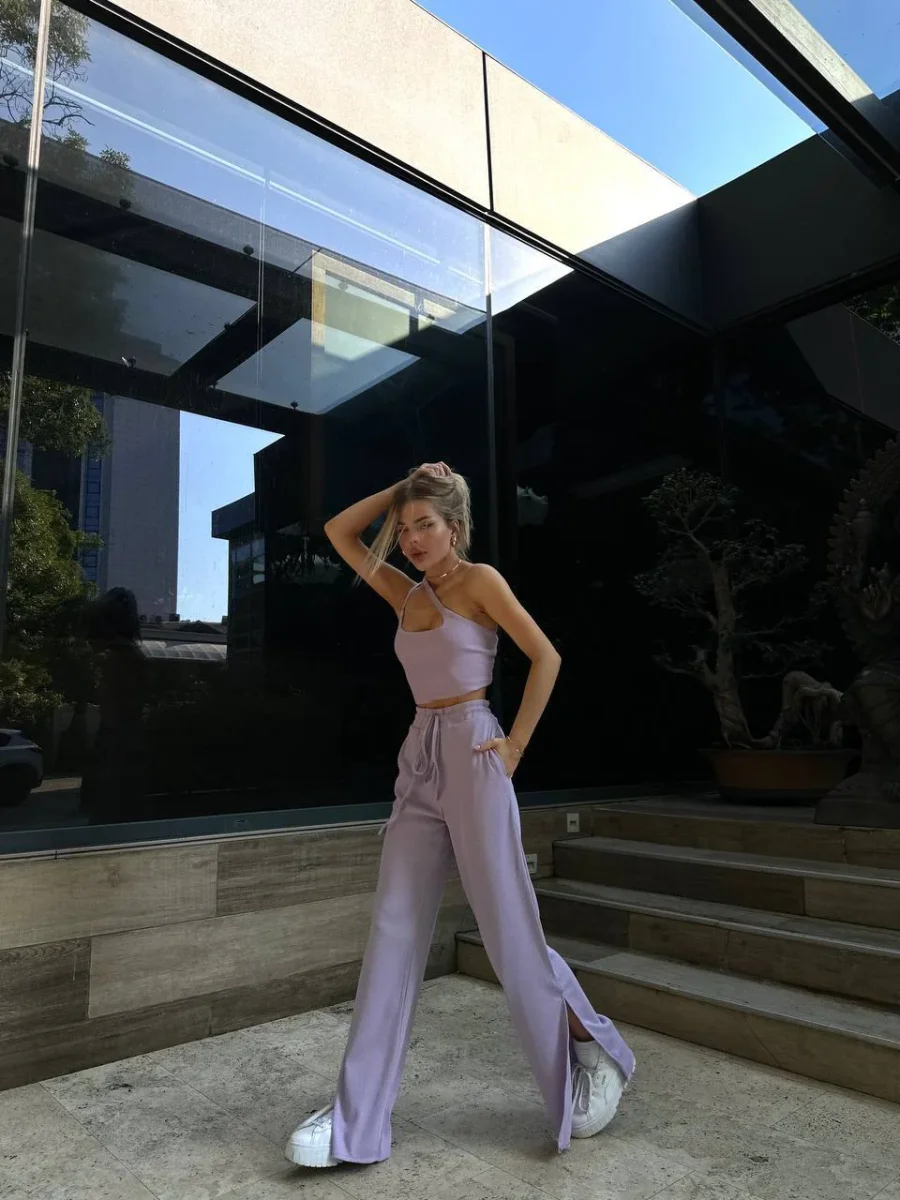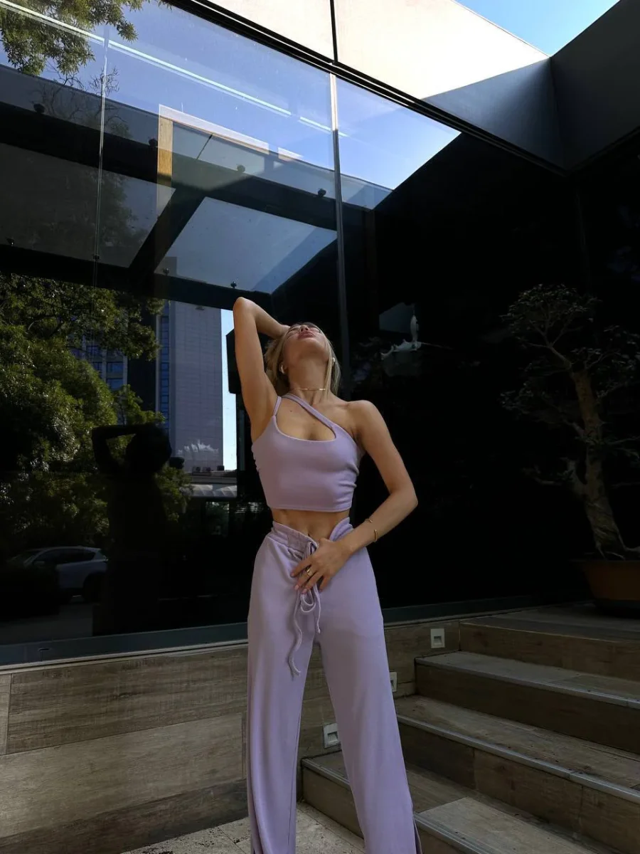 Completo due pezzi venduti singolarmente composto da top e pantalone elasticizzato .