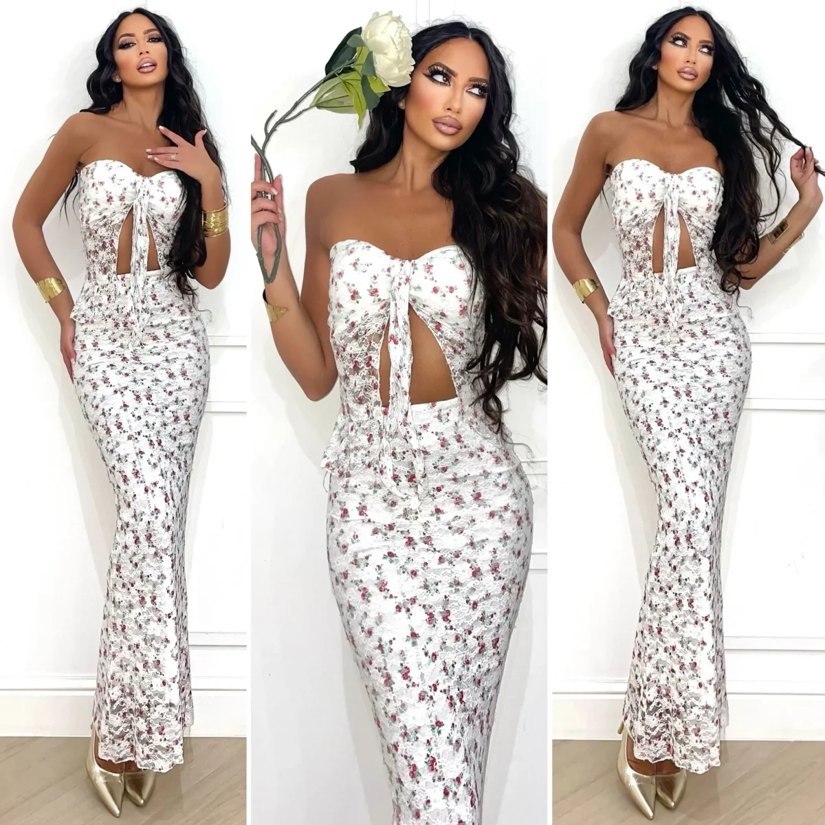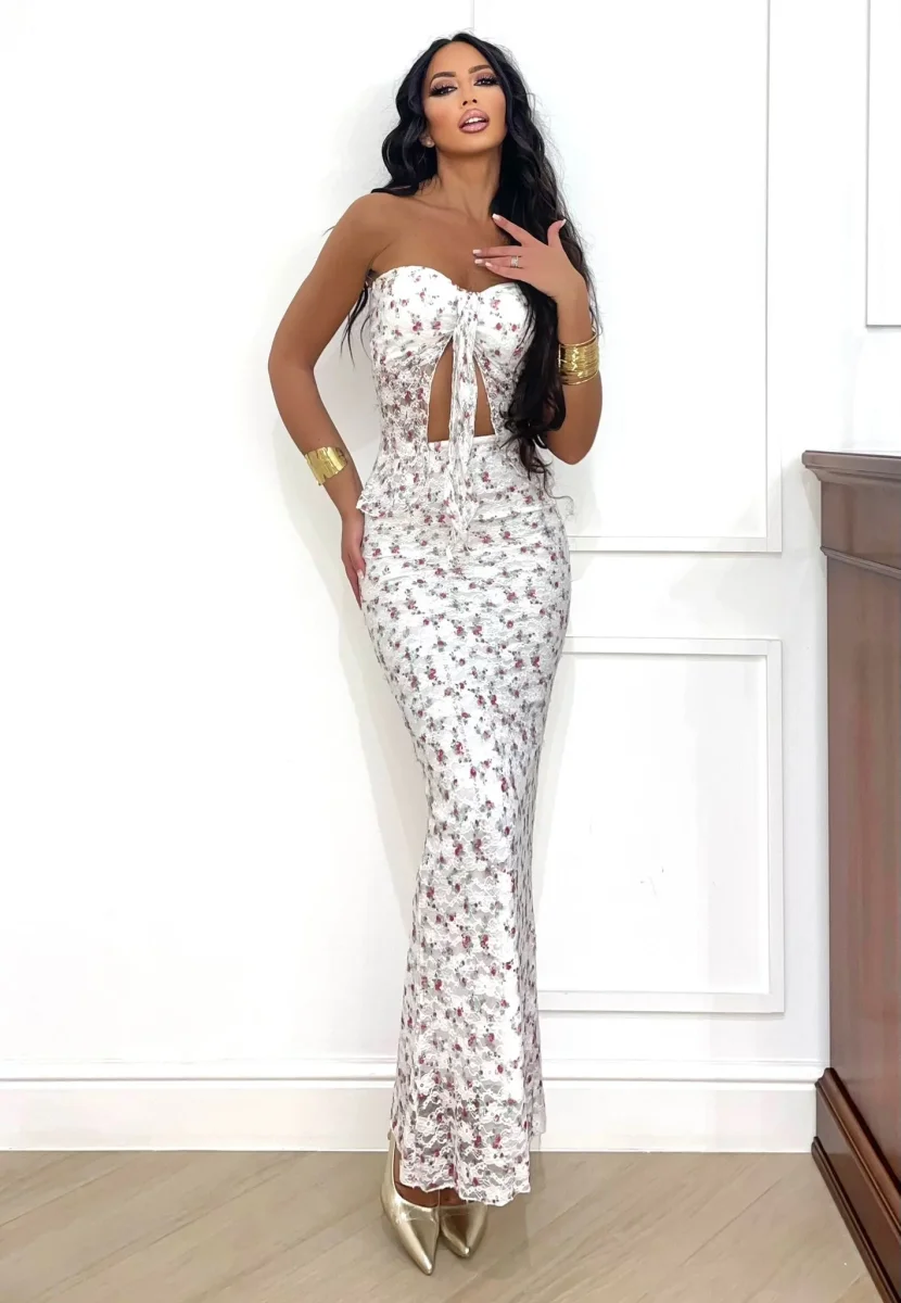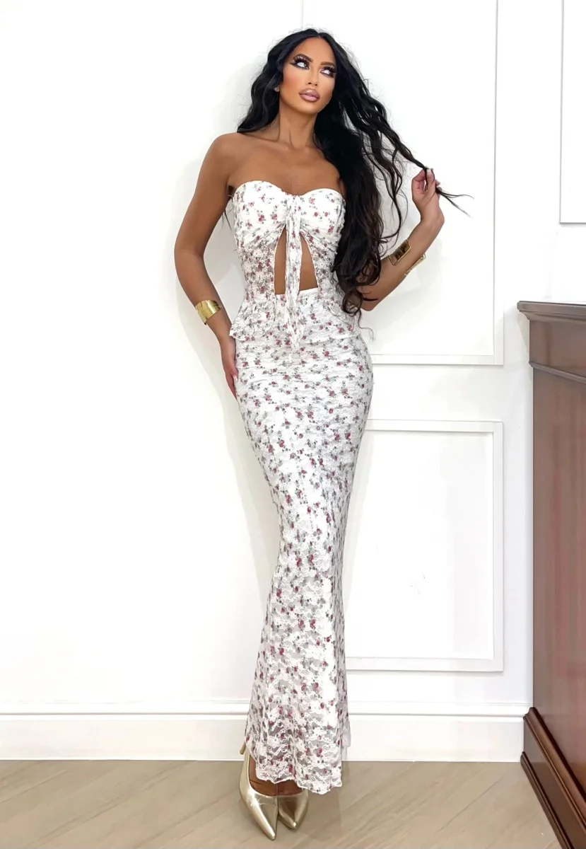 Eleganza floreale e dettagli scintillanti si incontrano nel completo , pensato per chi ama distinguersi con femminilità . Il top a cuore con fiocco centrale e apertura frontale valorizza il décolleté, mentre i pannelli laterali in pizzo trasparente e paillettes aggiungono un tocco sensuale e prezioso. La gonna lunga e aderente, con stampa floreale all-over e finitura leggermente lucida, segue le curve con grazia e dona un effetto sirena. Perfetto per cerimonie estive, cene romantiche o eventi speciali sotto le stelle.