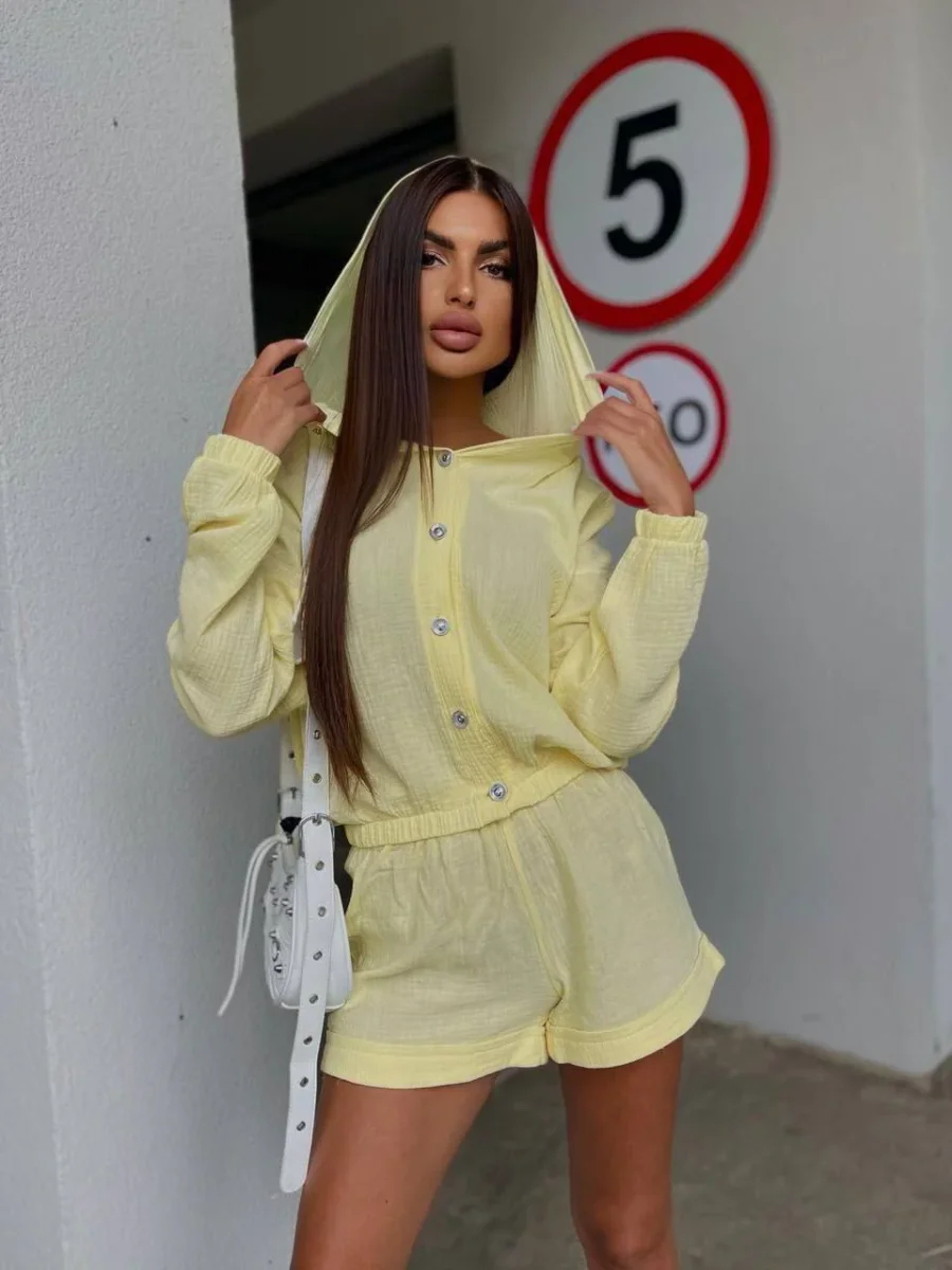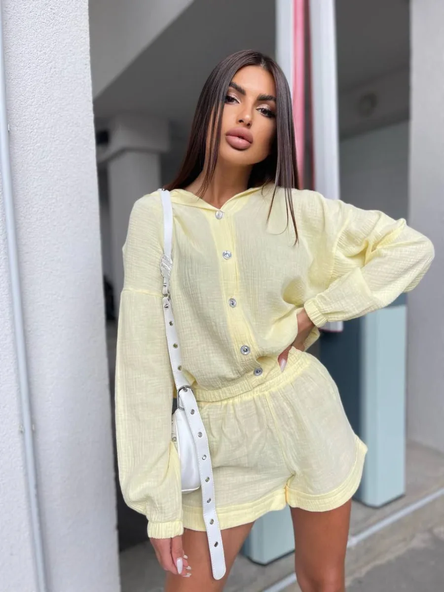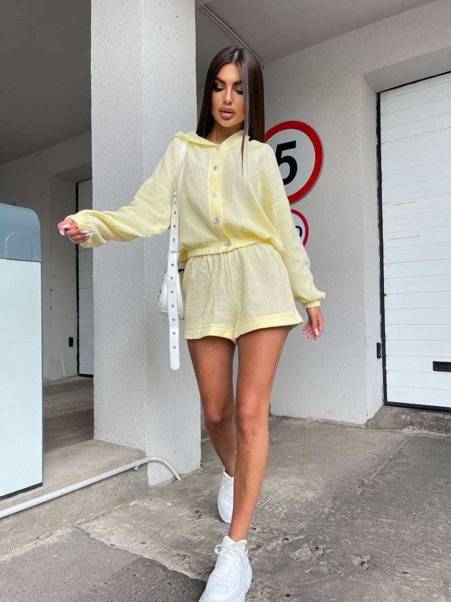 Bellissimo set in mussola leggera, fresca e traspirante venduti singolarmente . Composto da camicia/bomber con bottoncini e cappuccio e short con elastico in vita. Disponibile in tanti colori.