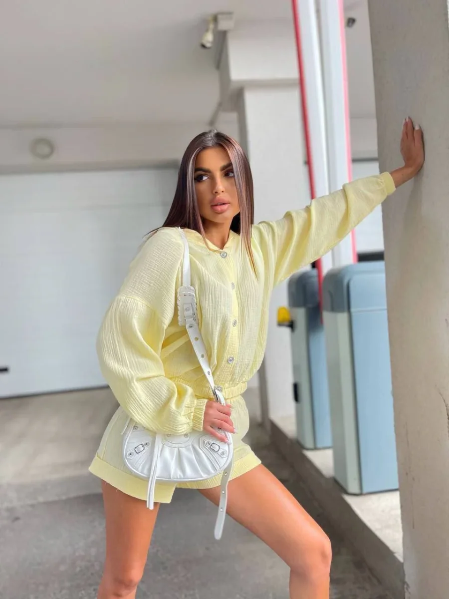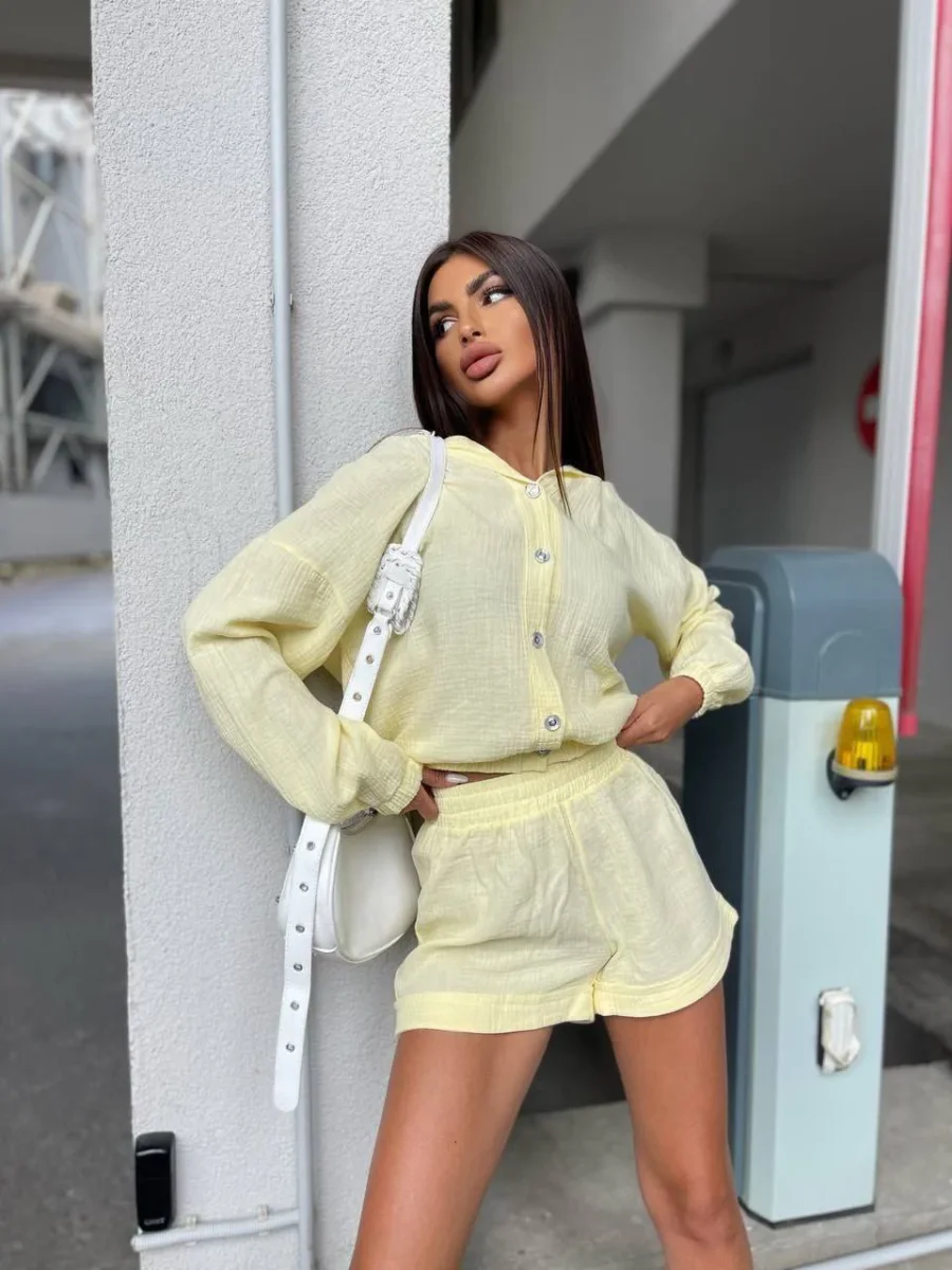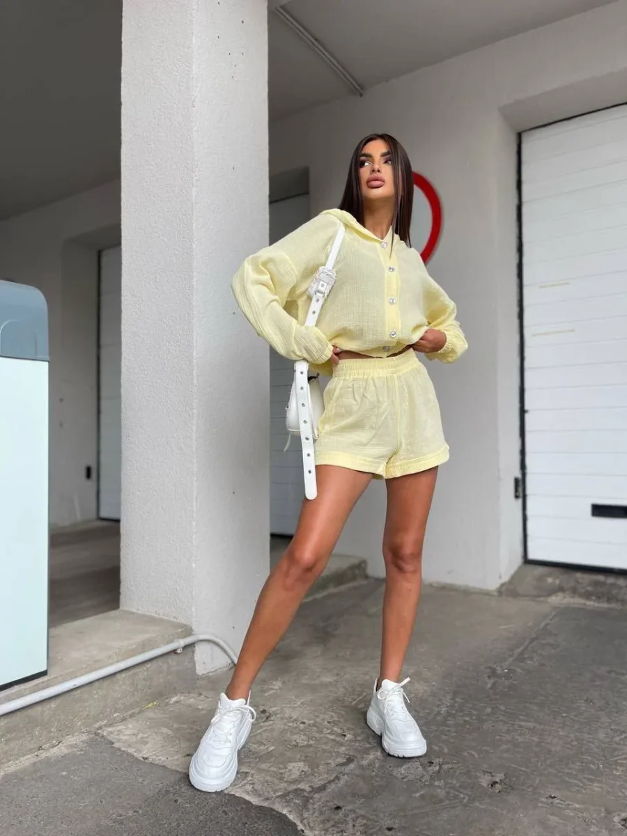 Bellissimo set in mussola leggera, fresca e traspirante venduti singolarmente . Composto da camicia/bomber con bottoncini e cappuccio e short con elastico in vita. Disponibile in tanti colori.