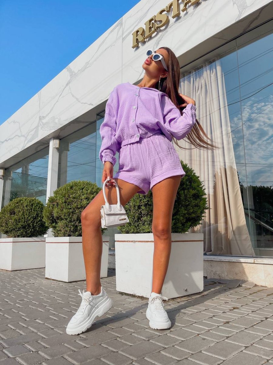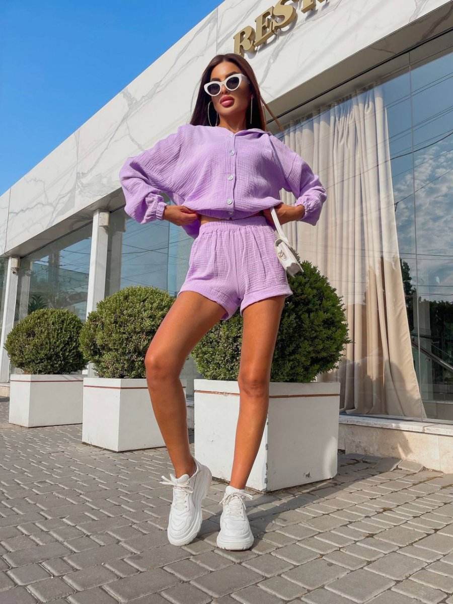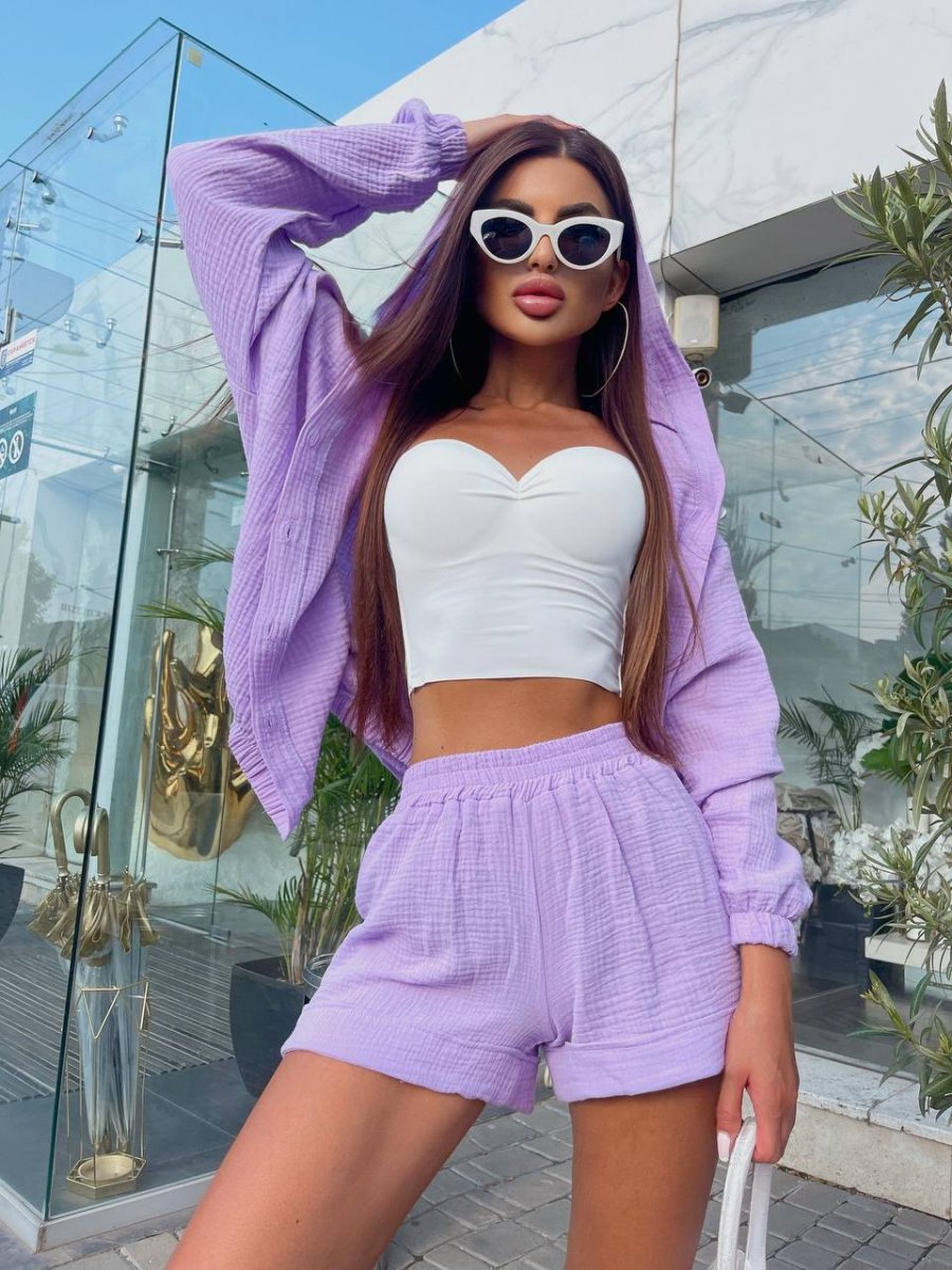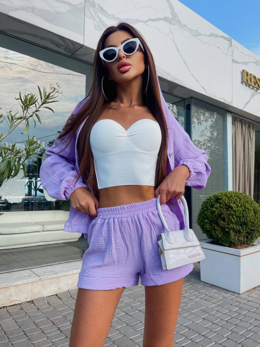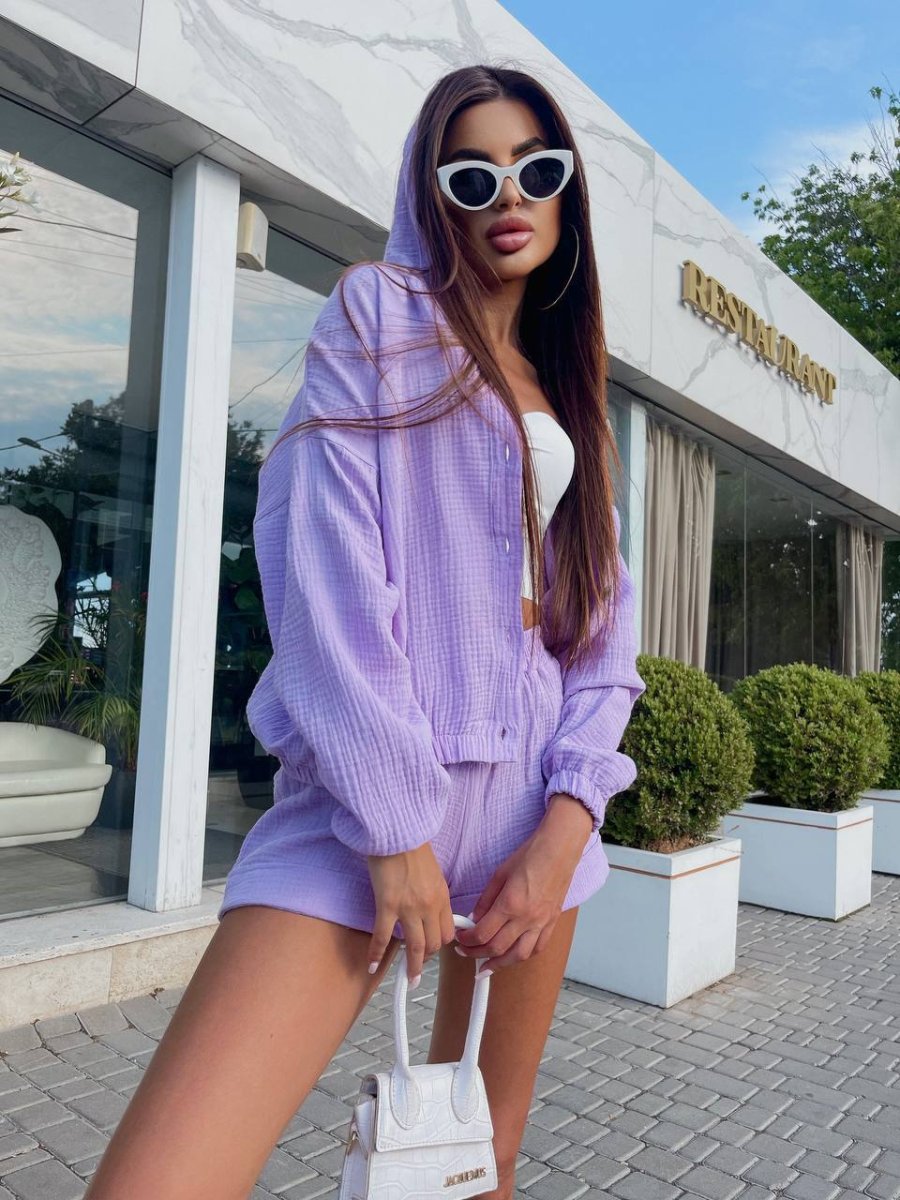 Bellissimo set due pezzi venduti singolarmente in mussola leggera, fresca e traspirante. Composto da camicia/bomber con bottoncini e cappuccio e short con elastico in vita. Disponibile in tanti colori.