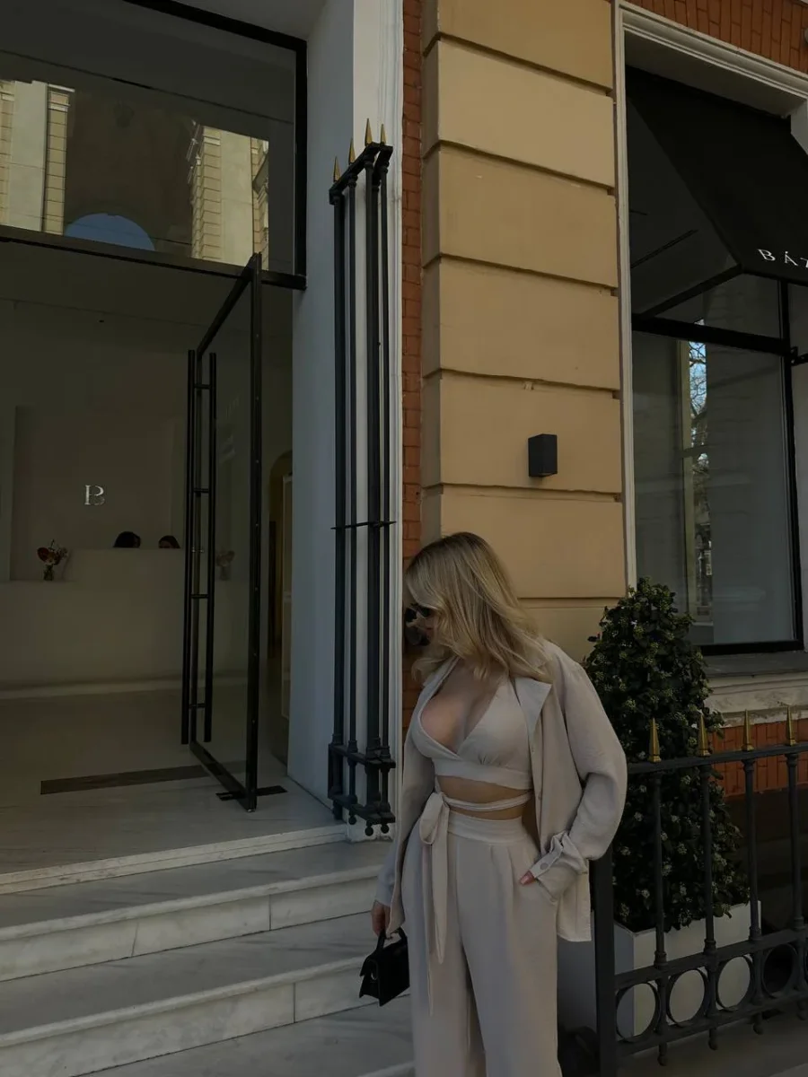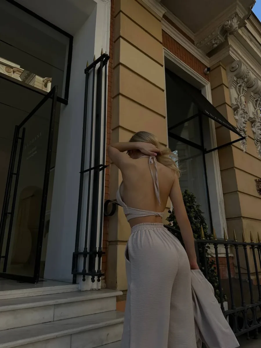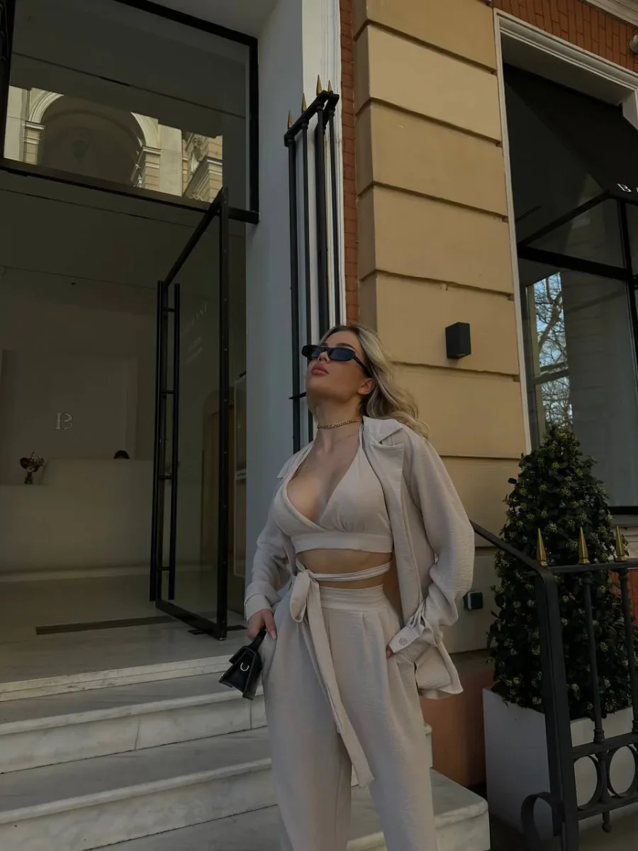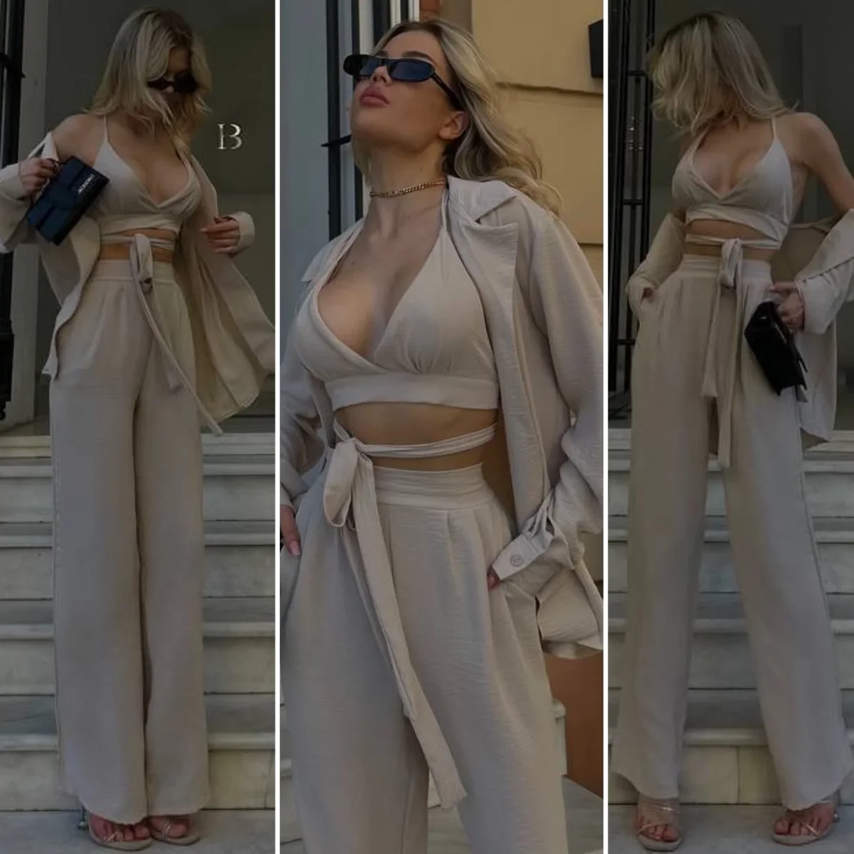 Set tre pezzi venduti singolarmente composto da camicia top e pantalone in tessuto leggero fresco.
