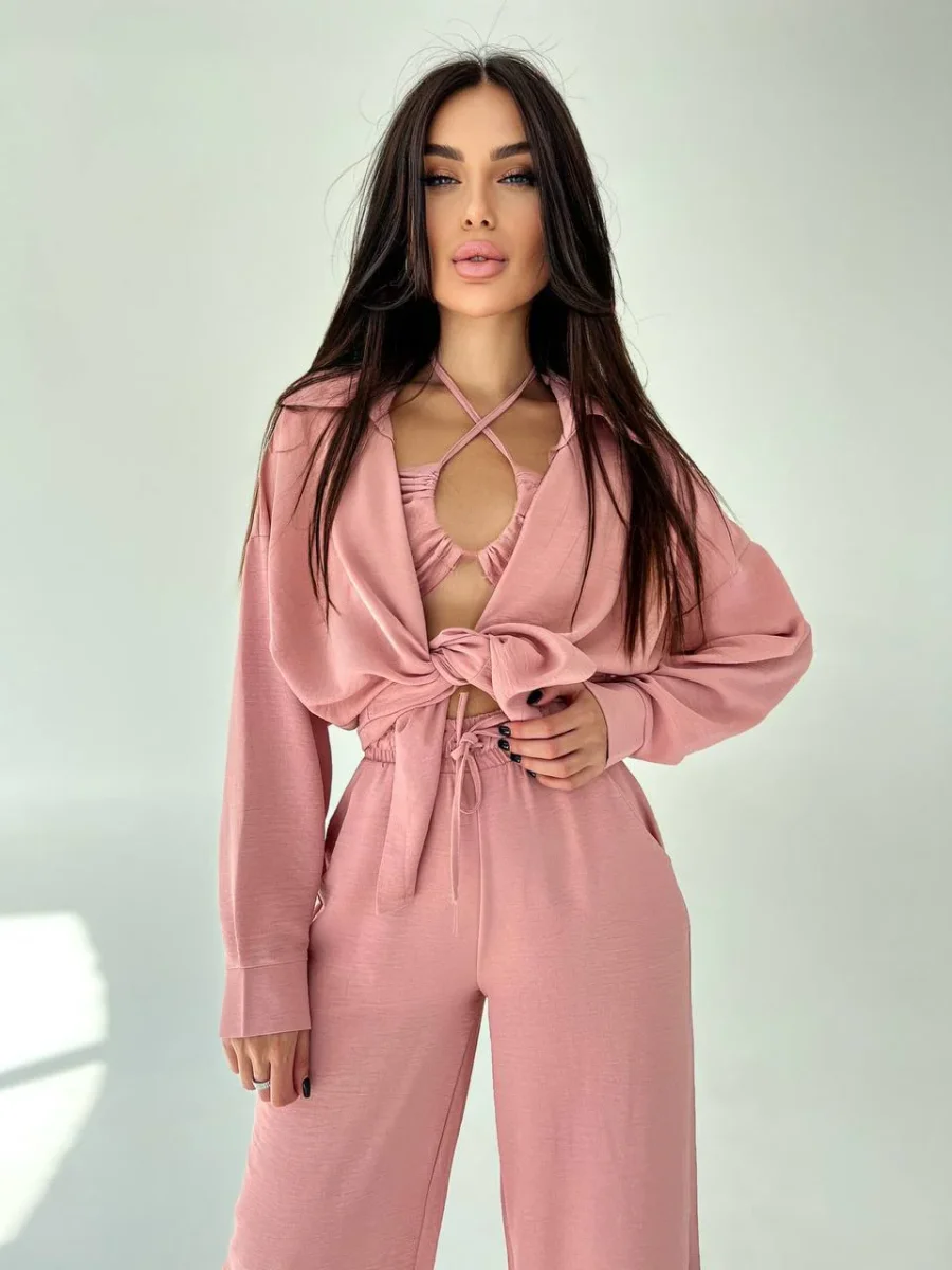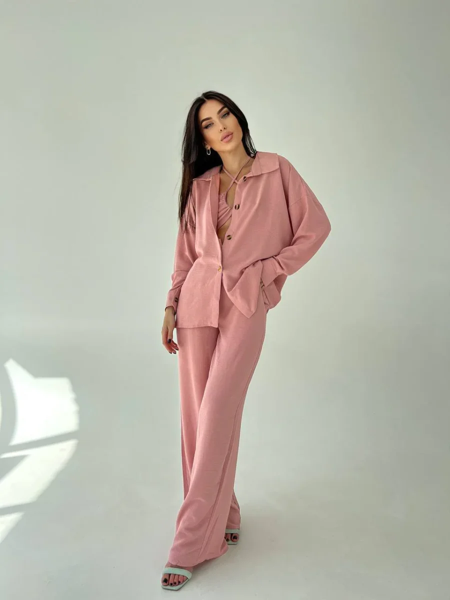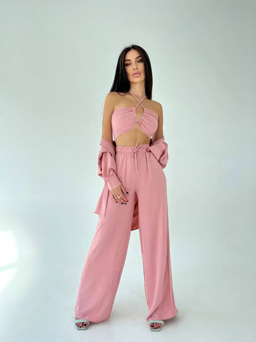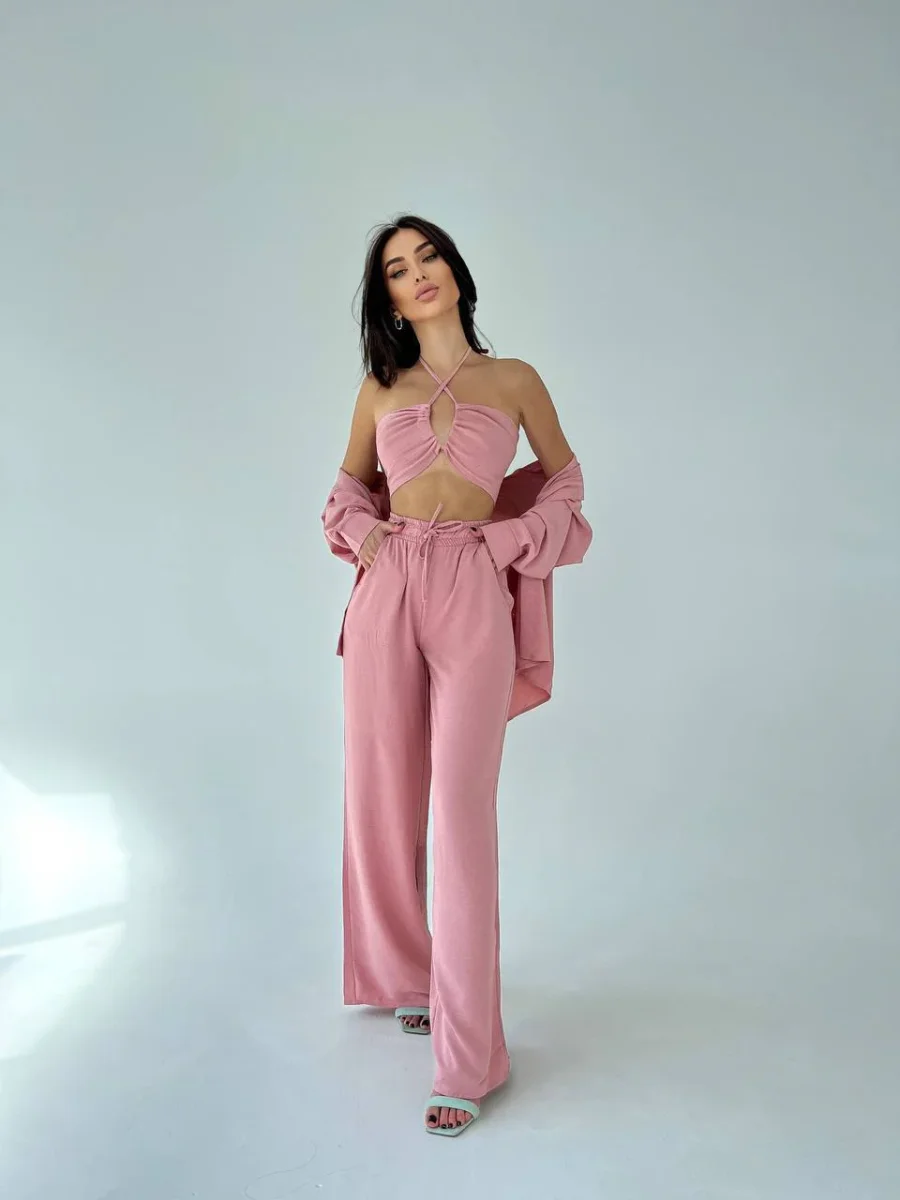 Set tre pezzi venduti singolarmente composto da camicia top e pantalone in tessuto leggero fresco.