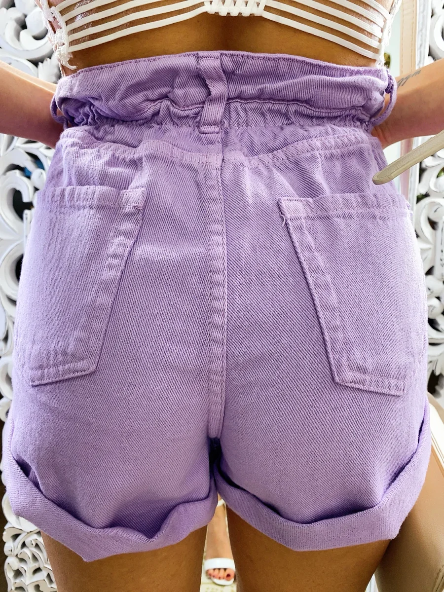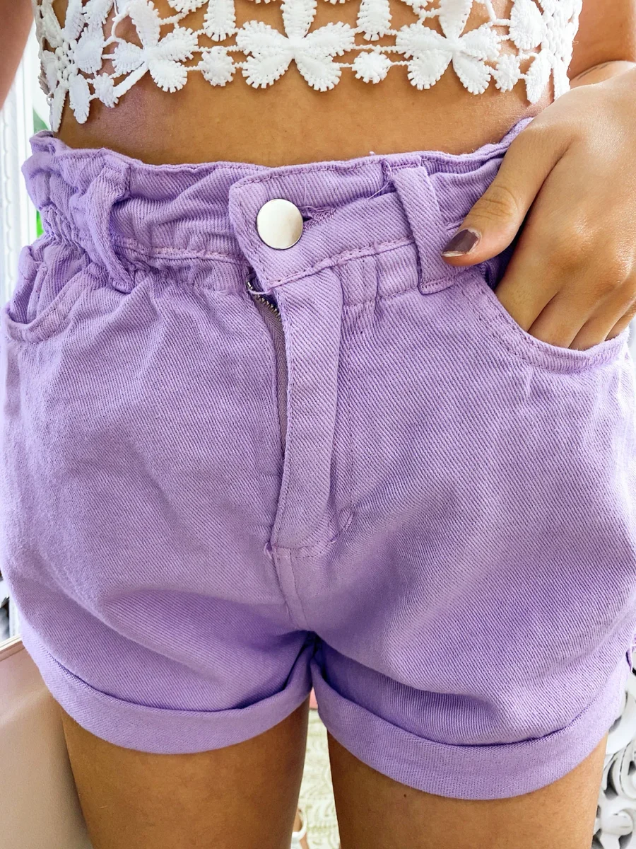 Short a caramella lilla, jeans elasticizzato ma comunque adatto a taglie molto piccole.