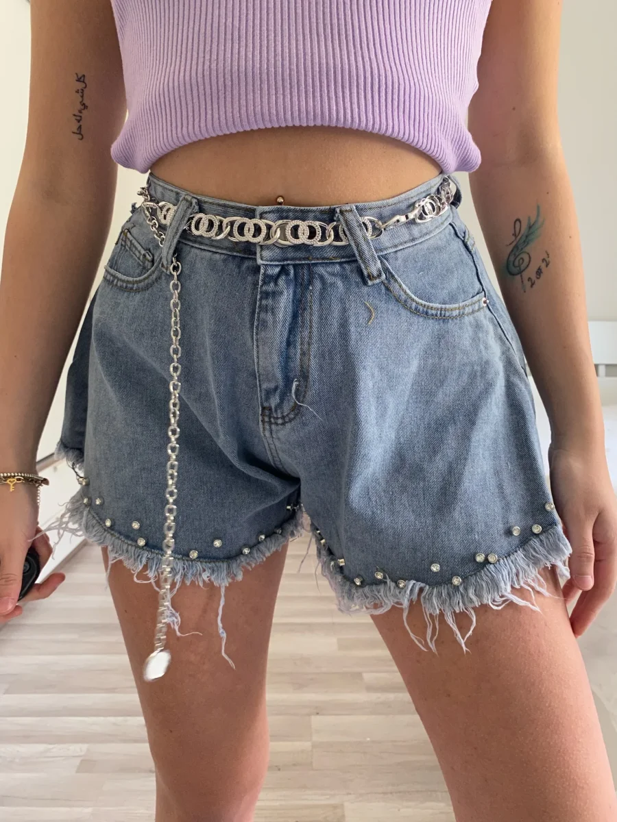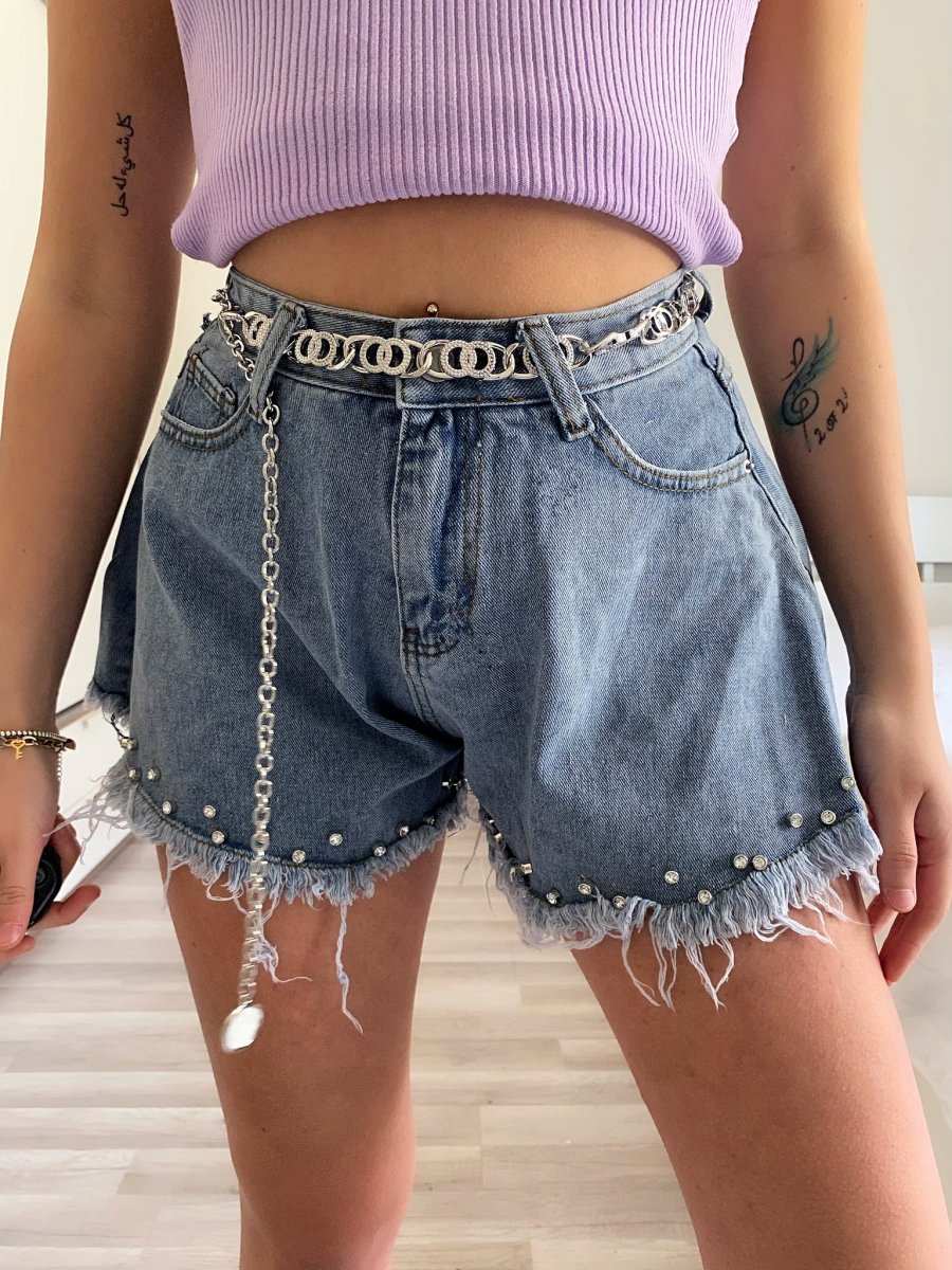 Short a farfalla poco elasticizzato con tasche e strass sul fondo. In foto taglia M