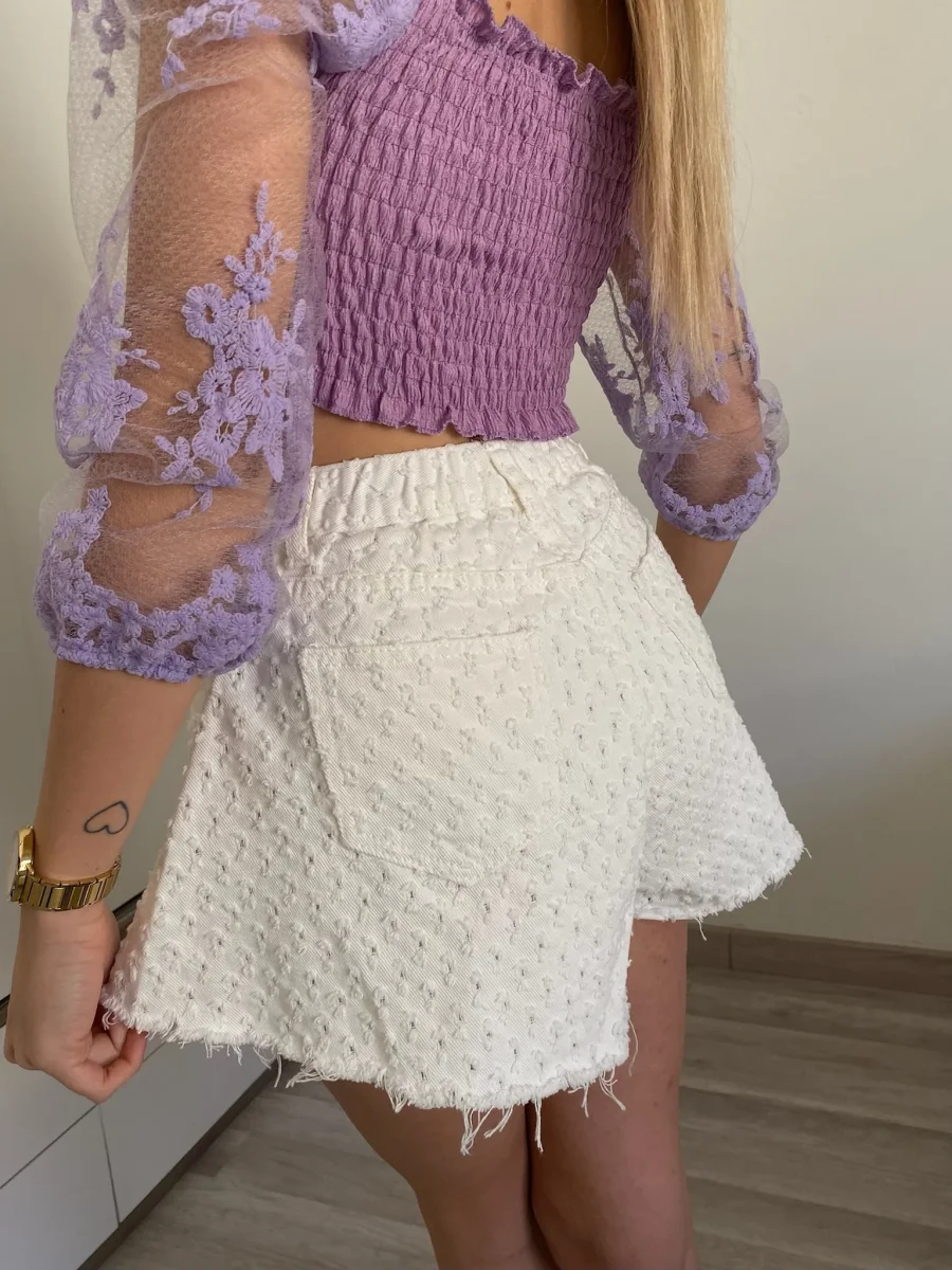 Short a farfalla in jeans bianco con mini strappetti. Vestibilità regolare