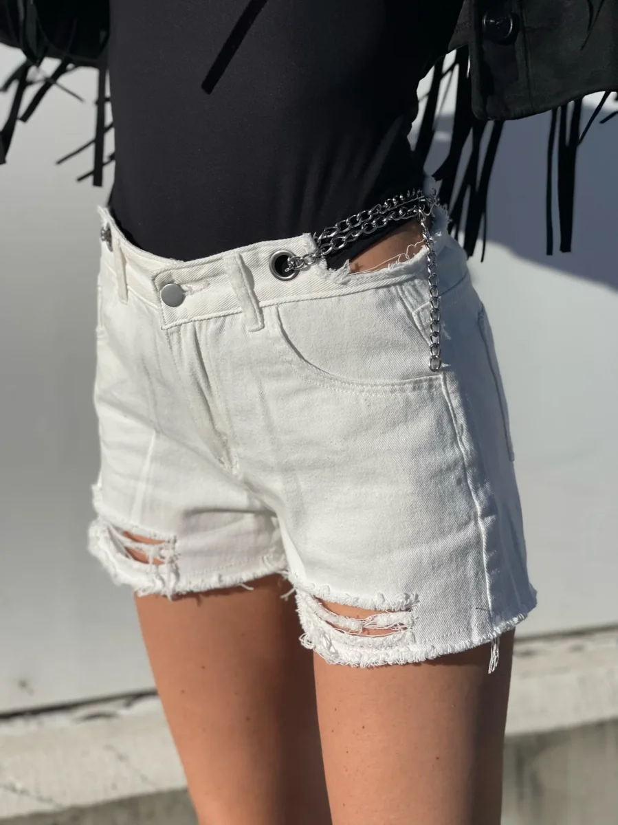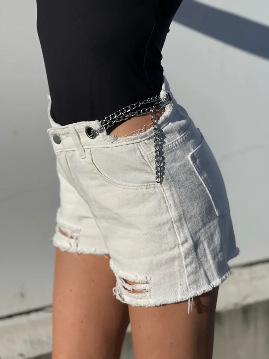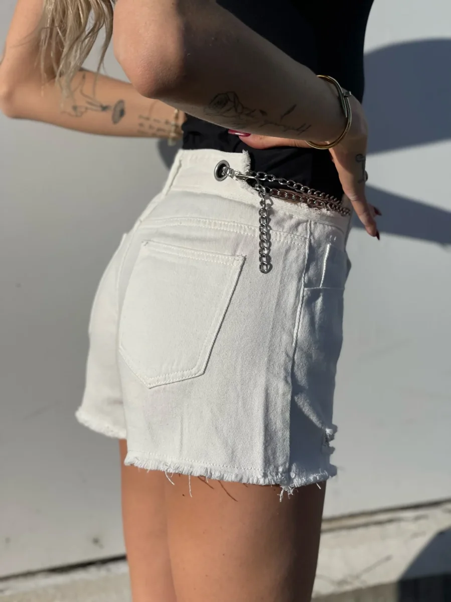 Particolarissimo Short in jeans bianco con catenine argento e vita completamente regolabile.