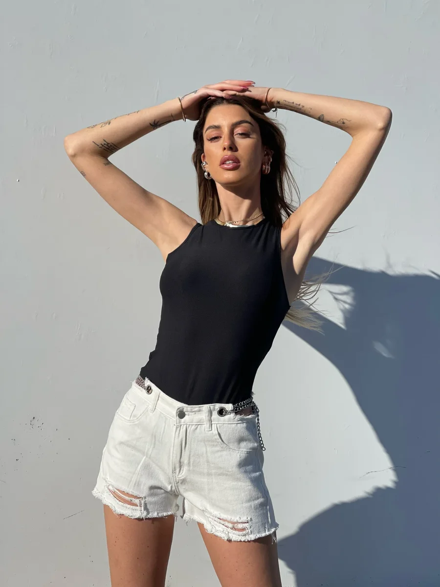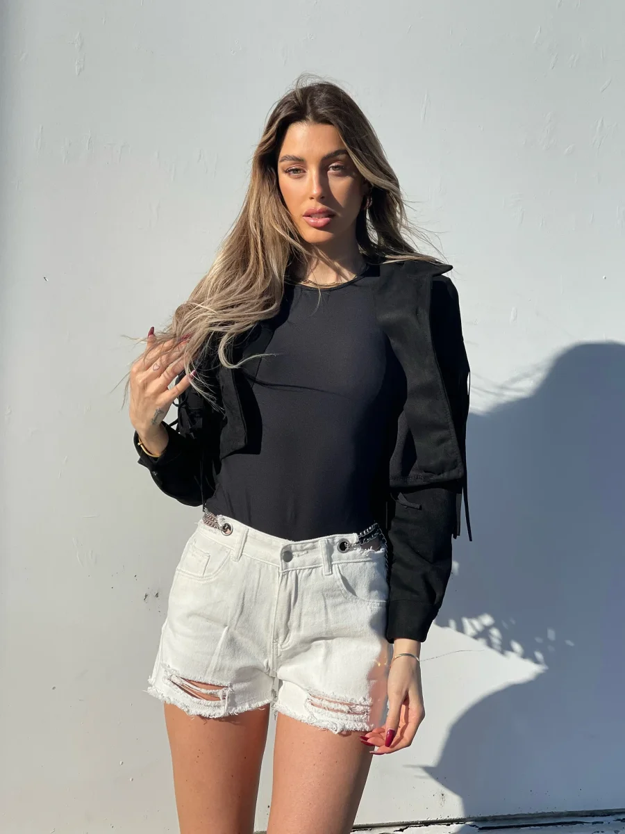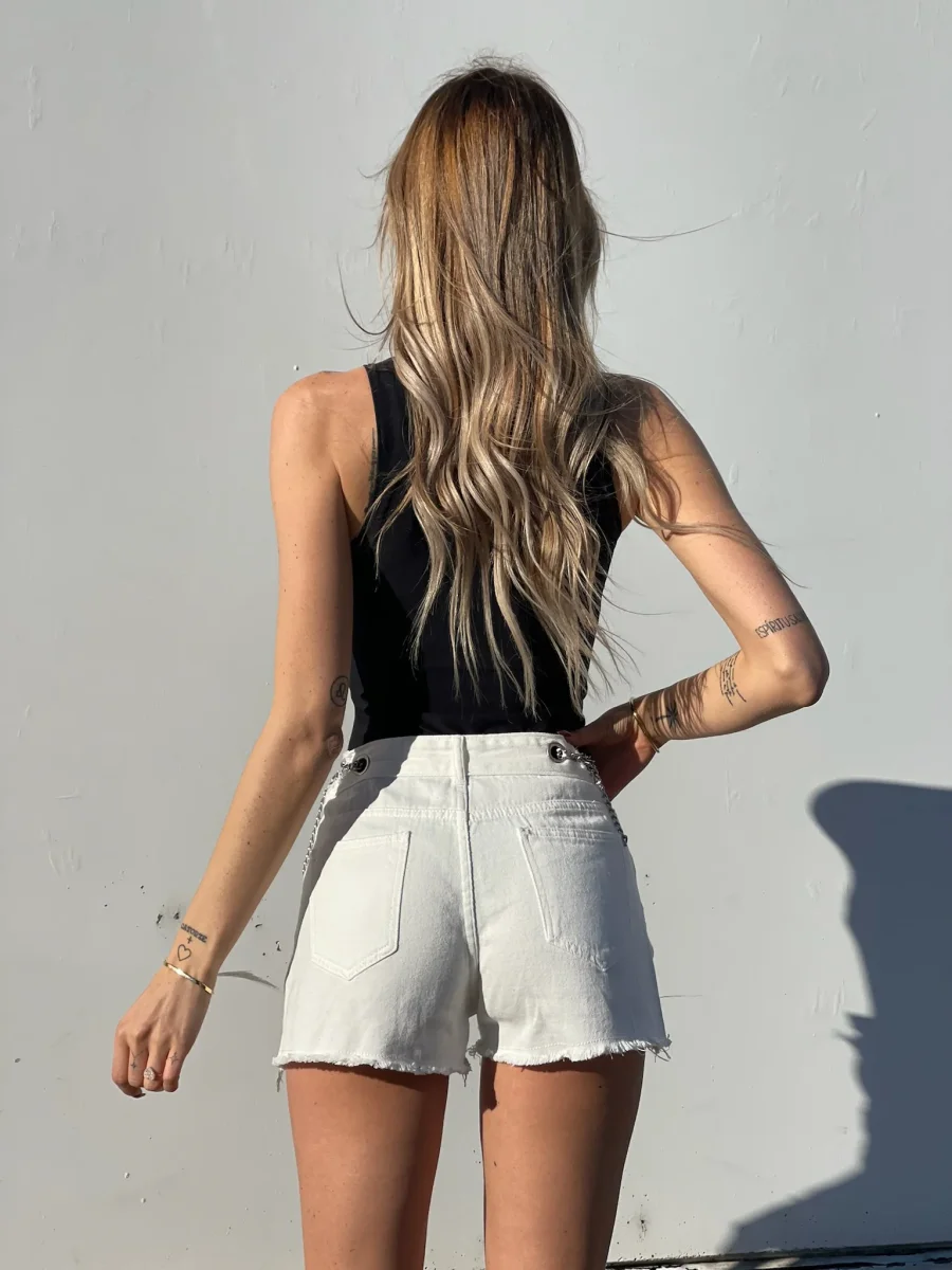 Particolarissimo Short in jeans bianco con catenine argento e vita completamente regolabile.