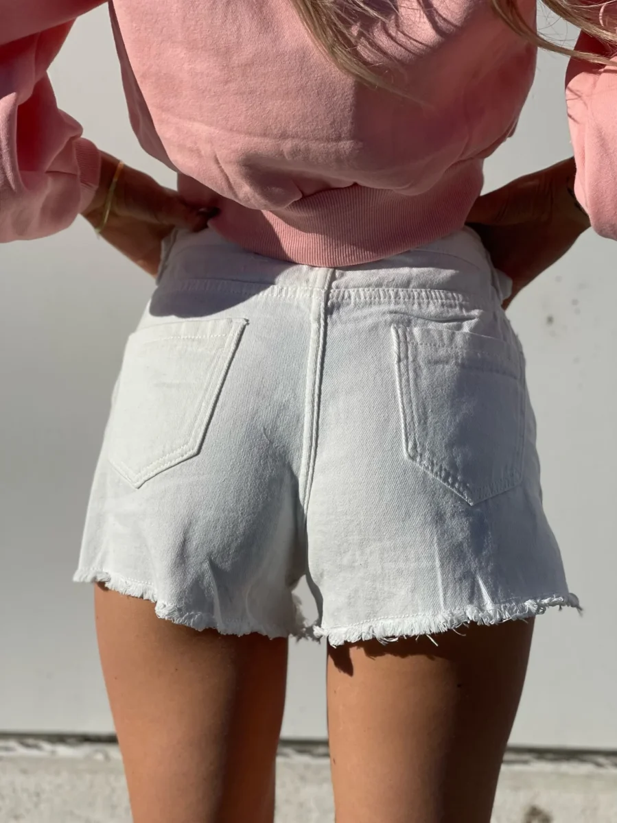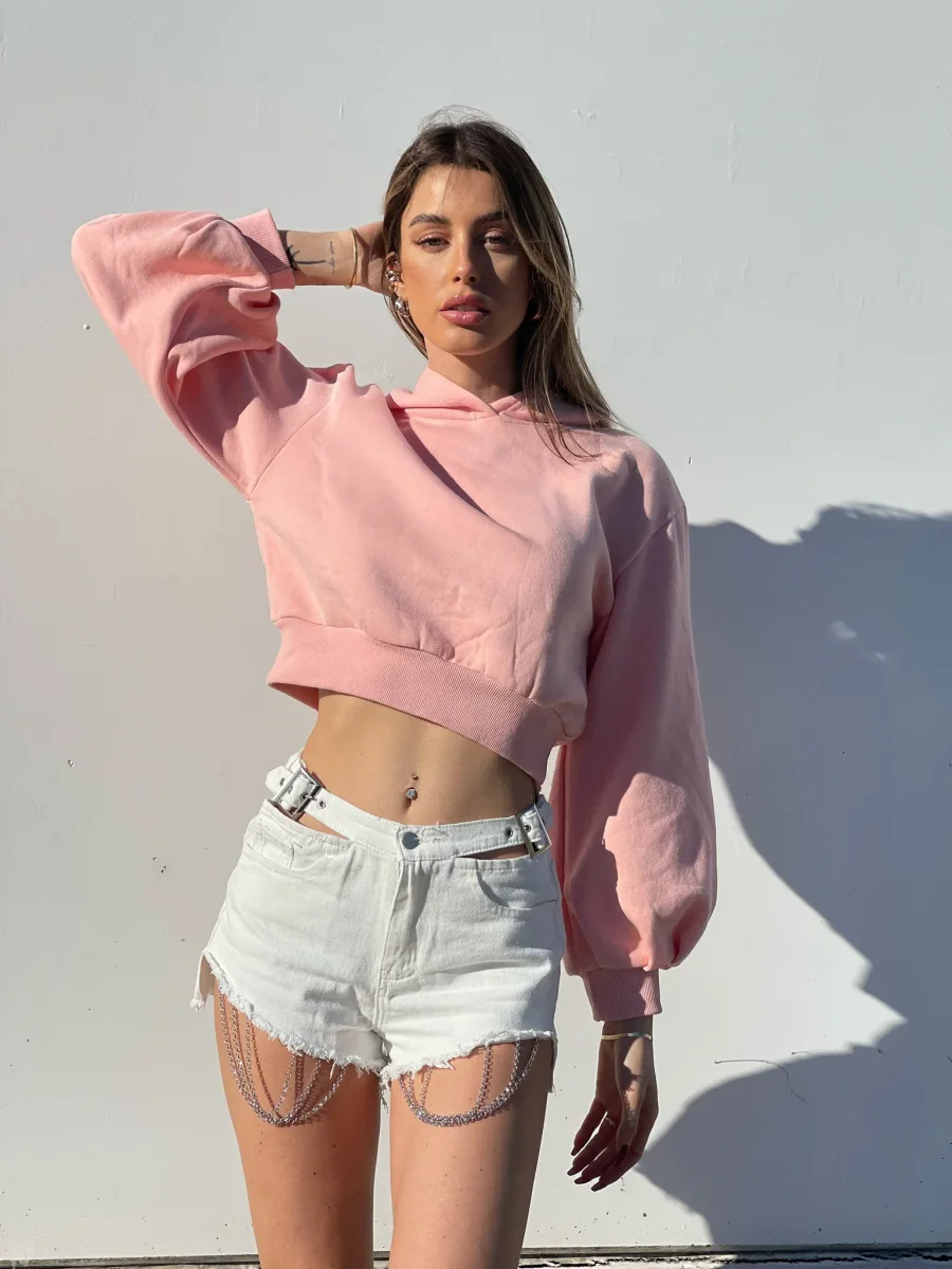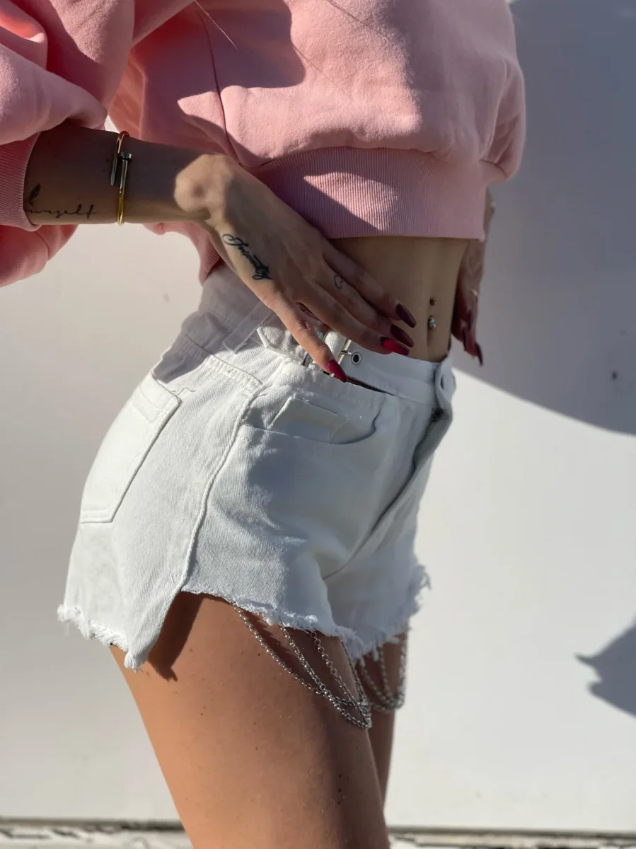 Particolarissimo Short in jeans bianco con catenine argento e vita completamente regolabile con 4 diverse larghezze