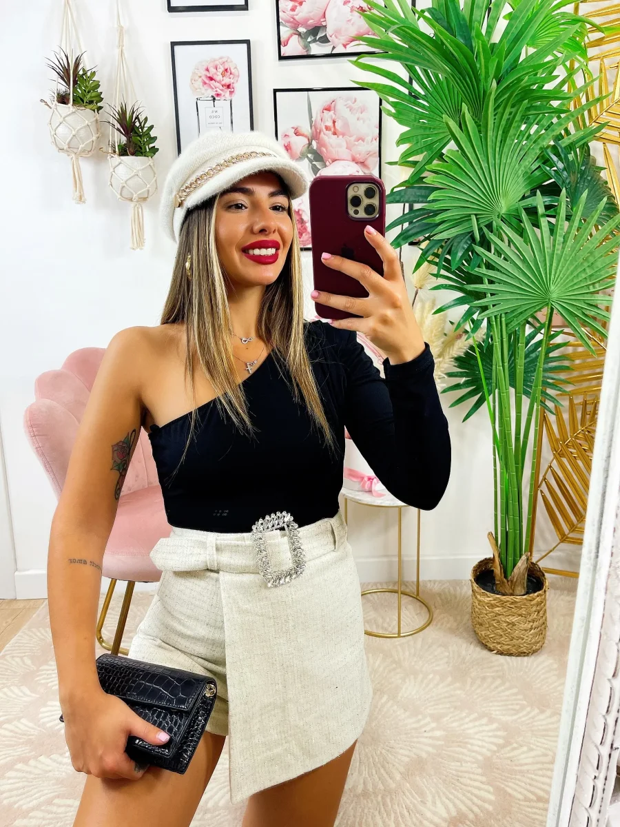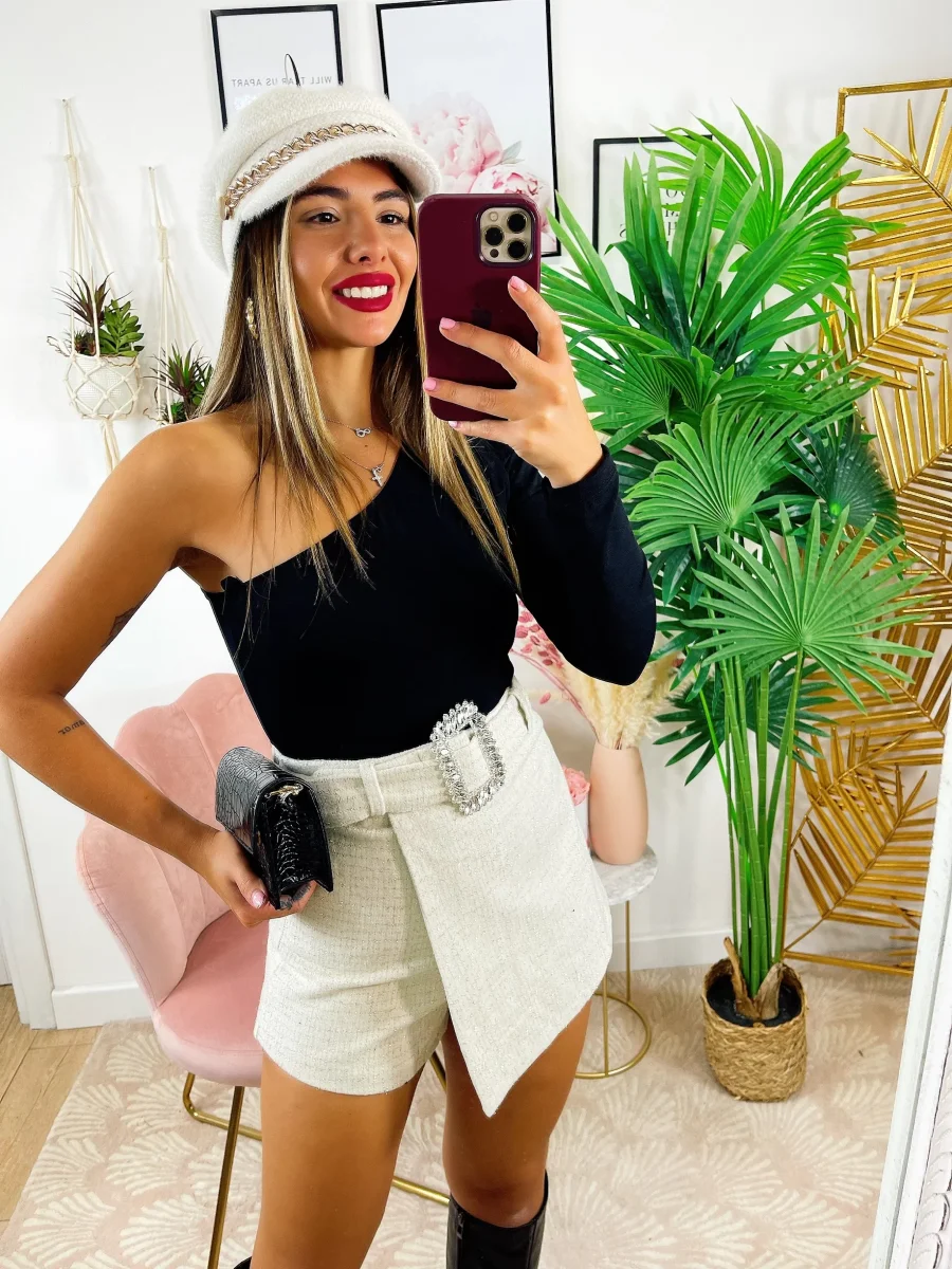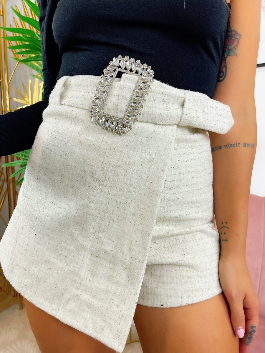 Short glitterato con cintura gioiello, leggermente elasticizzato, vestibilità piccola.