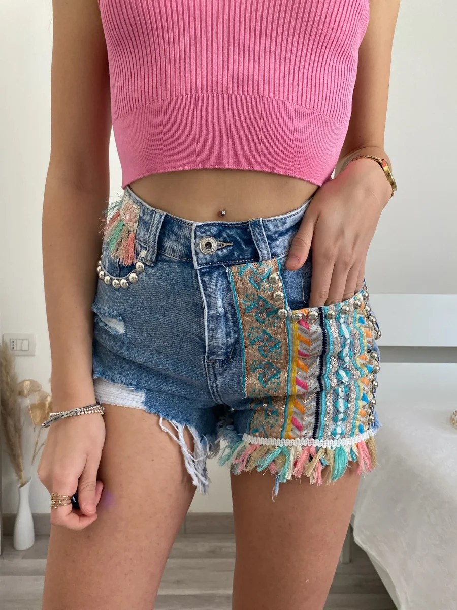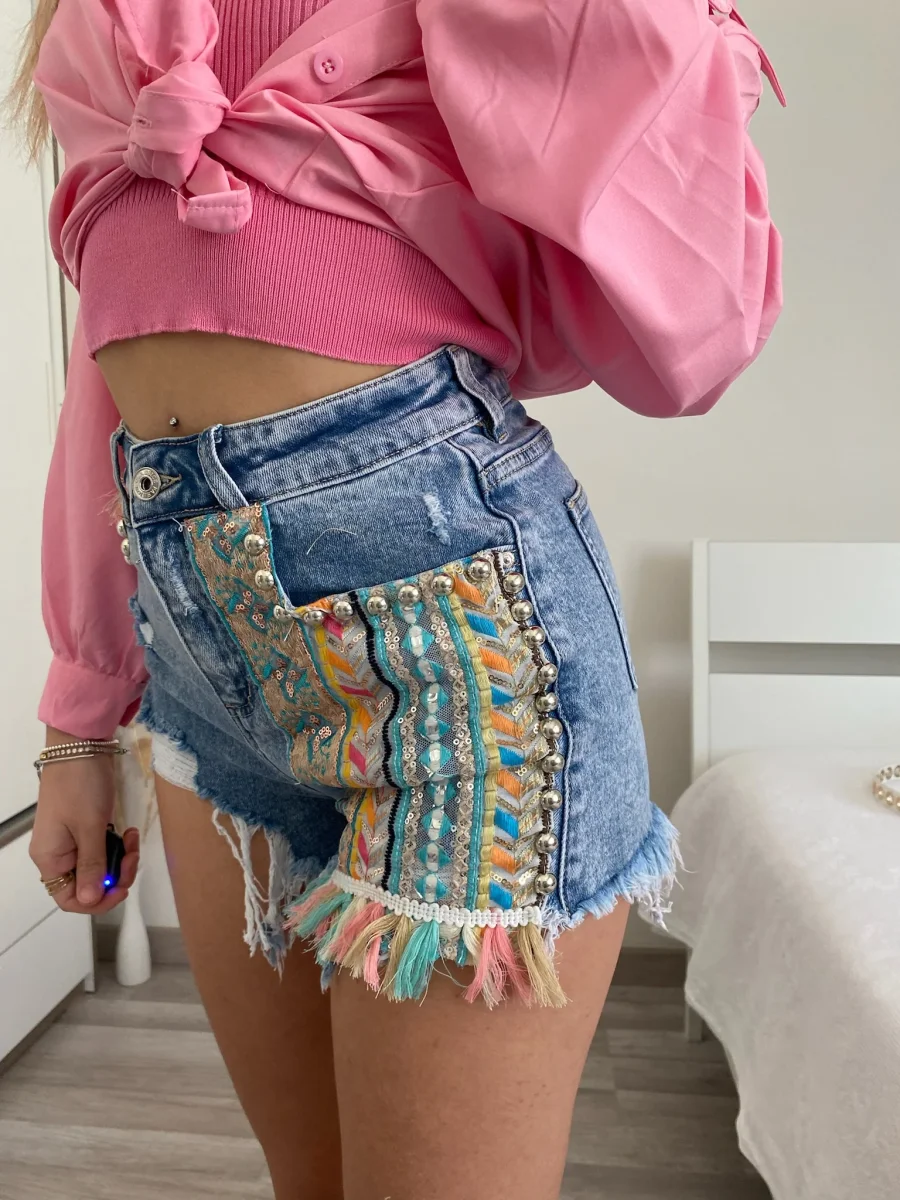 Short in jeans super colorato con borchie e paillettes. Modello corto e elasticizzato
