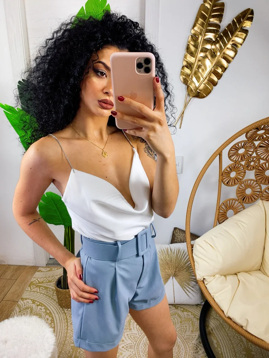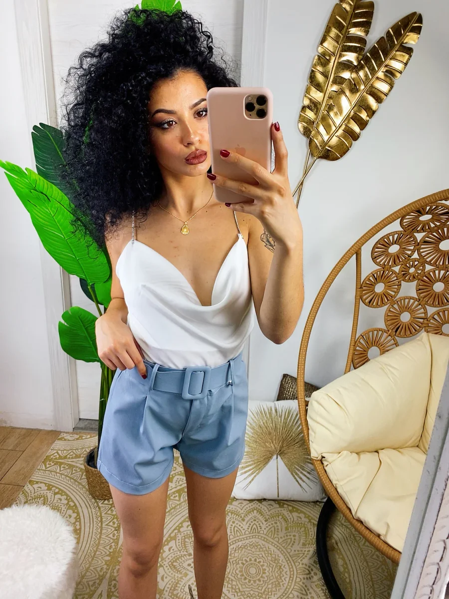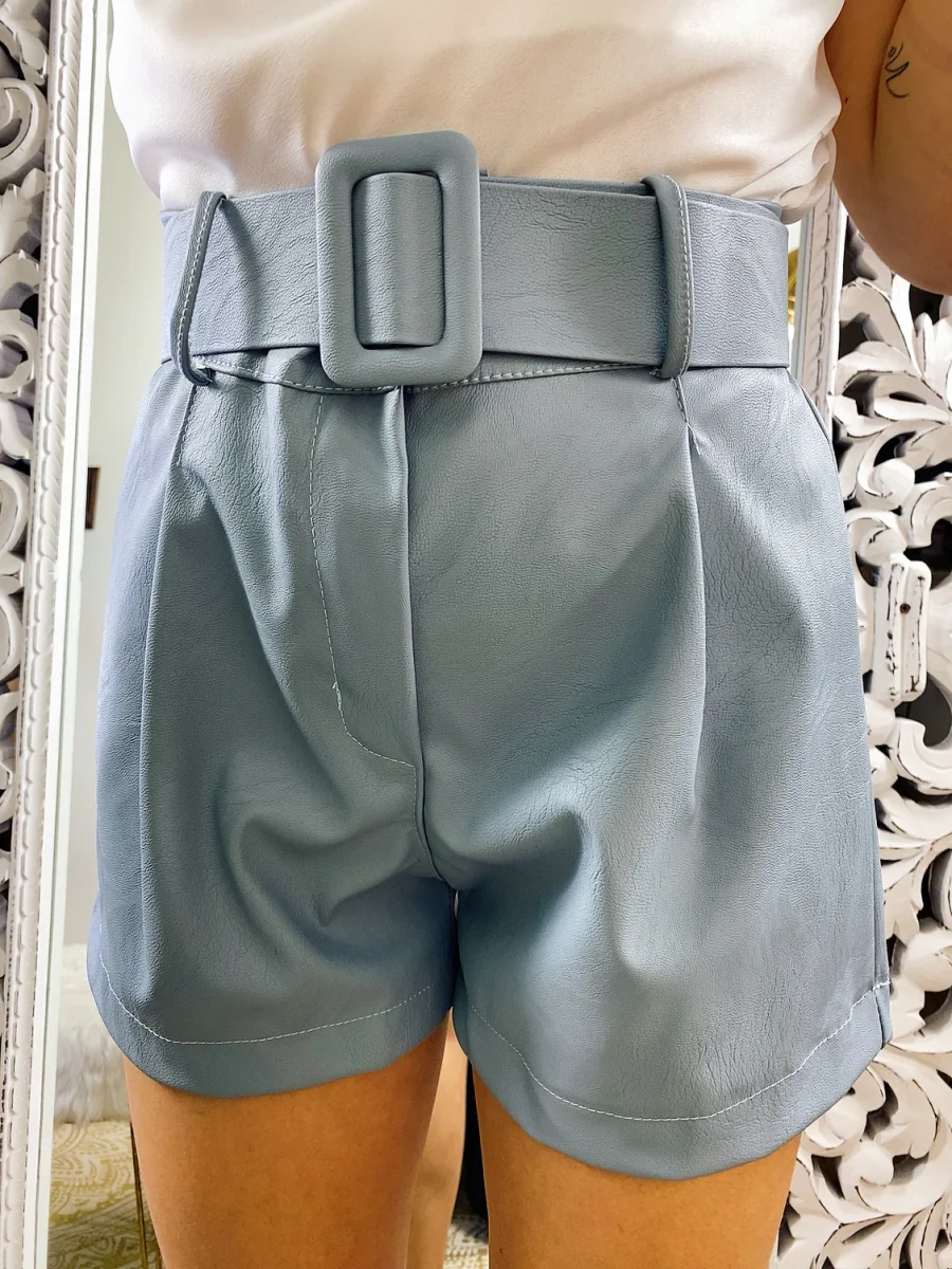 Short con cintura color carta da zucchero. Chiusura con bottone e zip. Tessuto eco-pelle