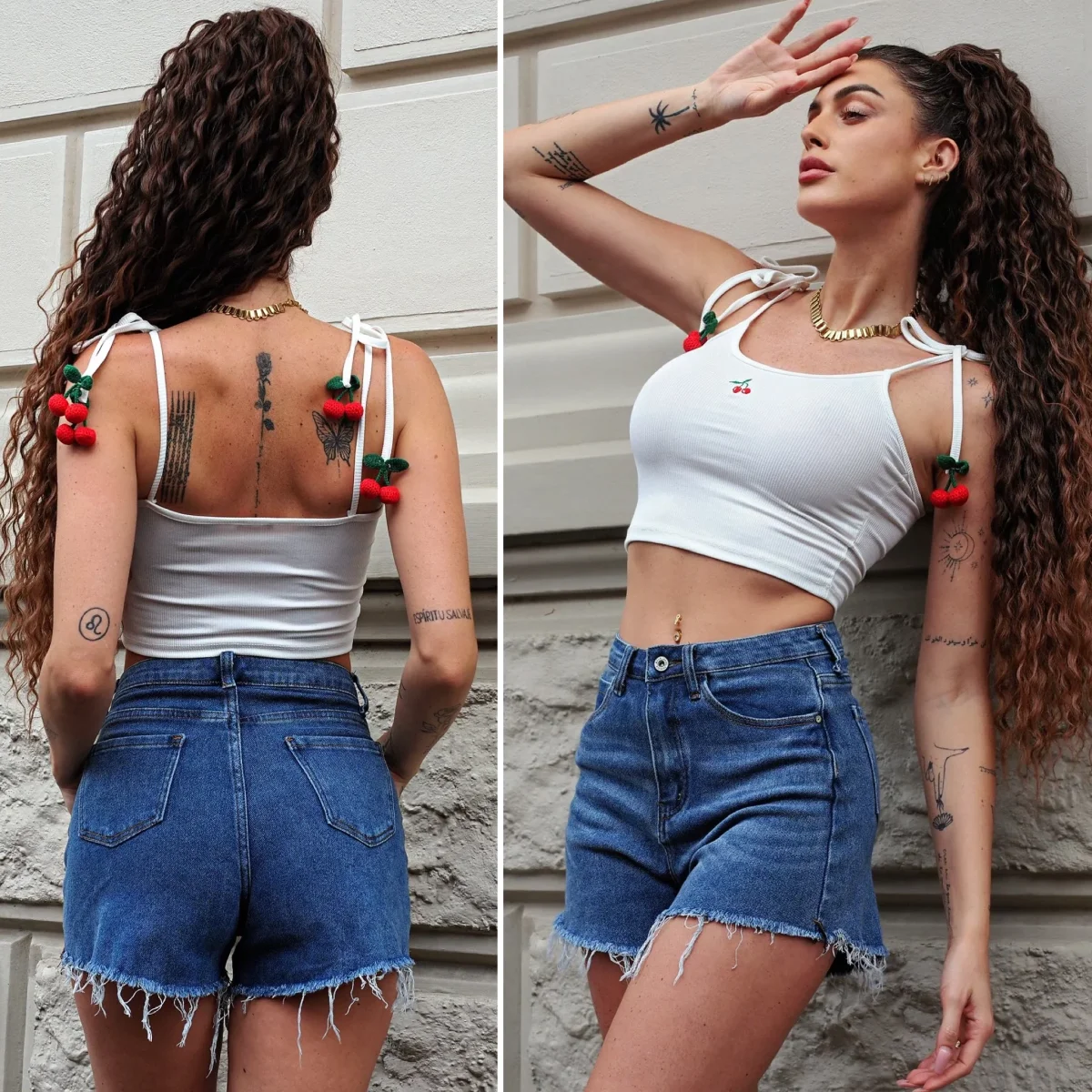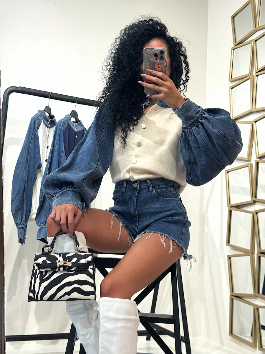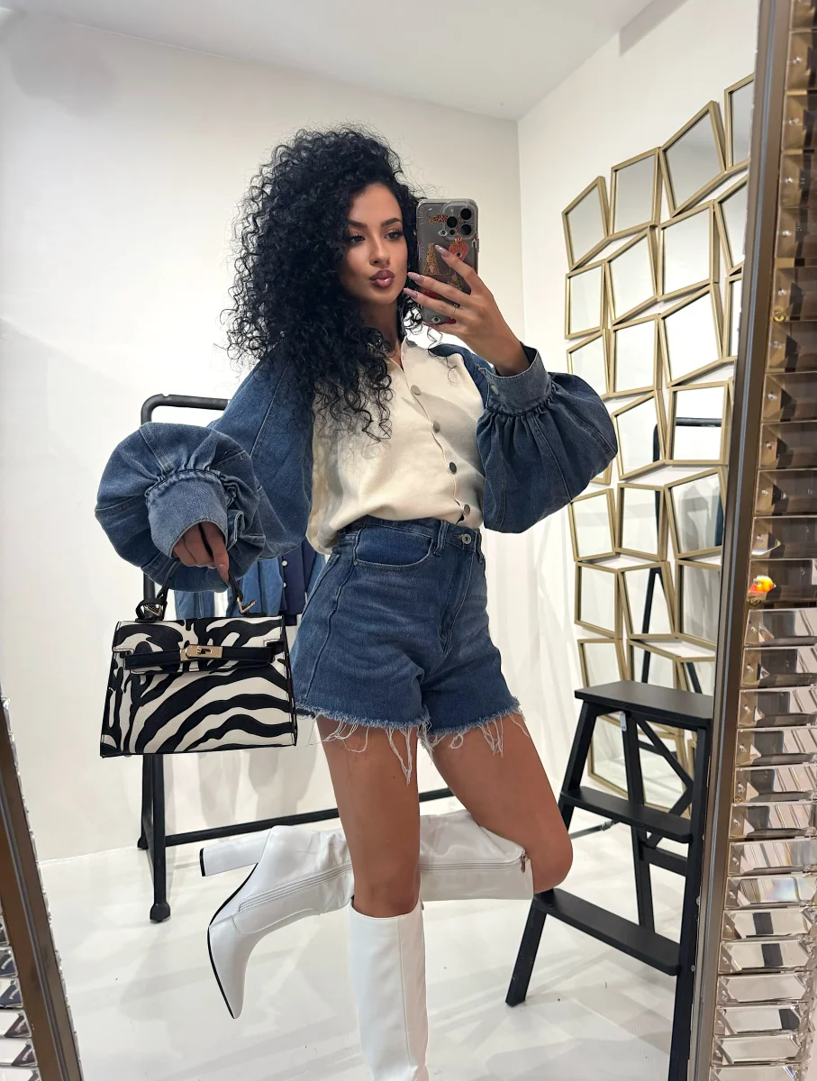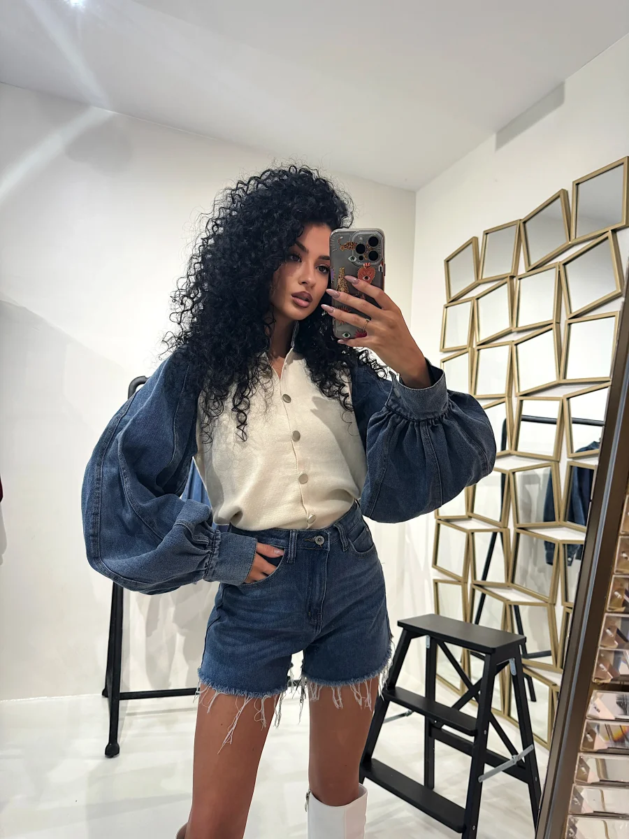Short in jeans basico con frangia, tasche in dettaglio. Modello elasticizzato. La modella indossa XS