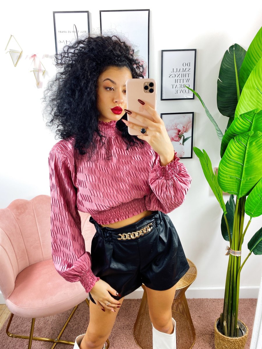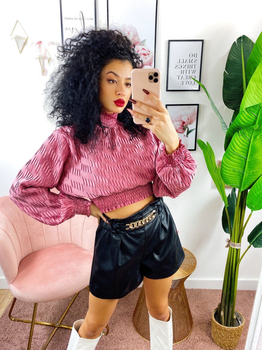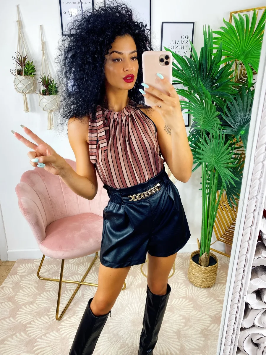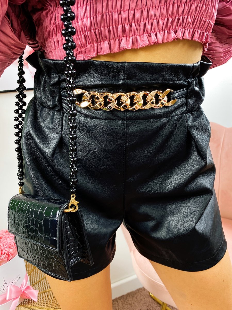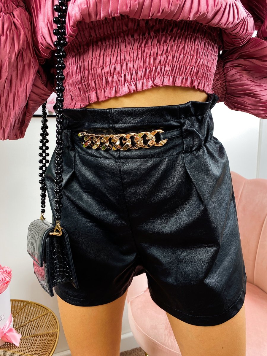 short in eco-pelle con catena elasticizzato in vita.