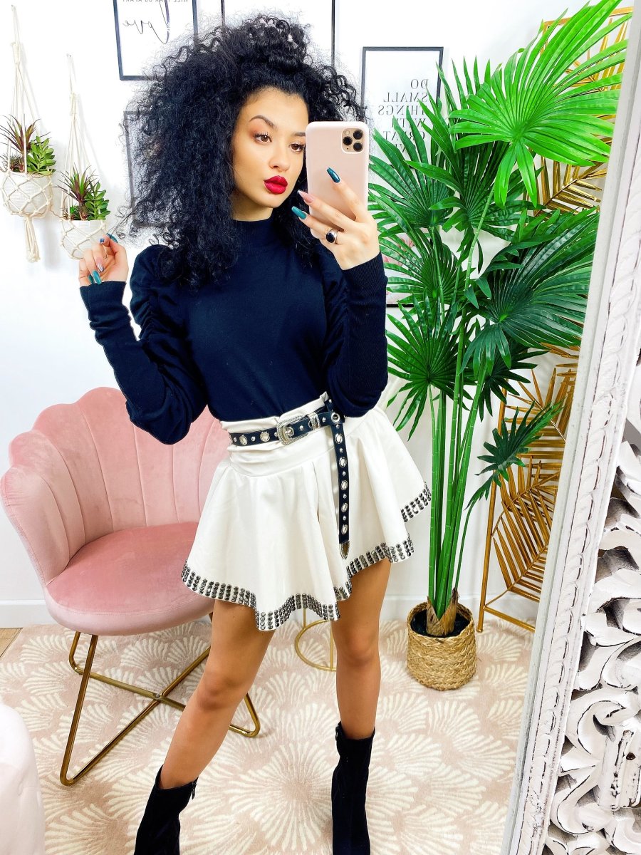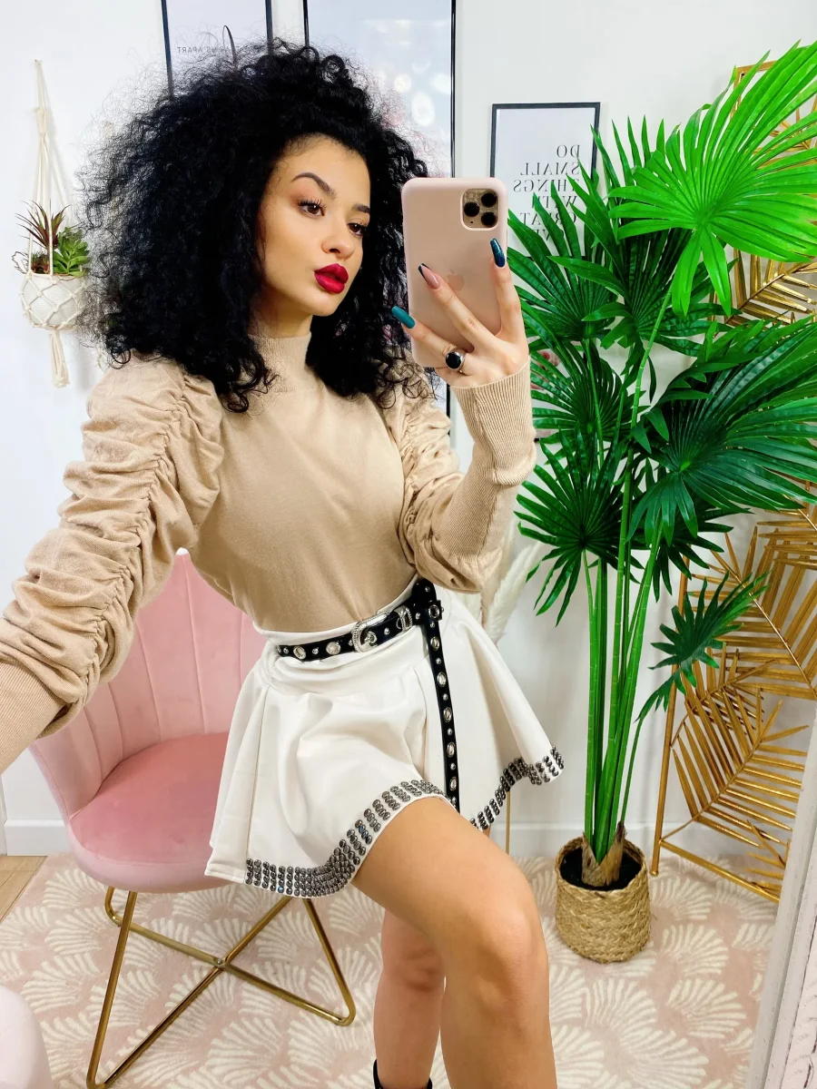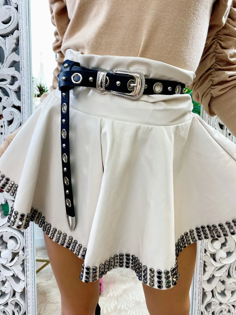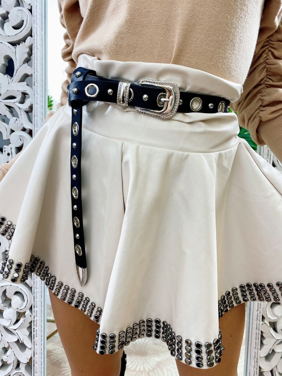 Short in ecopelle bianco con borchie, leggermente elasticizzato con zip posteriore per chiuderlo.