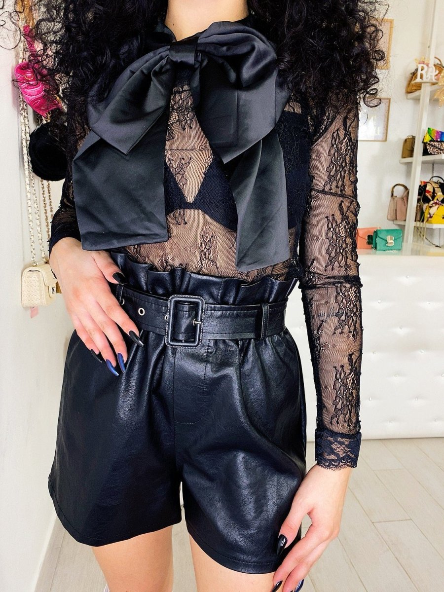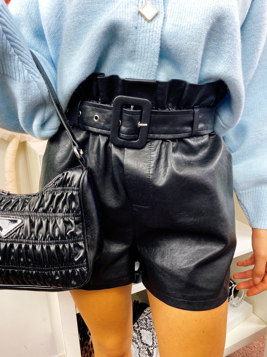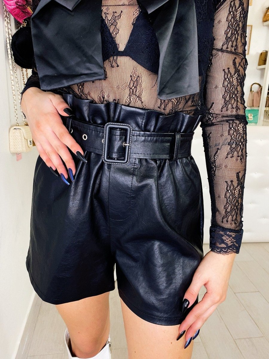 Short in ecopelle con vita arricciata. Cintura inclusa vestibilità piccola