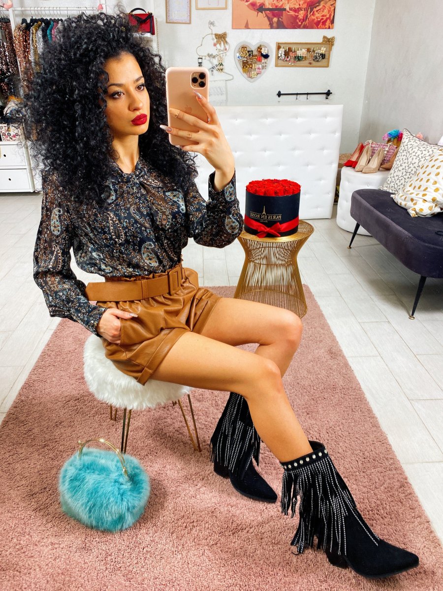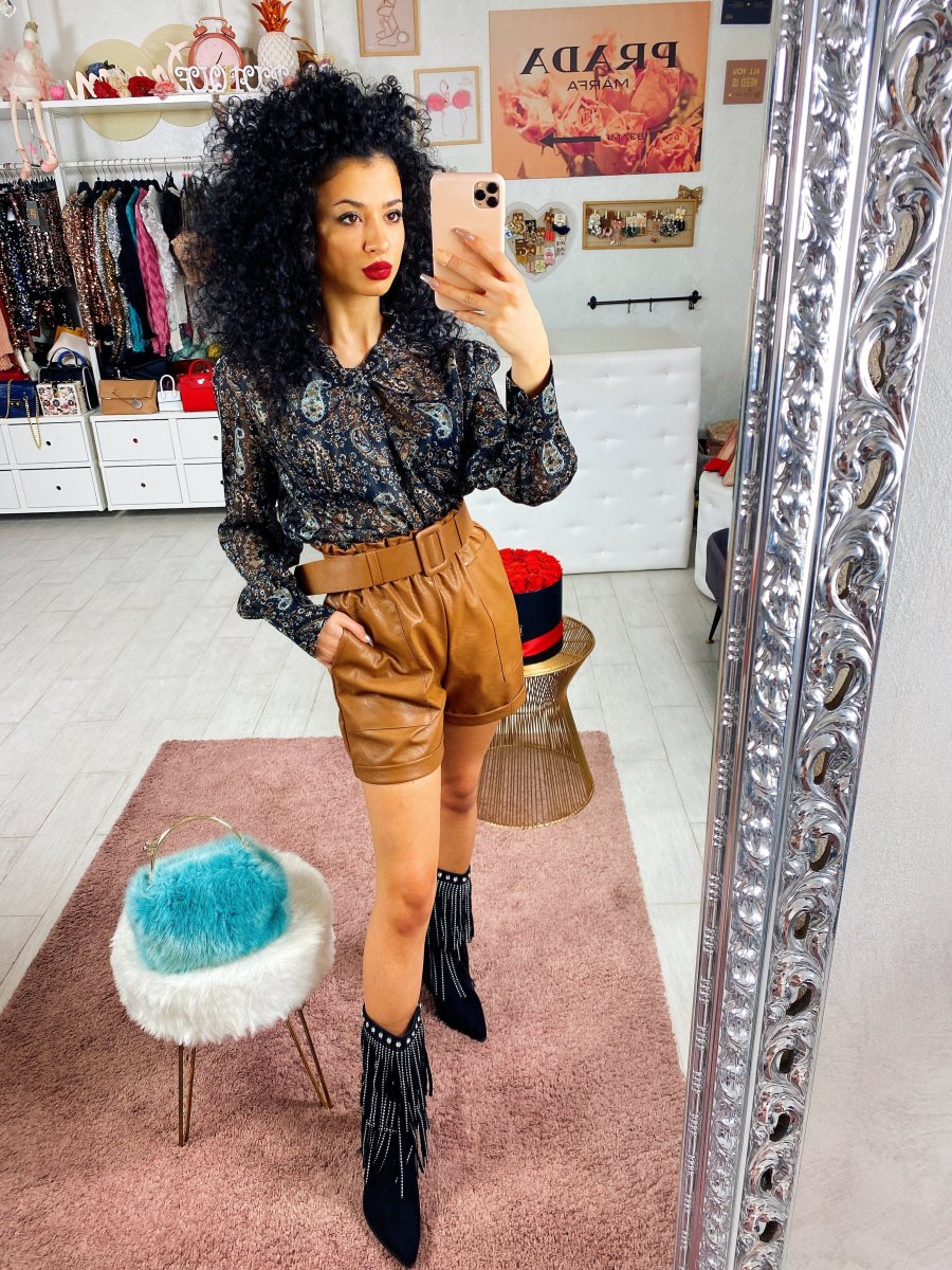 Short in ecopelle incluso di cintura. Tessuto elasticizzato in vita.