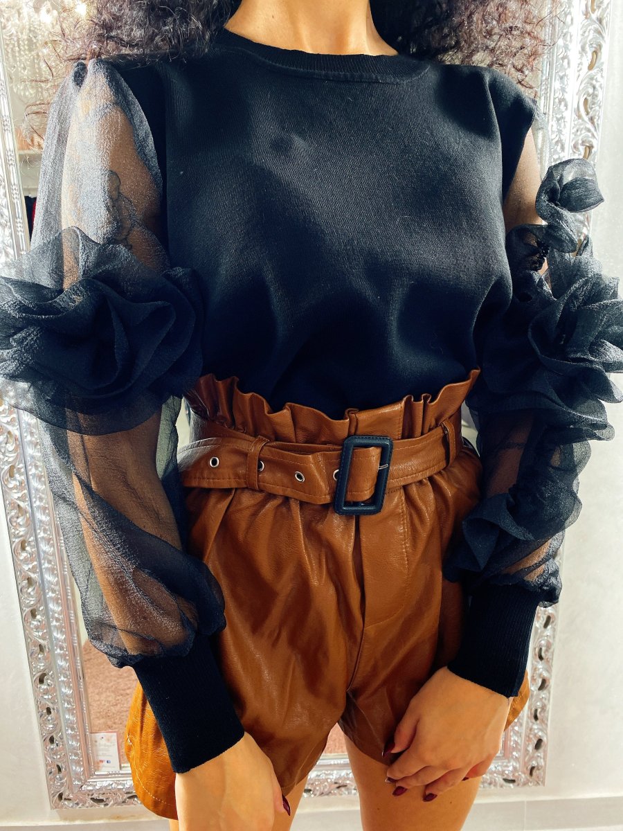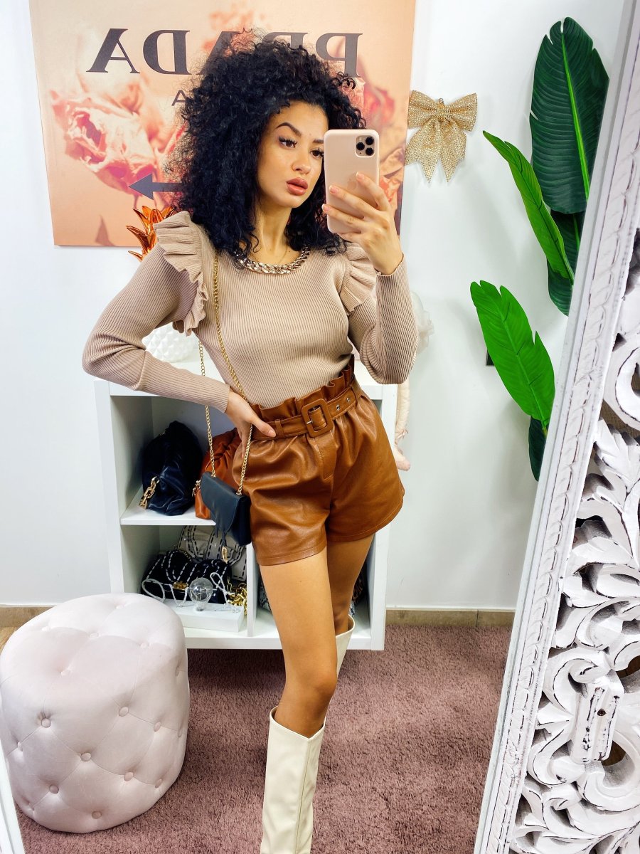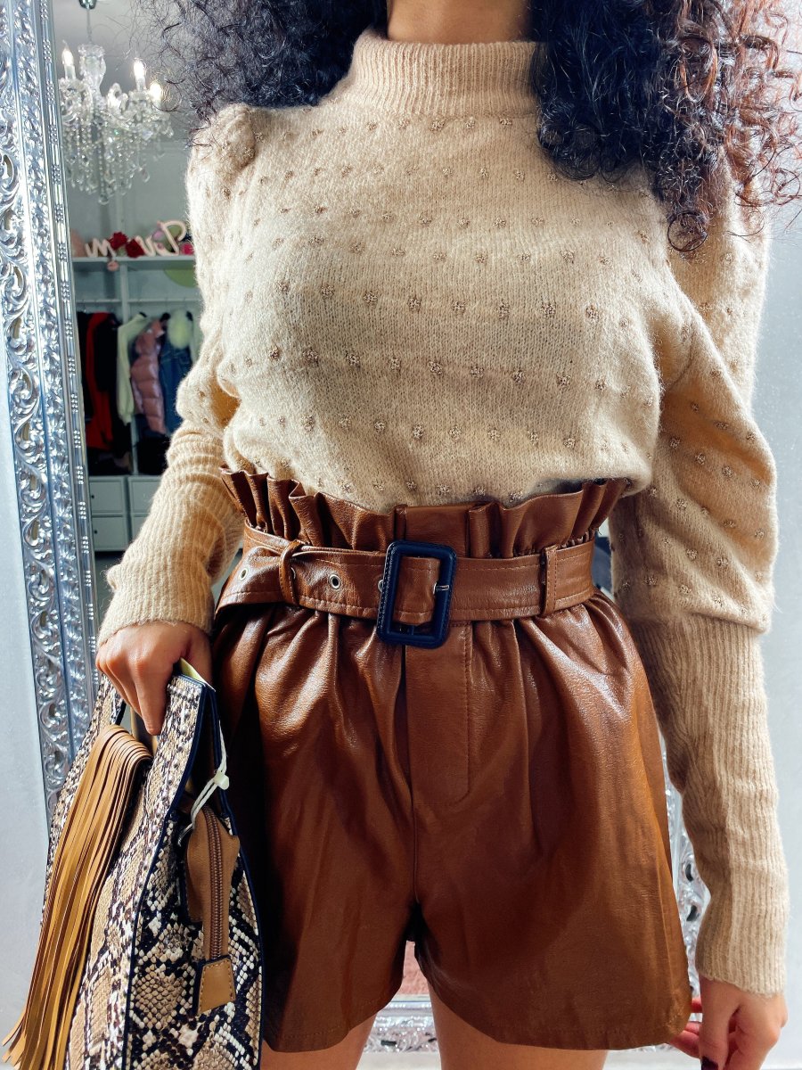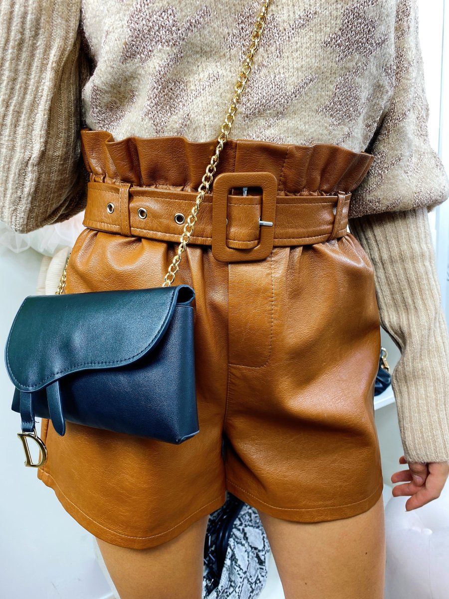 Short in ecopelle con vita arricciata. Cintura inclusa vestibilità piccola