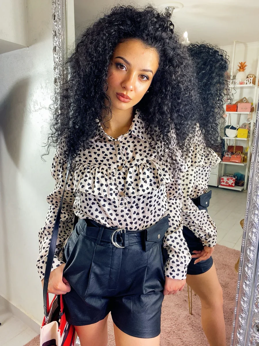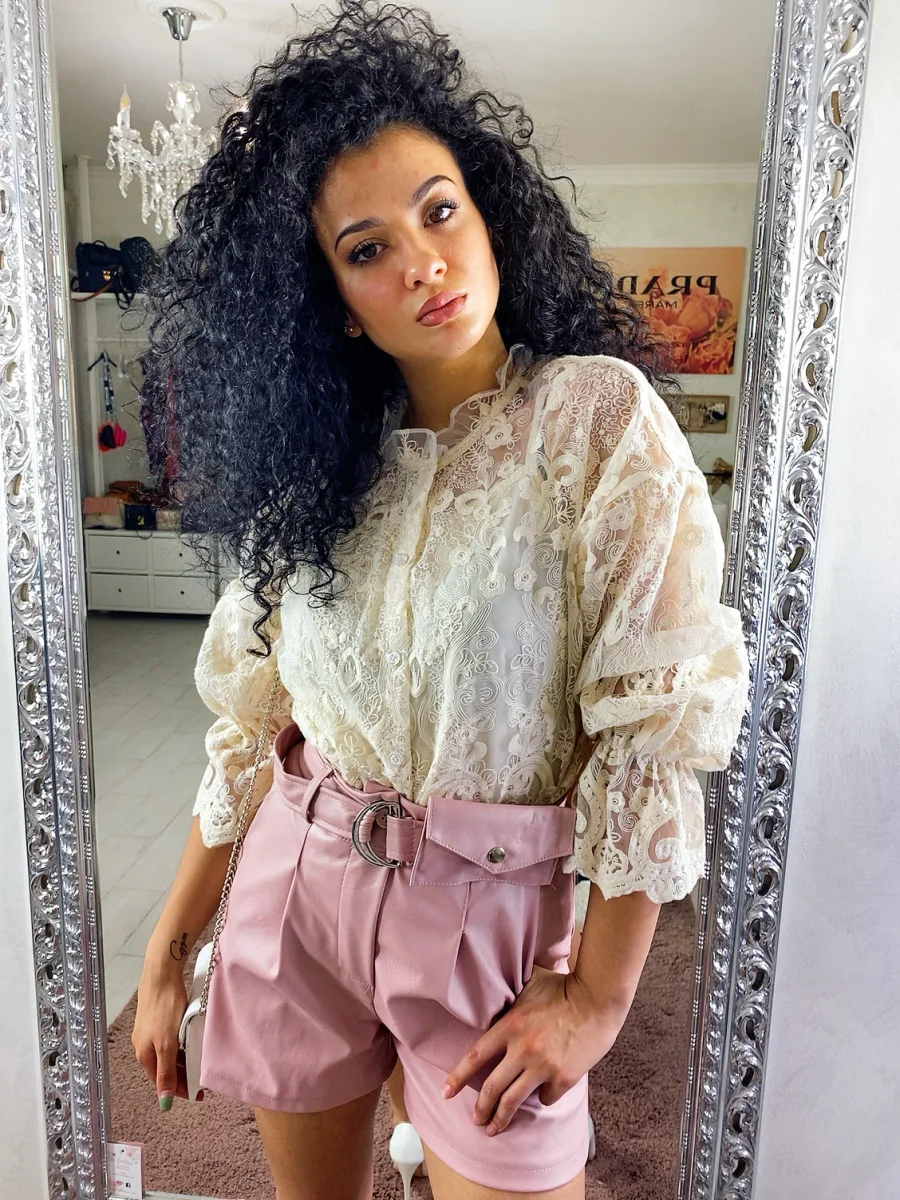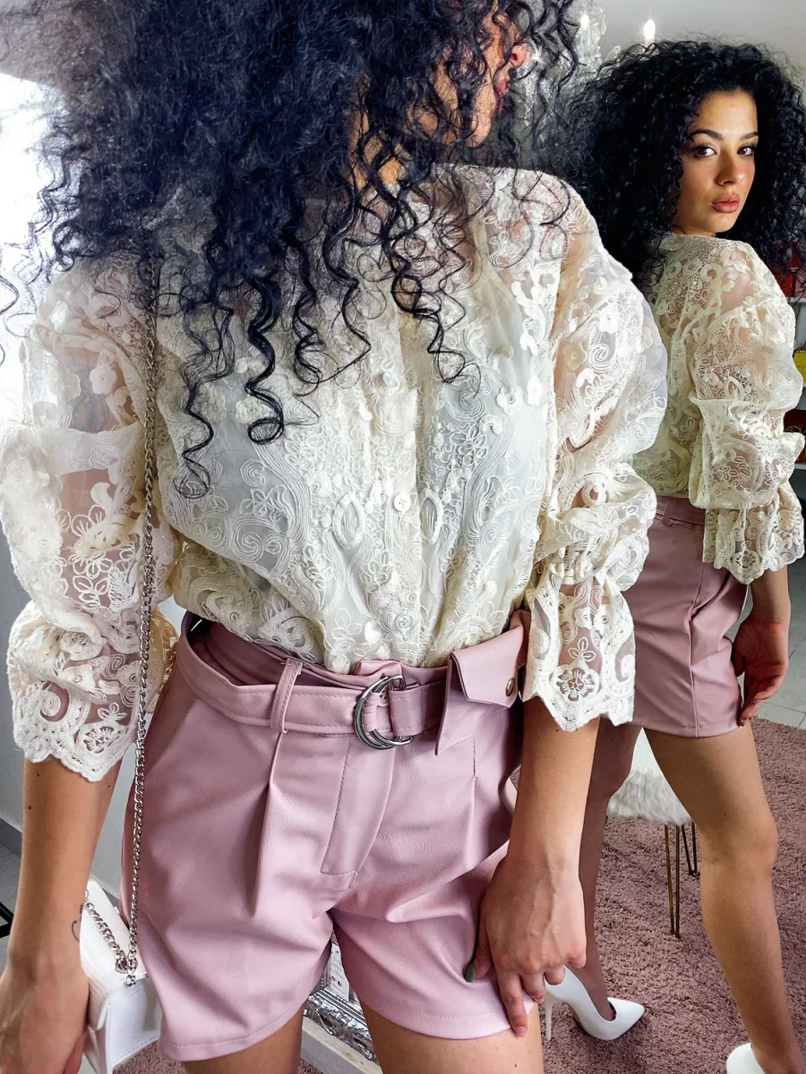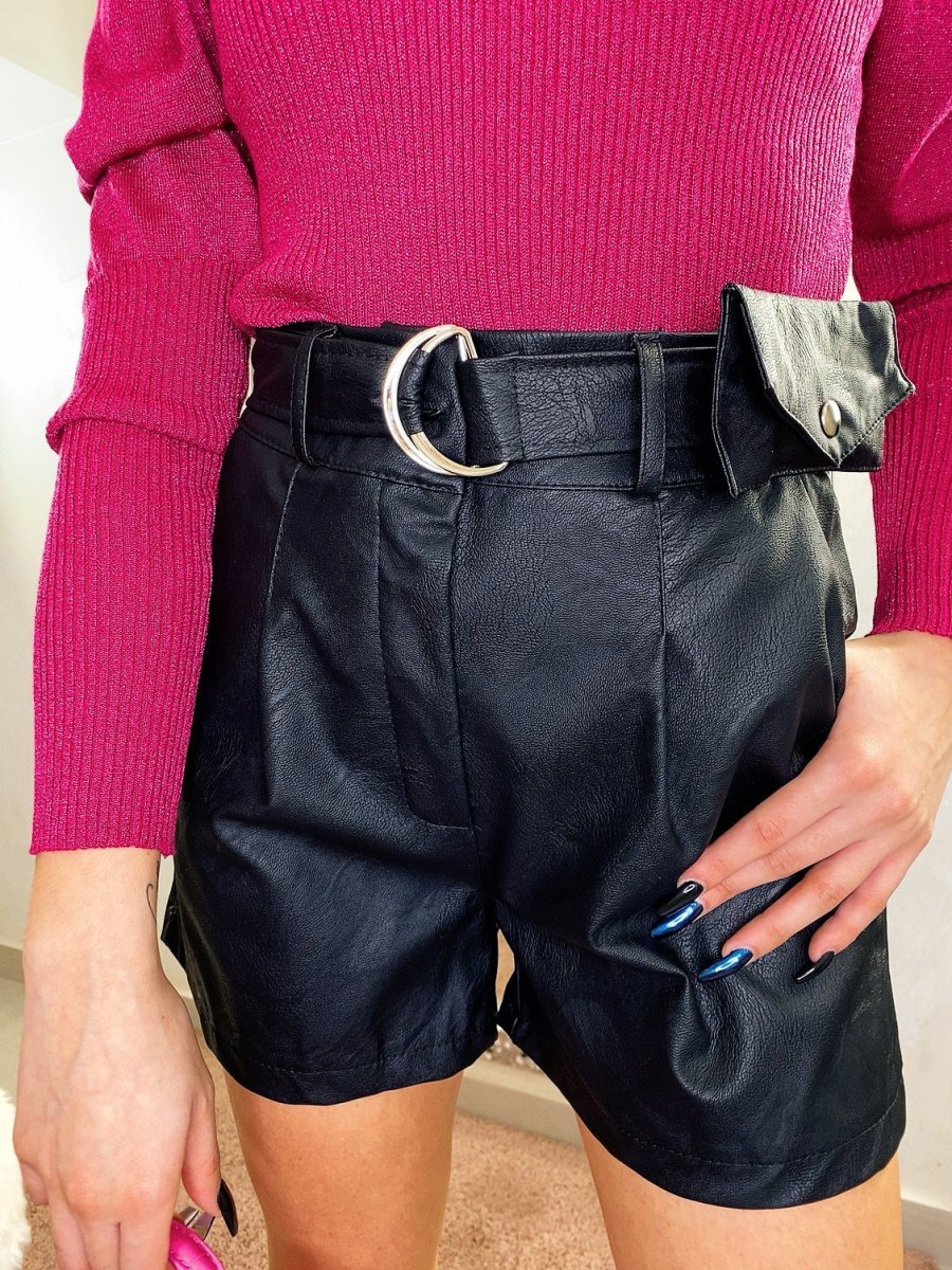 Short in ecopelle con cinturino e mini marsupio. Tessuto leggermente elasticizzato