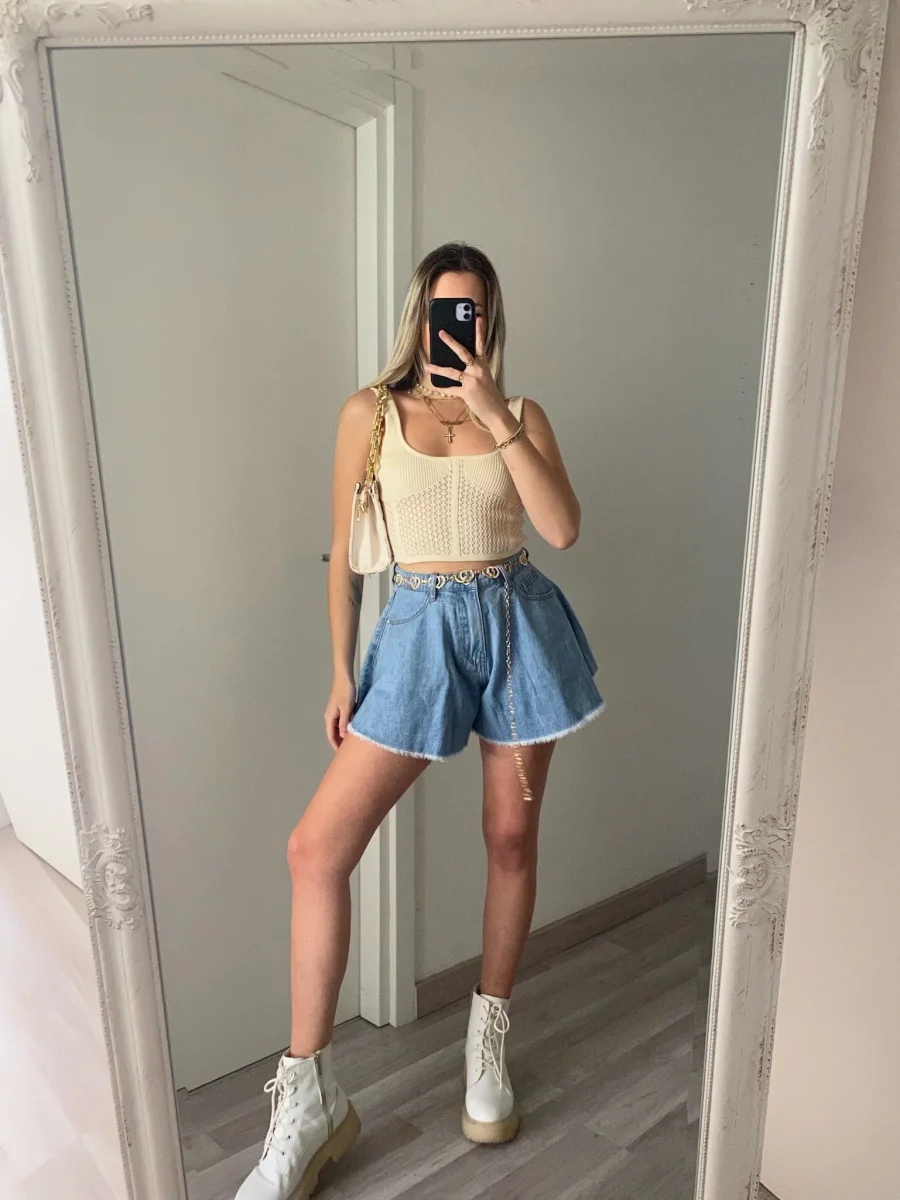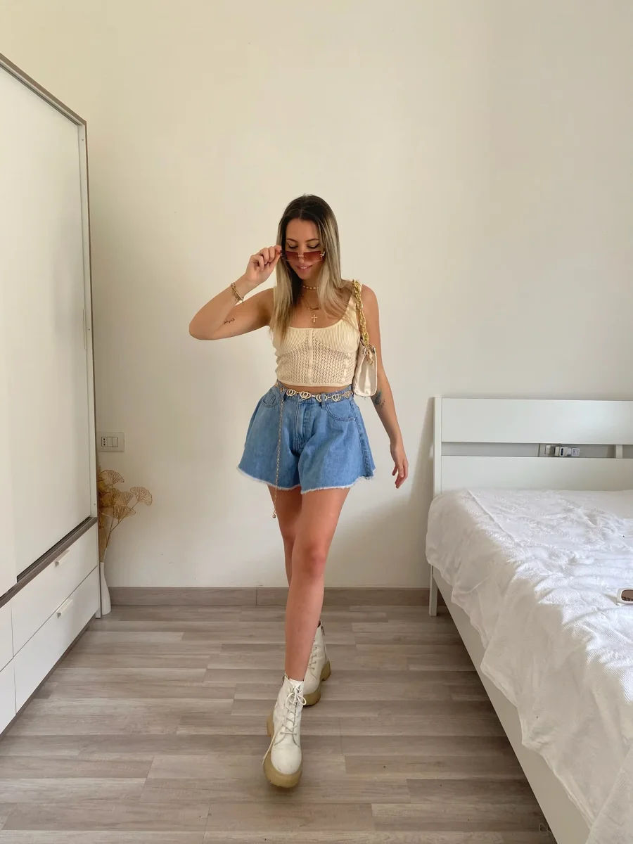 Short in jeans con strappi e strass sulle tasche. In foto taglia M