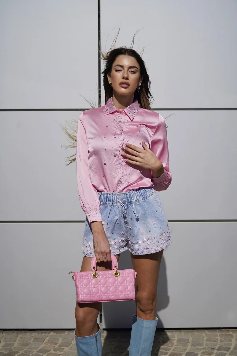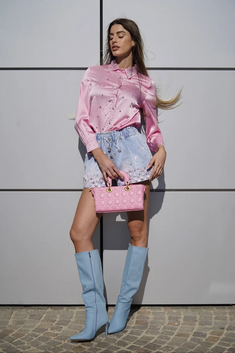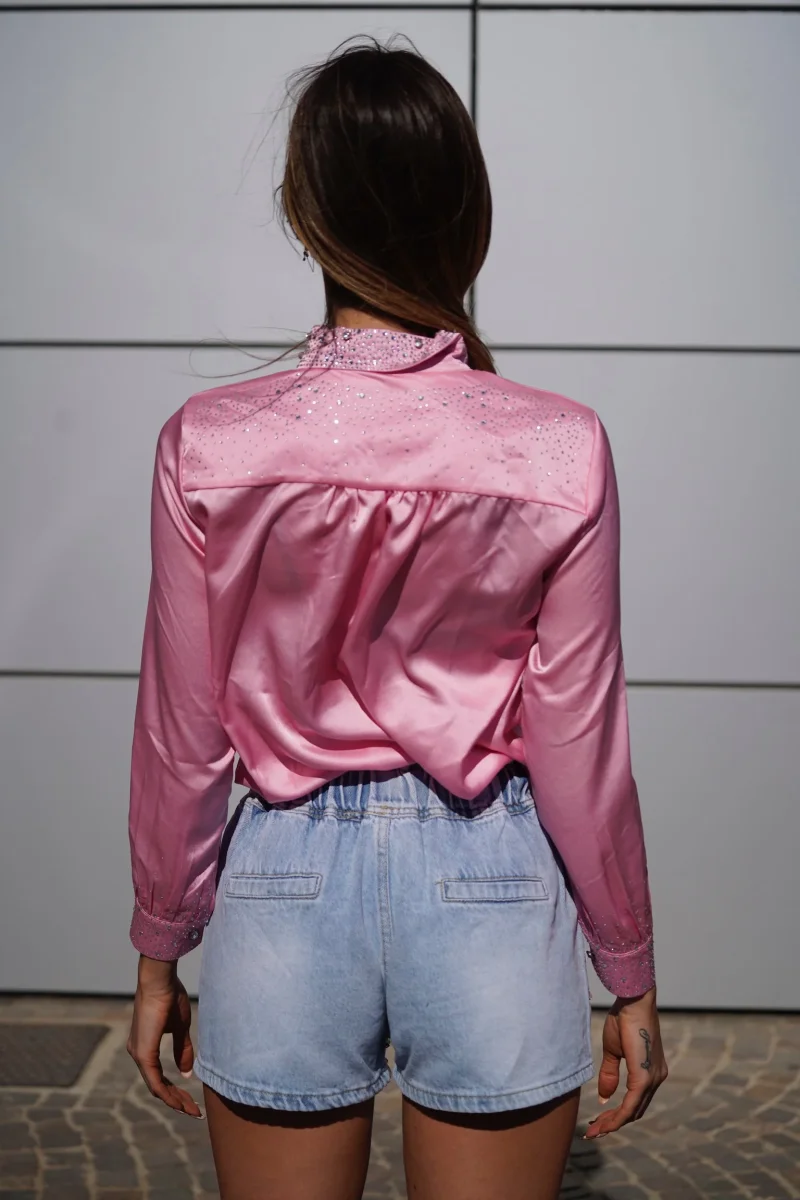 Short in jeans a caramella con elastico doppio in vita. Dettagli in strass