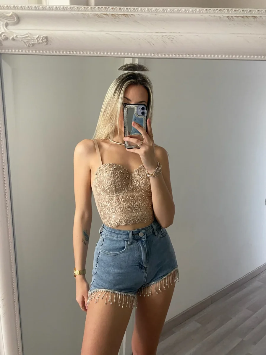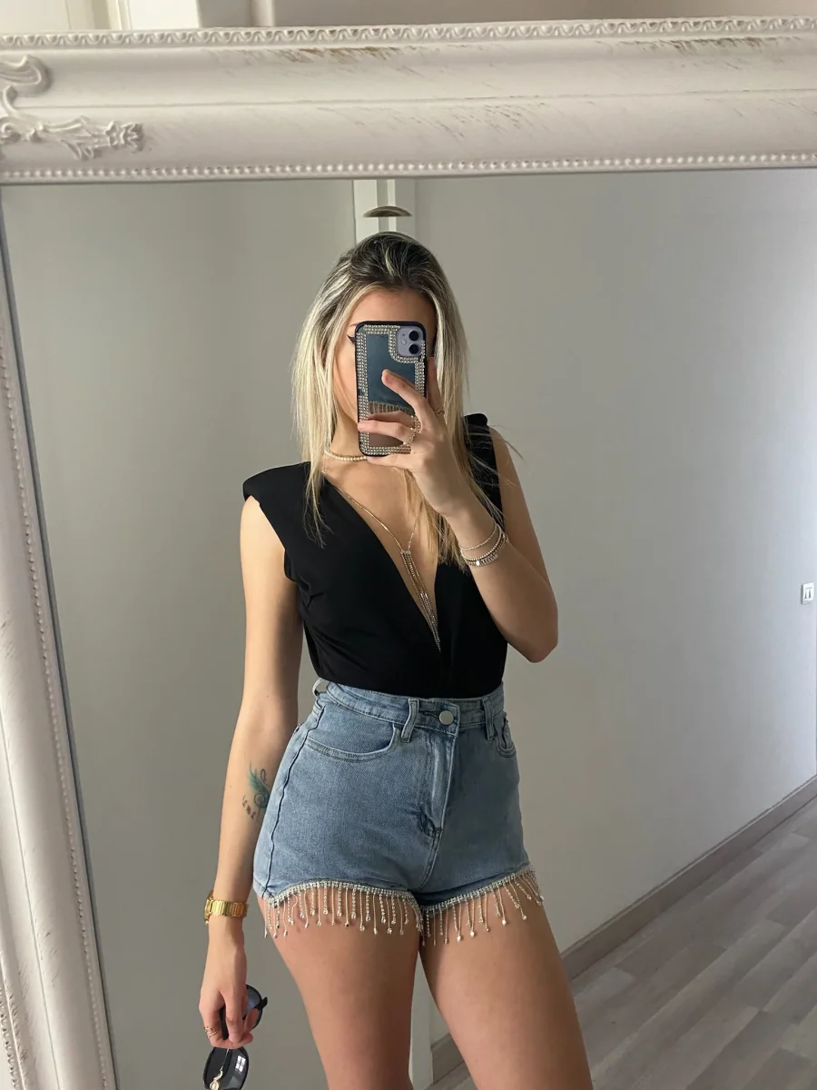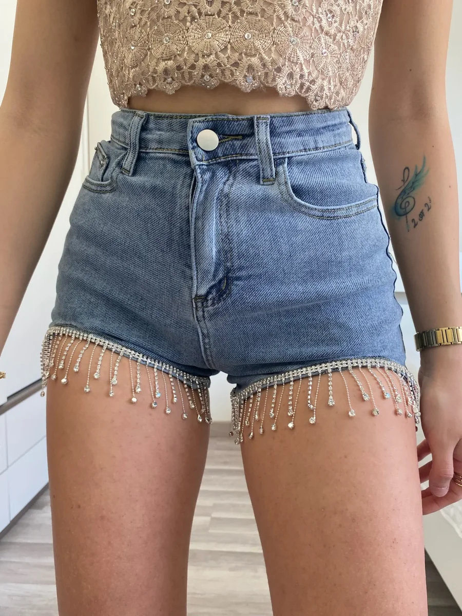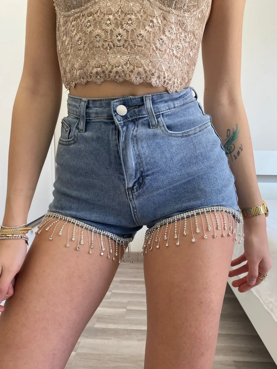 Short in tessuto leggermente elasticizzato con frange nel sotto con strass argento