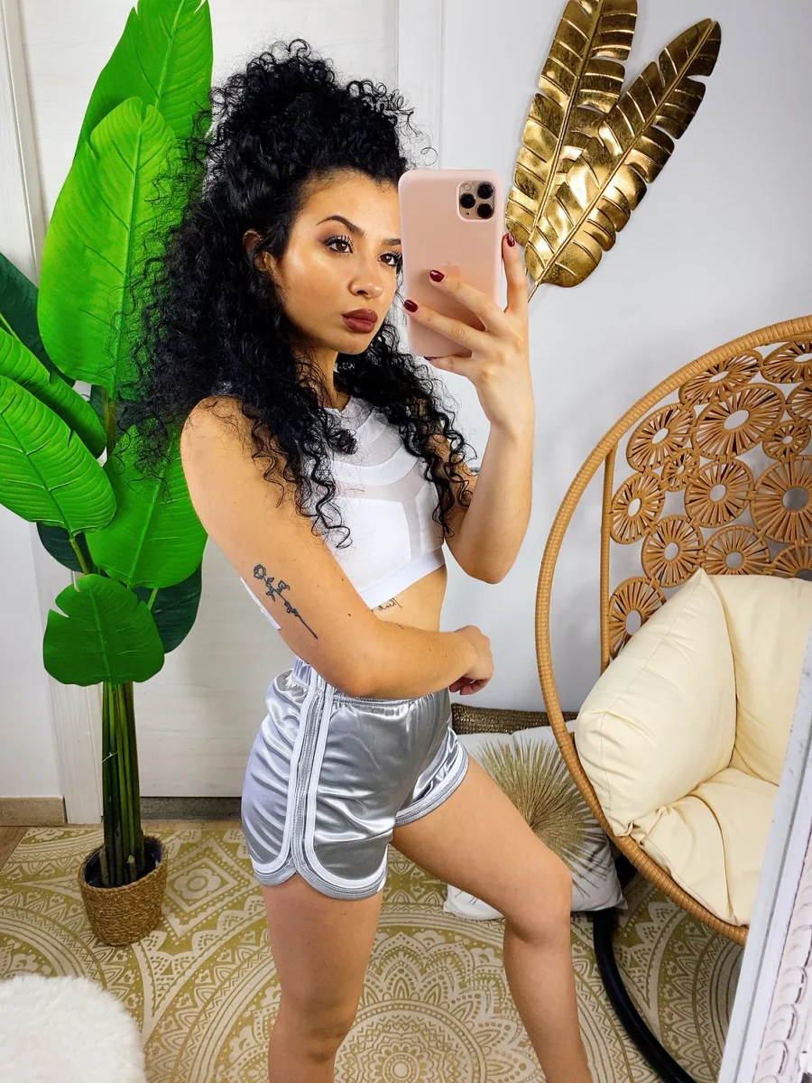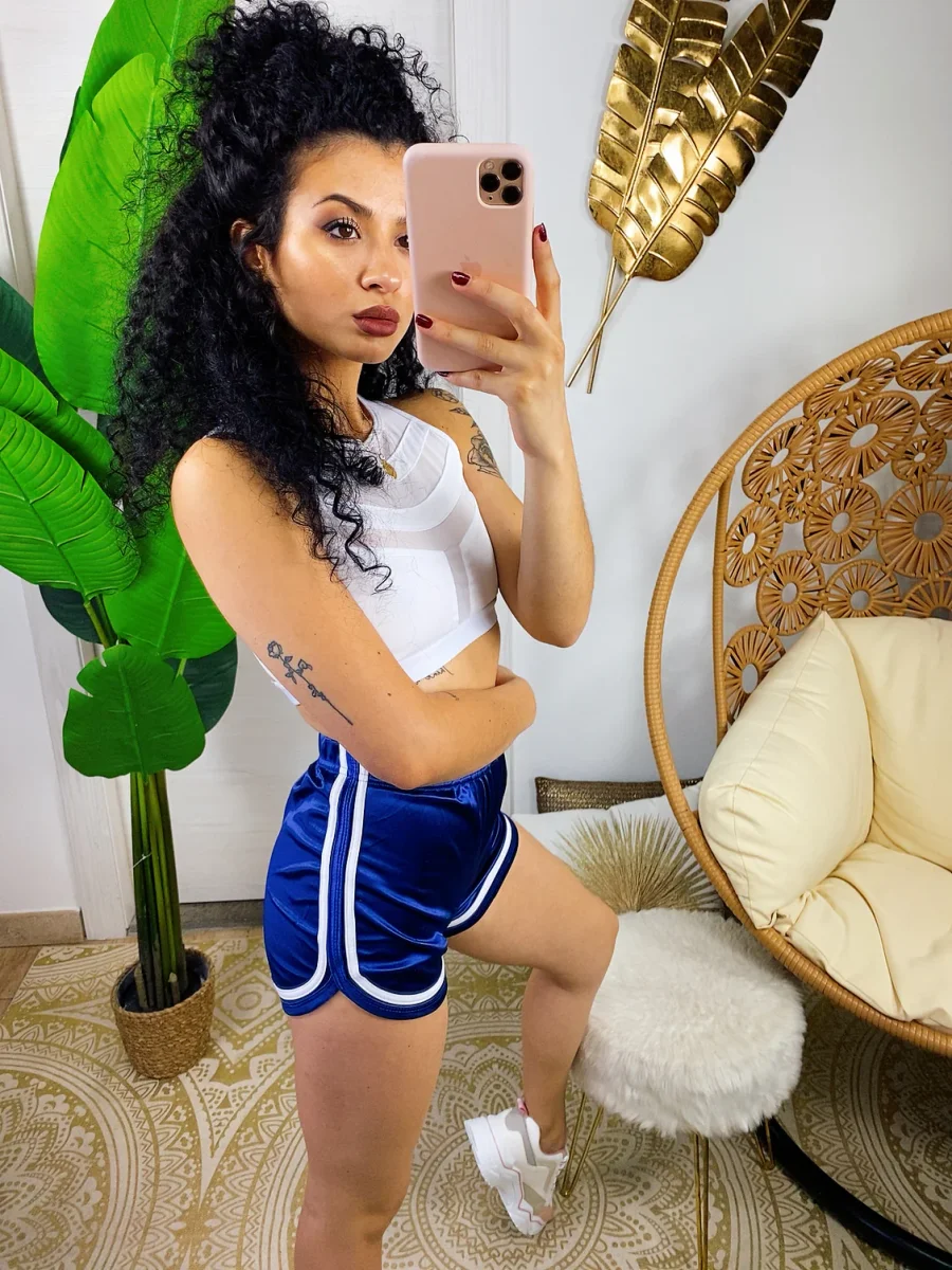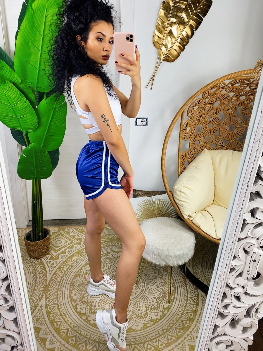 Short in raso con strisce bianche. Elasticizzato ma dalla vestibilità molto molto piccola