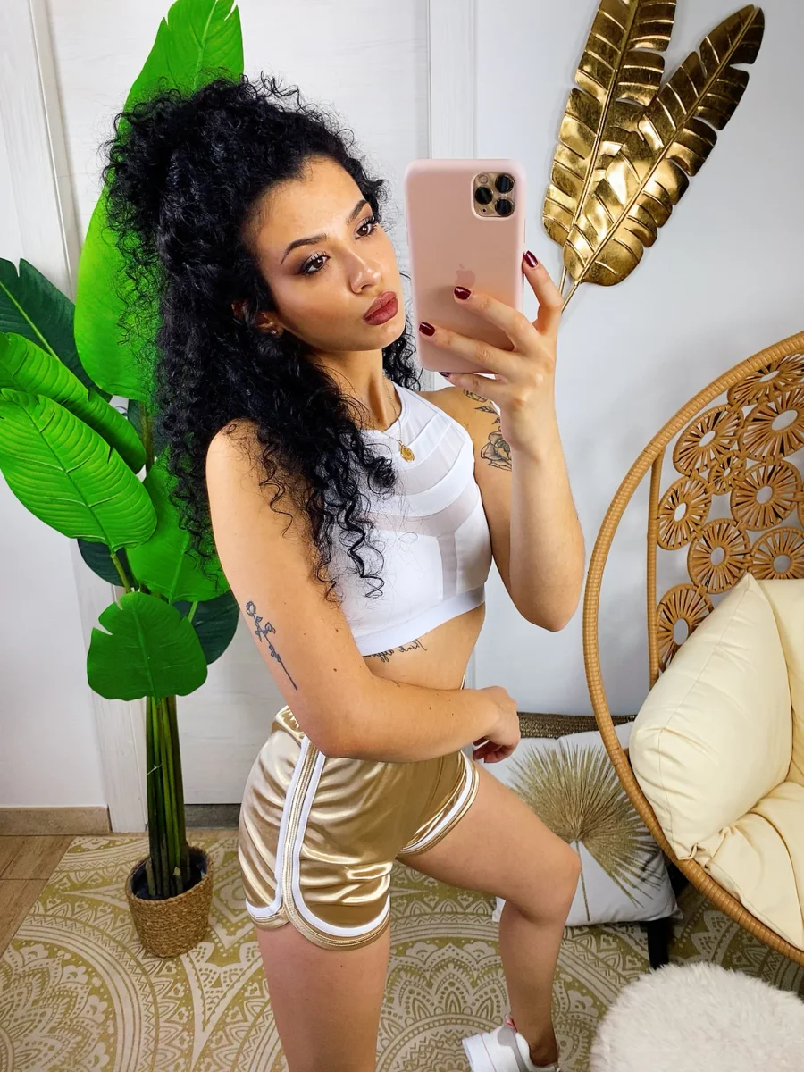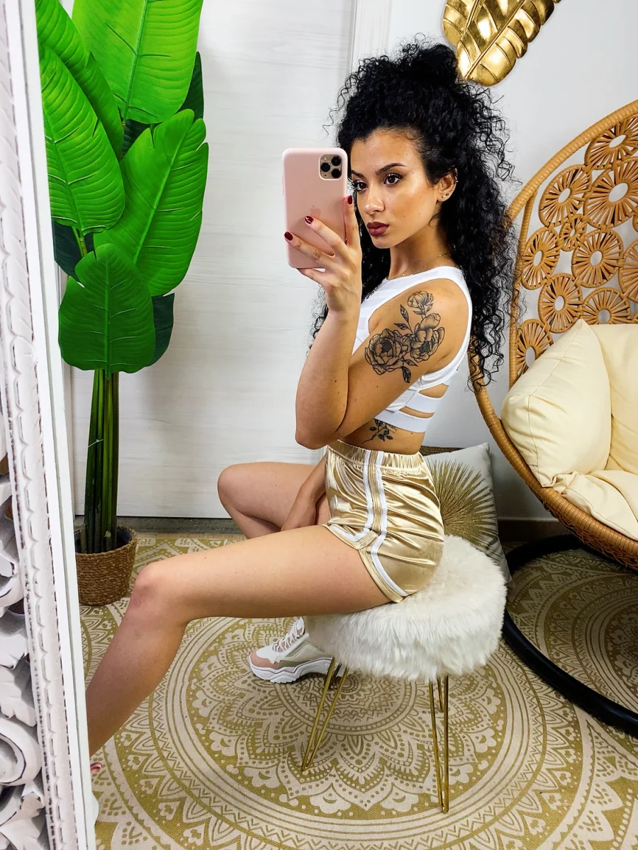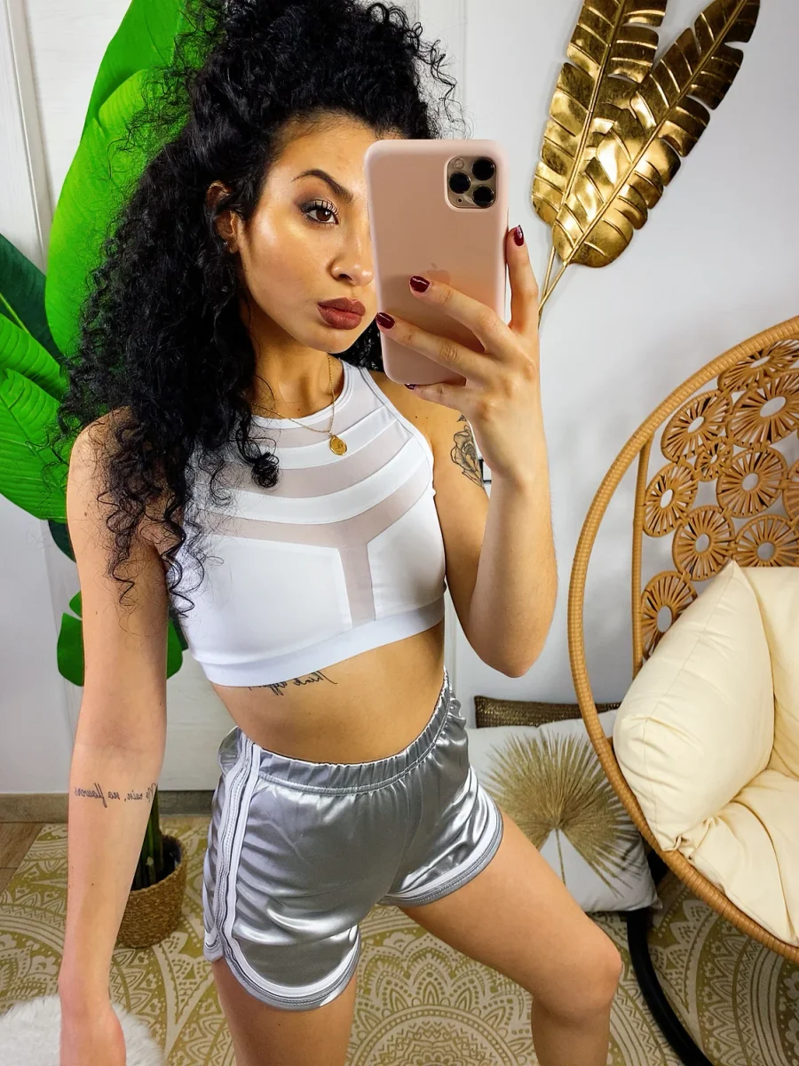 Short in raso con strisce bianche. Elasticizzato ma dalla vestibilità molto molto piccola