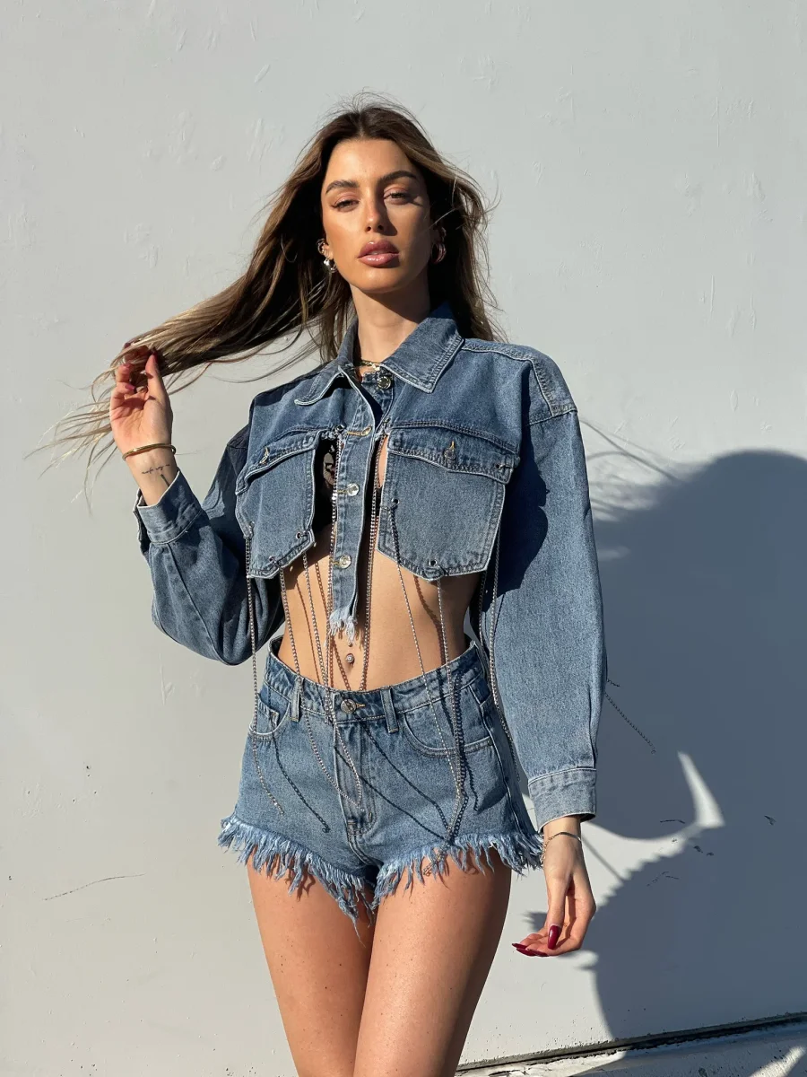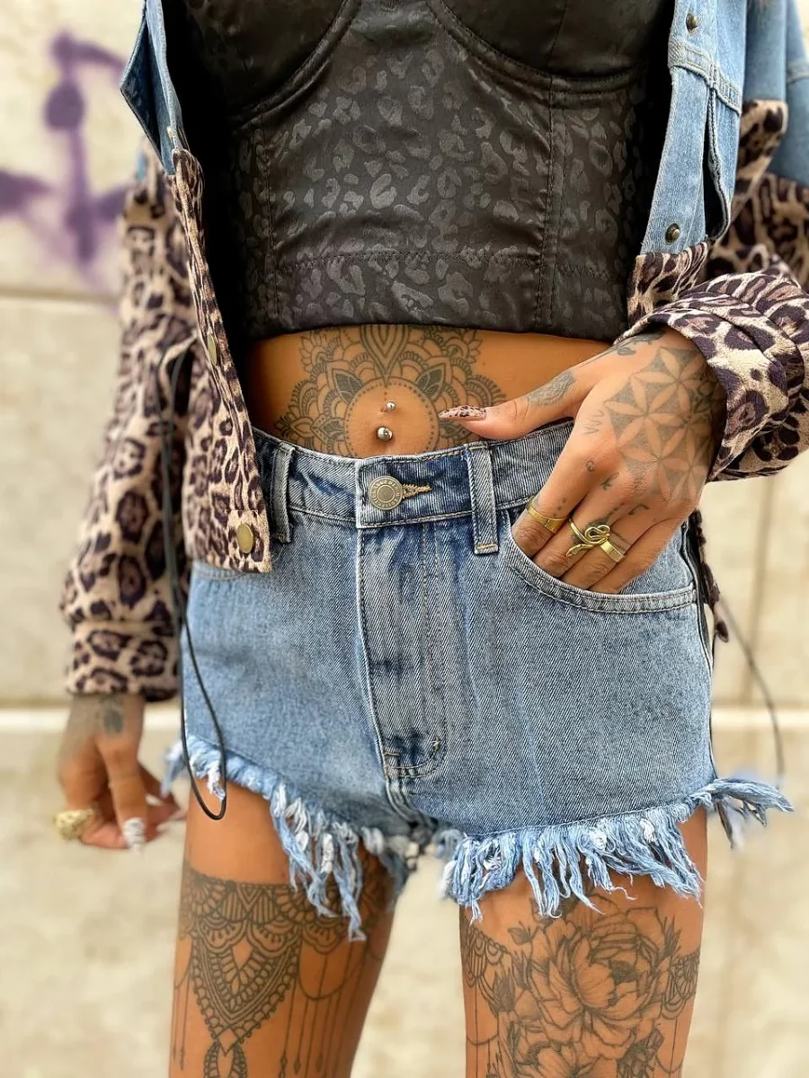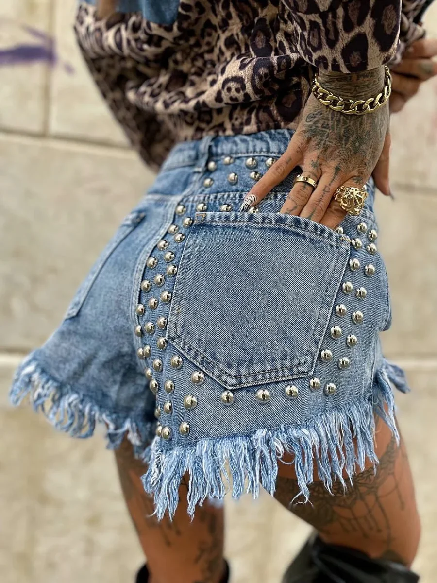 Short in jeans con borchie sulla parte destra. Vestibilità regolare.