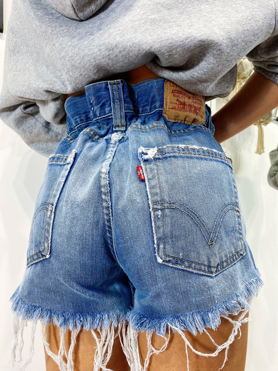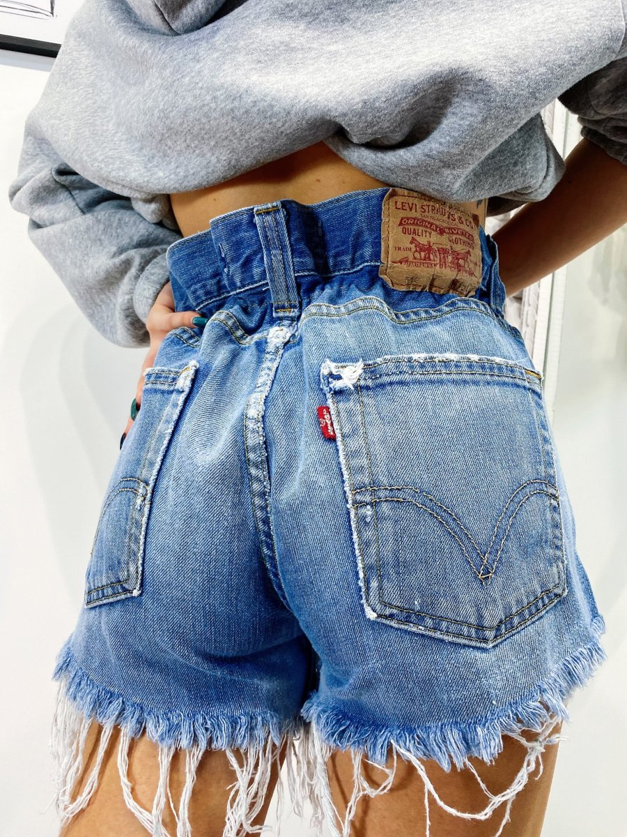 Short Vintage Levi’s alta qualità con strappi. Jeans vintage lavorati a mano Considerati pezzi unici poichè interamente Personalizzati. Lievi differenze rispetto alla foto ne denotano l’unicità e la sua completa lavorazione handmade.