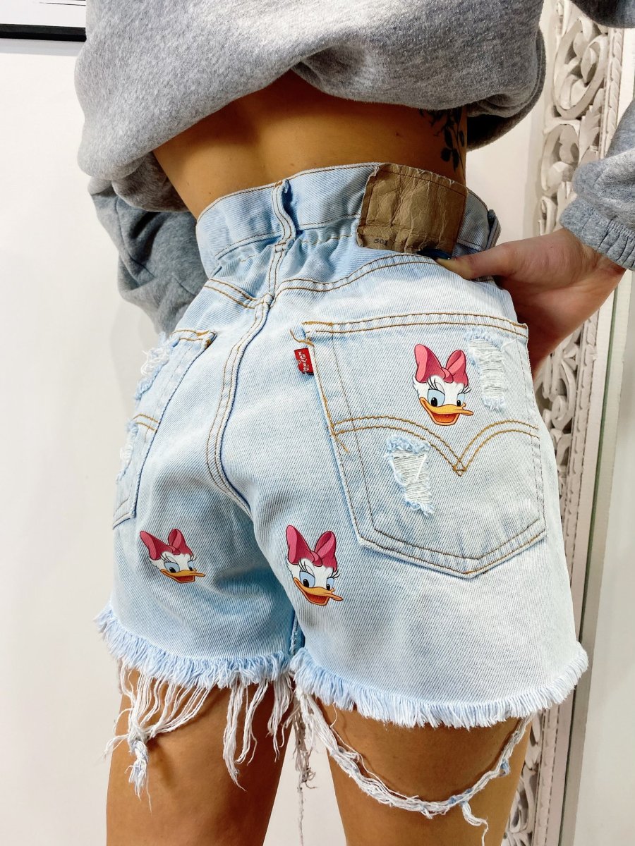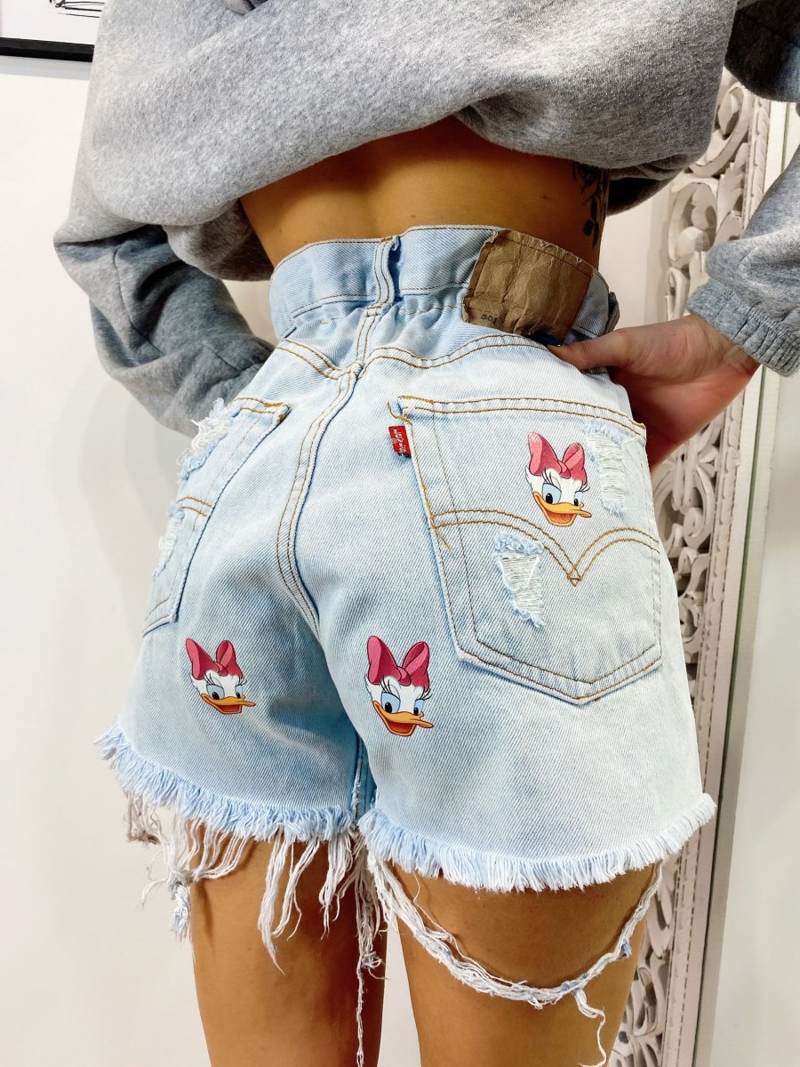 Short Vintage Levi’s alta qualità con strappi e stampa paperina.