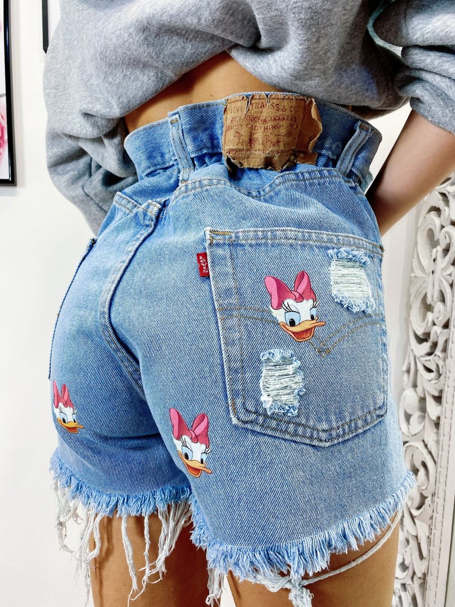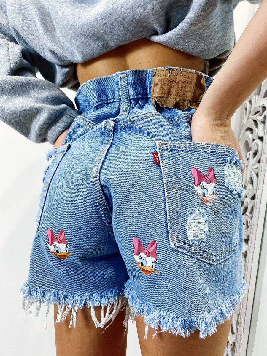 Short Vintage Levi’s alta qualità con strappi e stampa paperina.