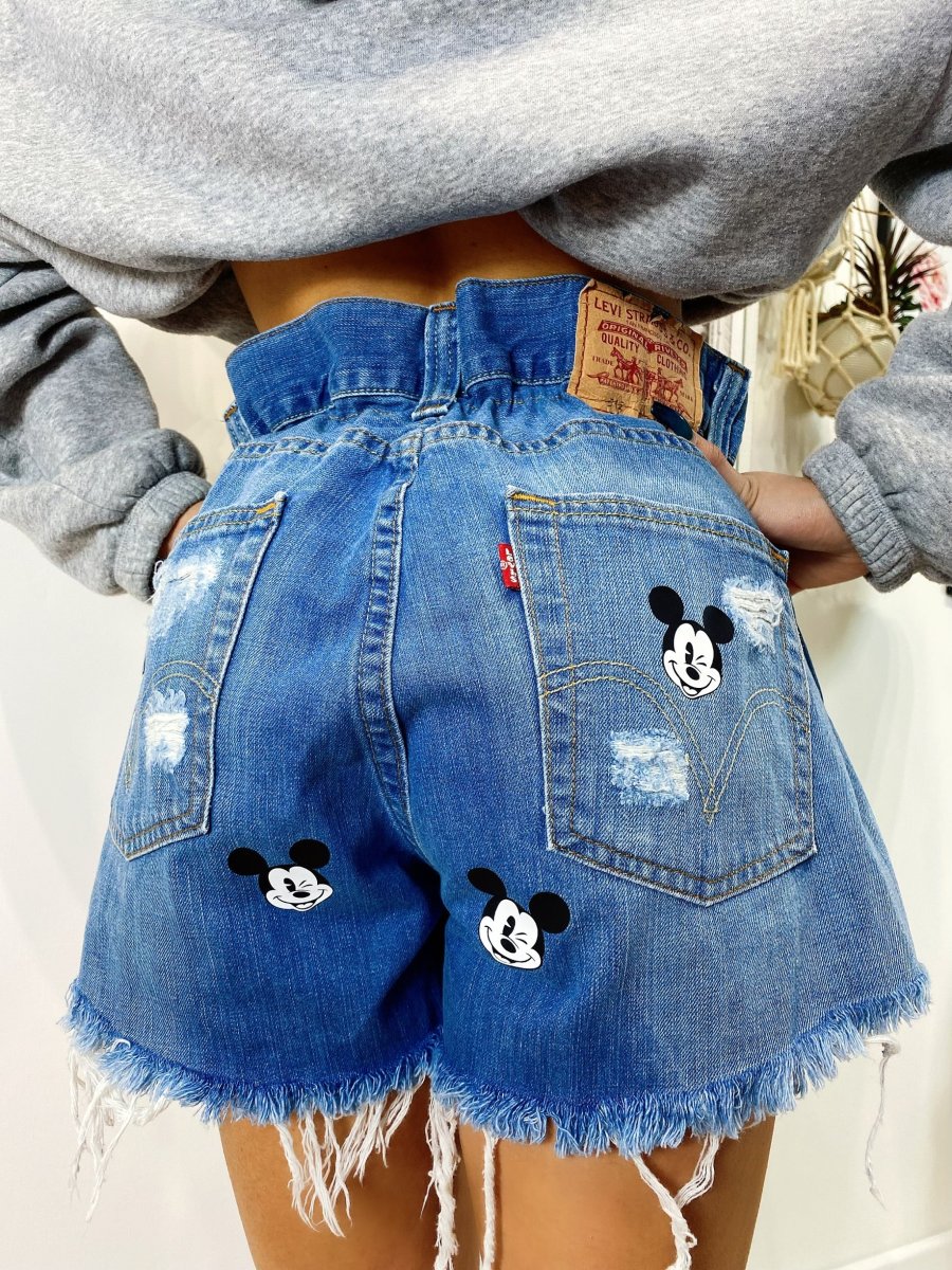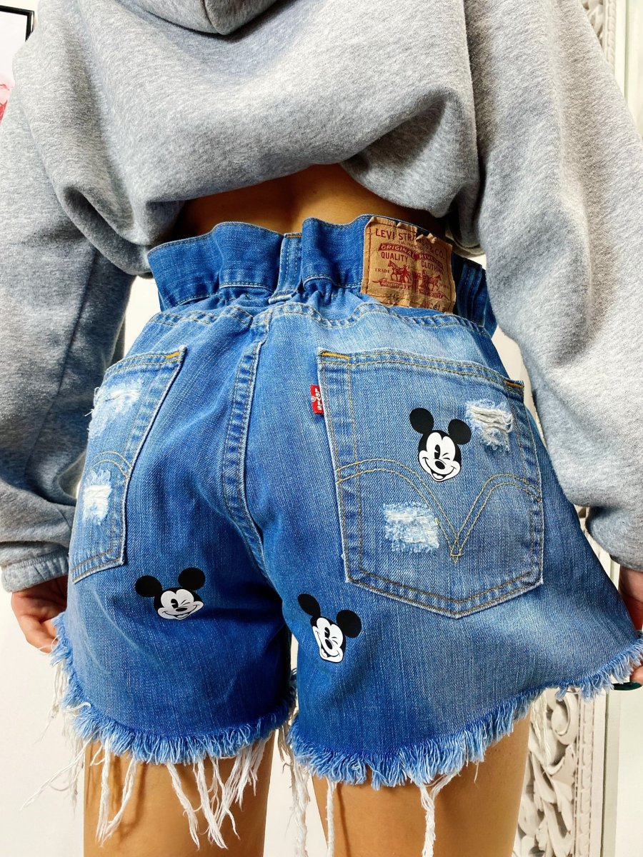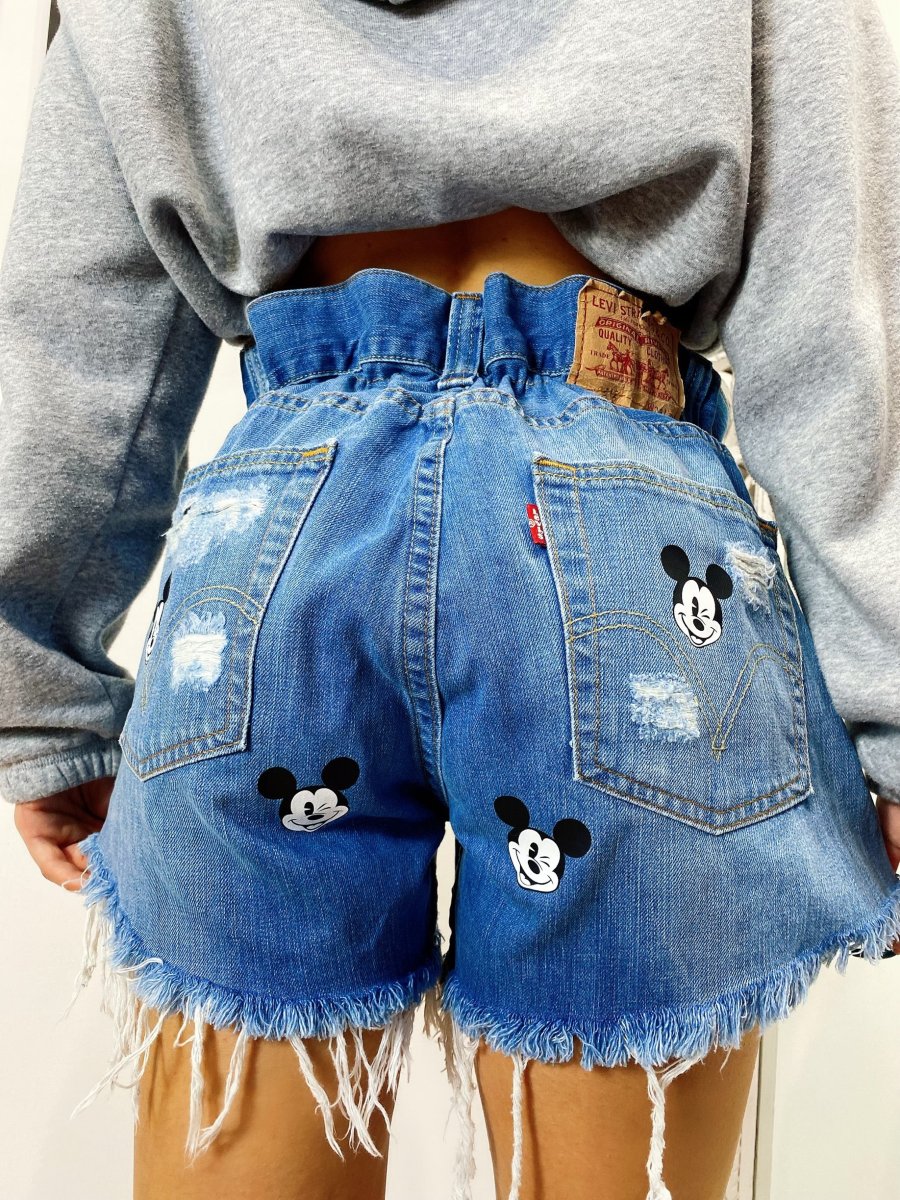 Short Vintage Levi’s alta qualità con strappi davanti e leggermente dietro, stampa topolino bagno colore medio.